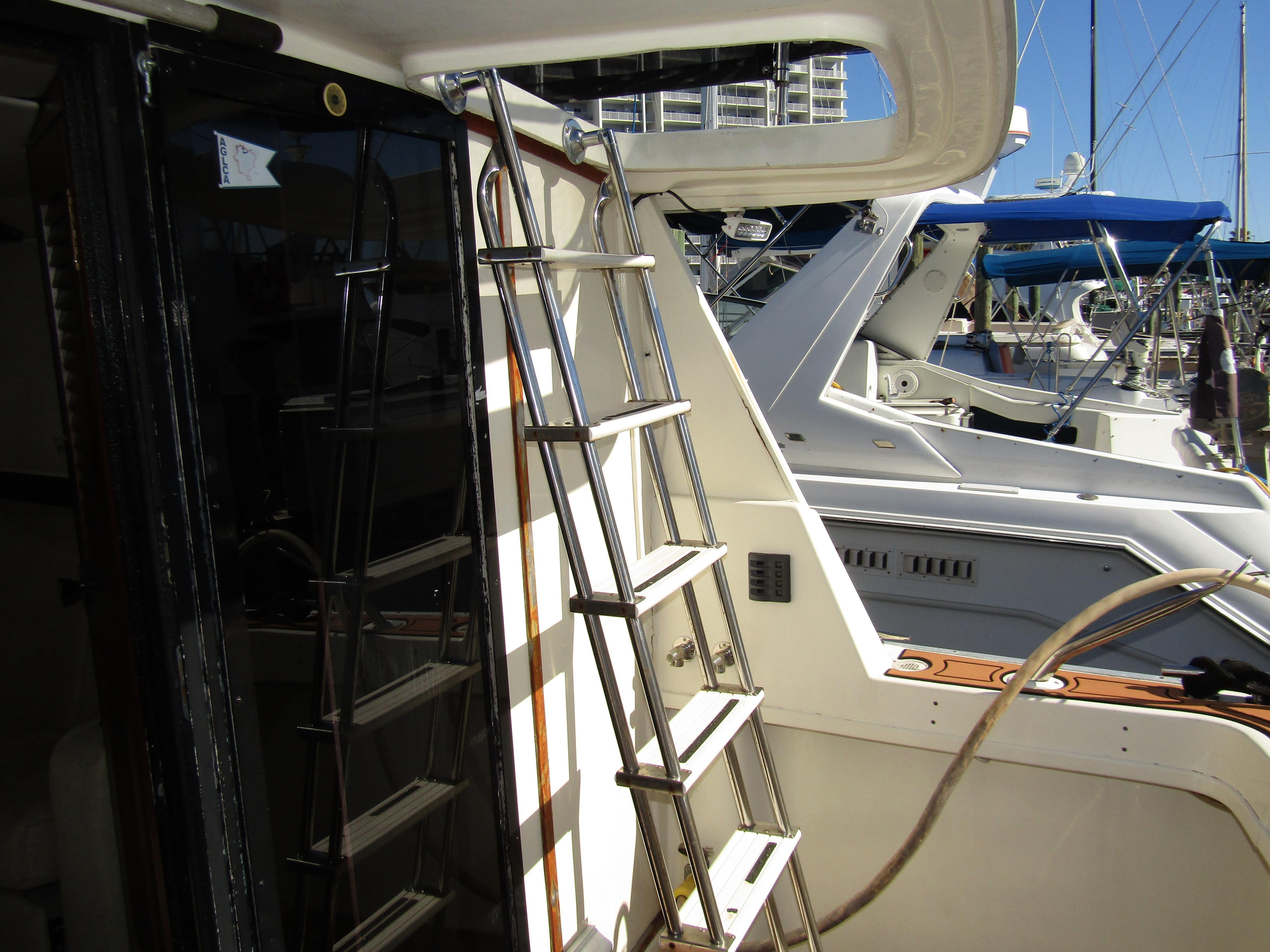 The aft deck has a ladder leading to the upper deck as well as a door in the transom for easy access to the swim platform. A large sliding glass door opens into the main salon.