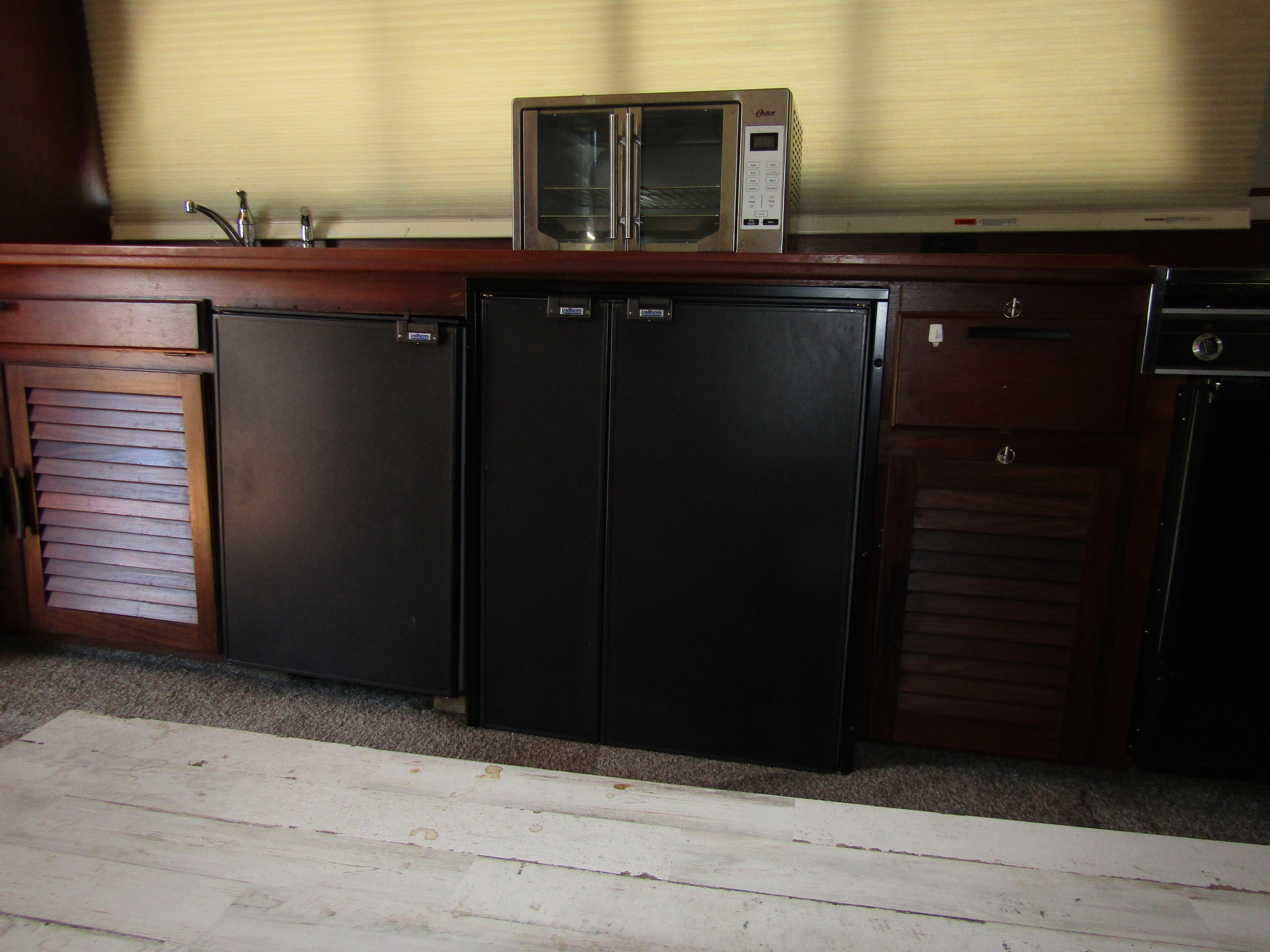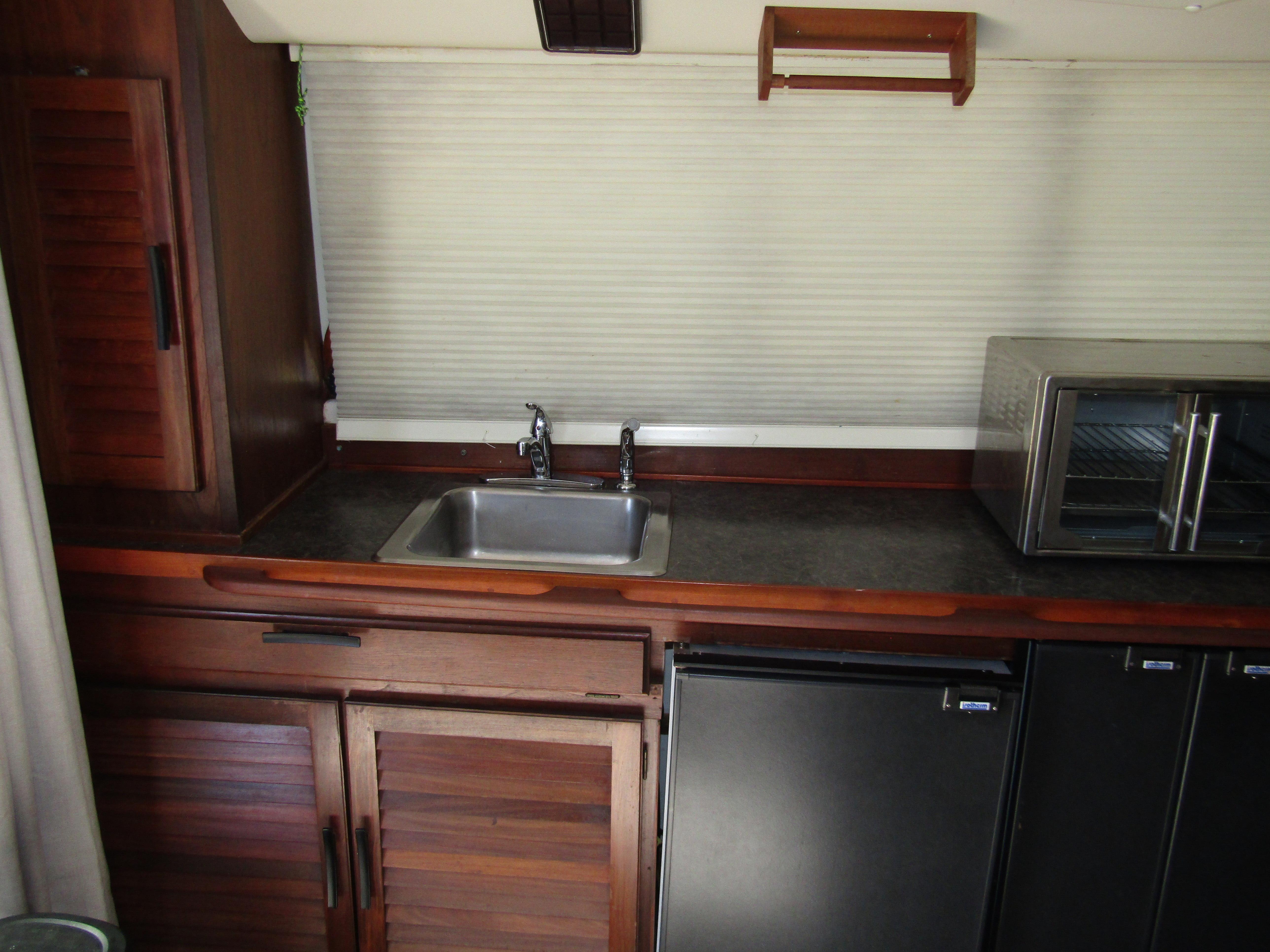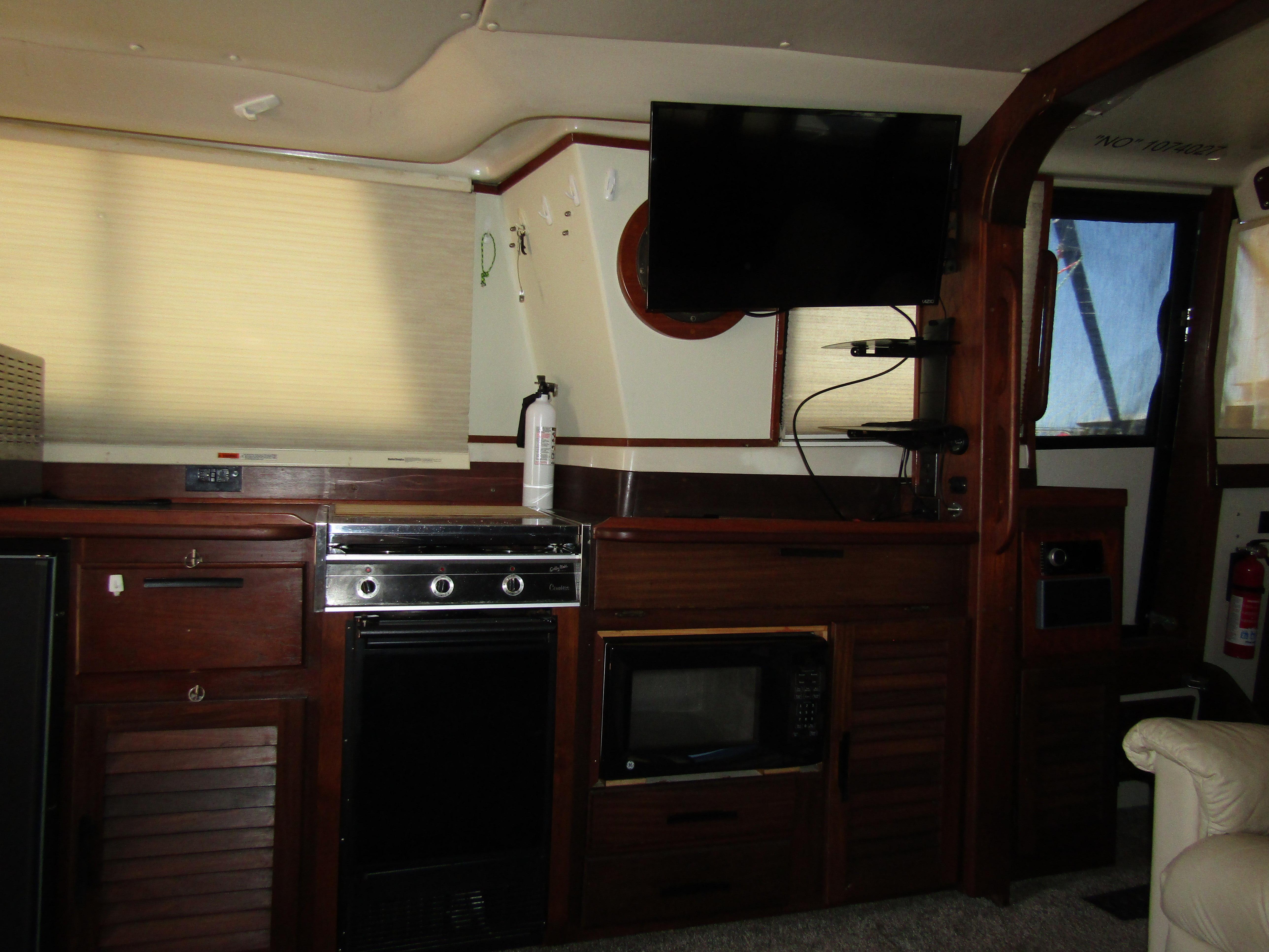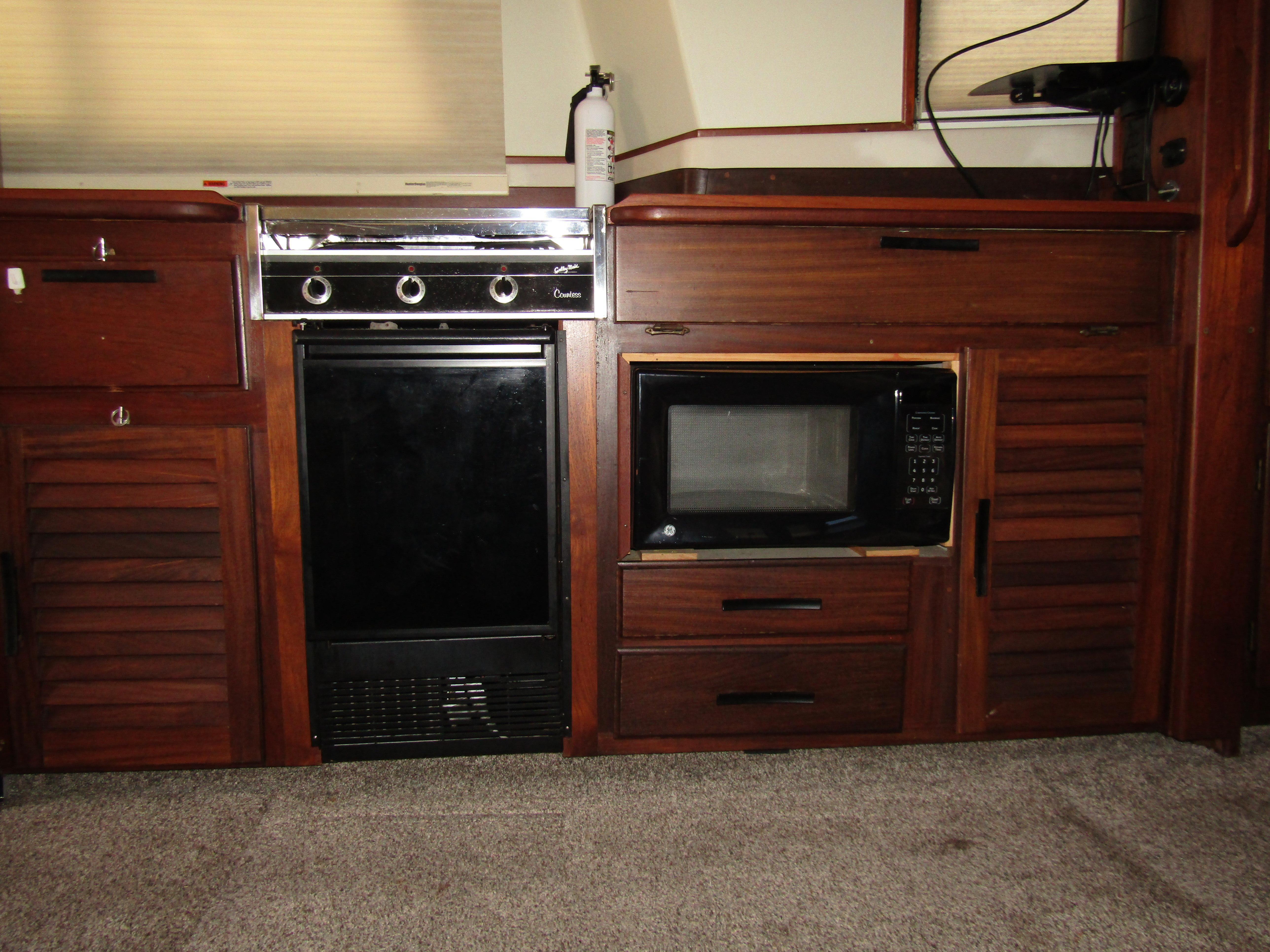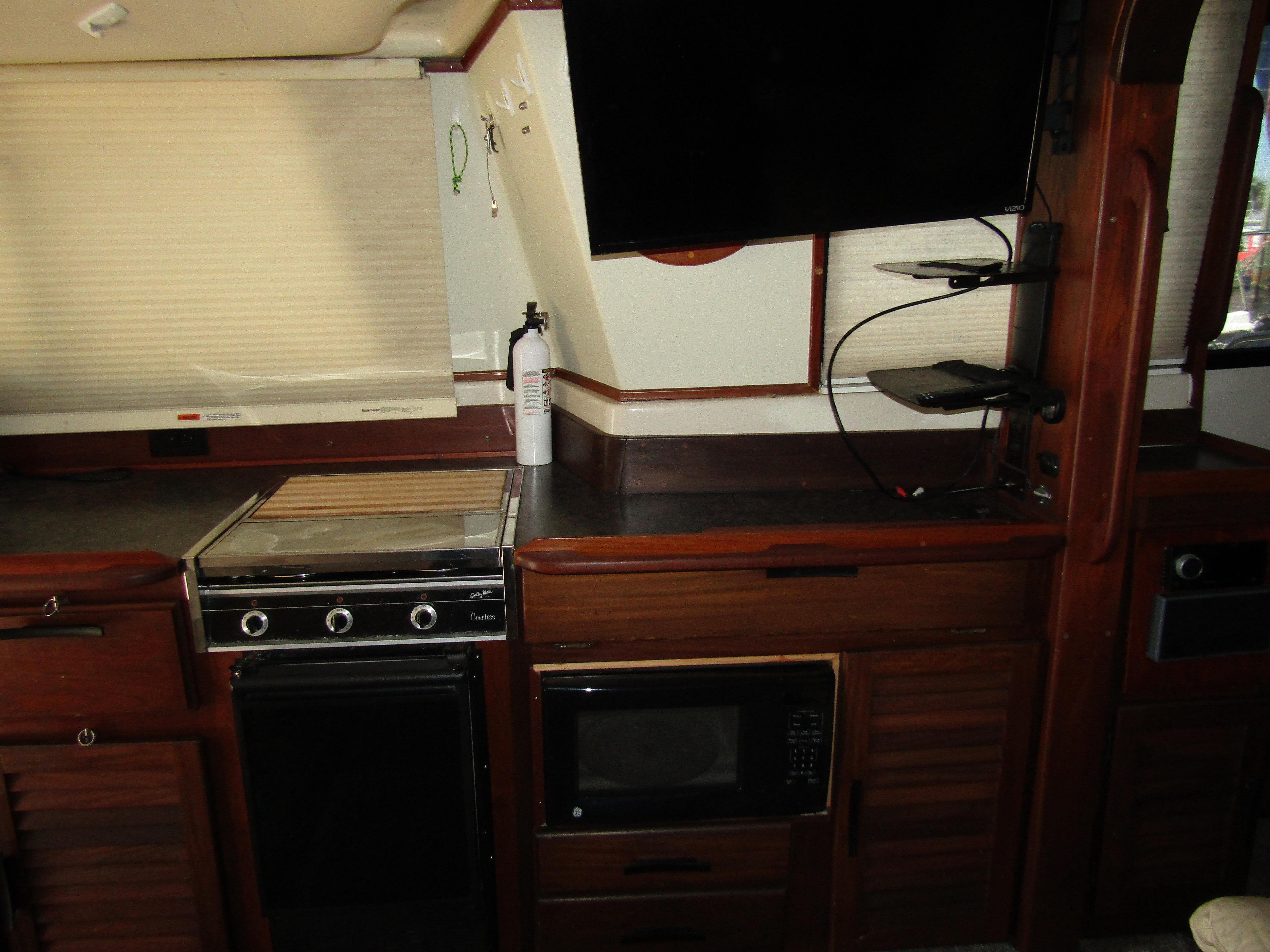 Currently, the galley is located along the port side and features a separate refrigerator and freezer, stove with oven, a microwave and ample counter space.