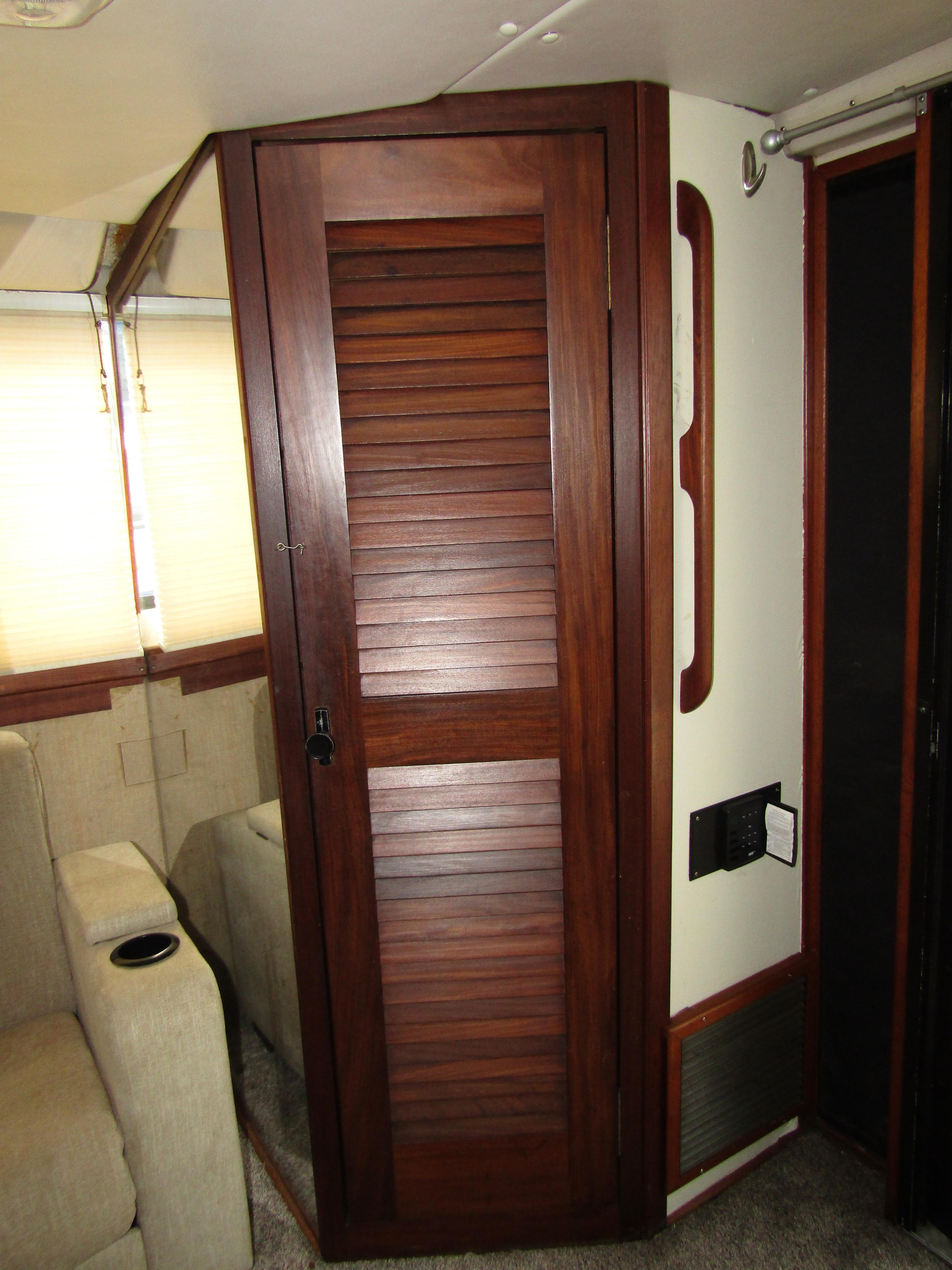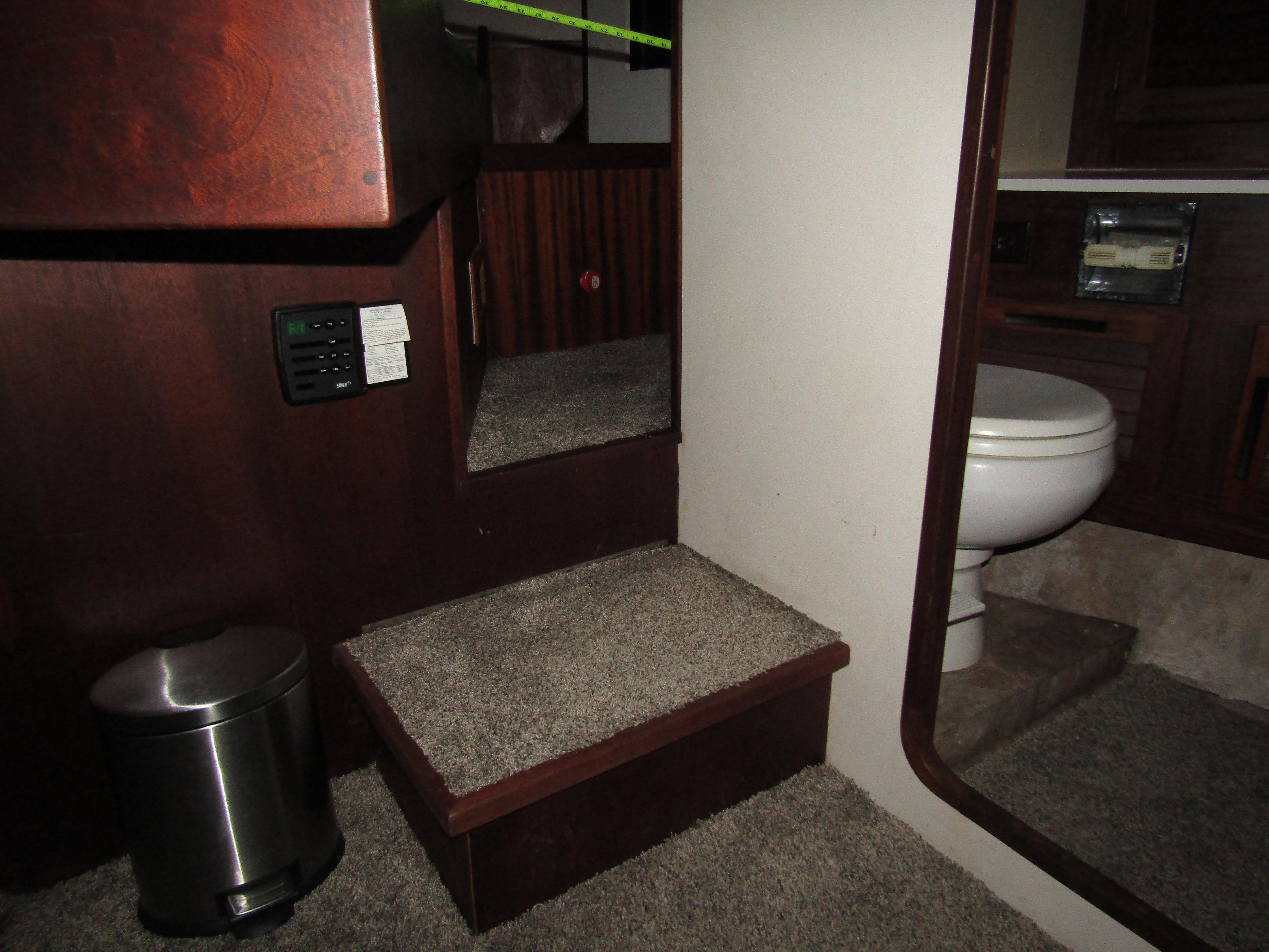 The starboard side of the main salon has a day head aft. Moving forward is a large custom cabinet with 4 large drawers and a pull-out bunk below with a Sleep Number mattress. Two comfortable reclining lounge chairs face the flat screen TV on the port side.