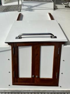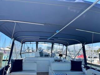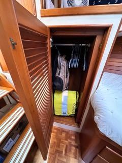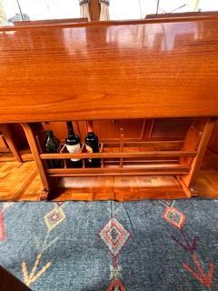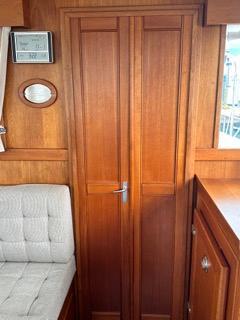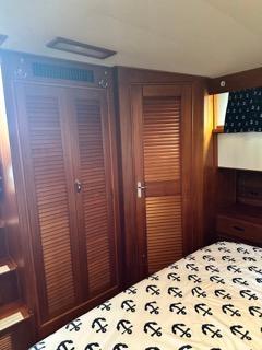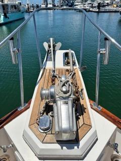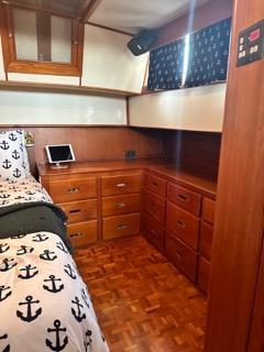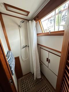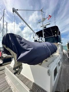 FRP Hull with Cored Topsides and White Gel Coat Plywood Bulkheads bonded to hull Cored Molded FRP Longitudinal Stringers run Fore & Aft Teak Covered Decks Teak Toe Rails Teak Swim Platfrom Teak Swim Ladder Primary Anchor : Delta Fastset Anchor with Chain & Line Secondary Anchor: CQR Anchor with Chain & Line Lofrans 12V Windlass with Helm Control Stainless Steel Cleats Stainless Steel Scuppers Stainless Deck Fills for Fuel and Water Davit with Strong Arm 120V 8A Electric Winch Retractable Mast Covers For Tender, Railings, and Exterior Upholstery Window Screens Bottom & Running Gear: Two Aquamet 19 S/S shafts wtih line cutters Two 28 x 22.5 three blade props Single Arm V Strut each side 9" x 18" FRP Spade type rudders Dripless Propeller Shaft Seals Transducer Vetus Bow Thruster Bottom Painted - Jan 2024 Mechanical Equipment
