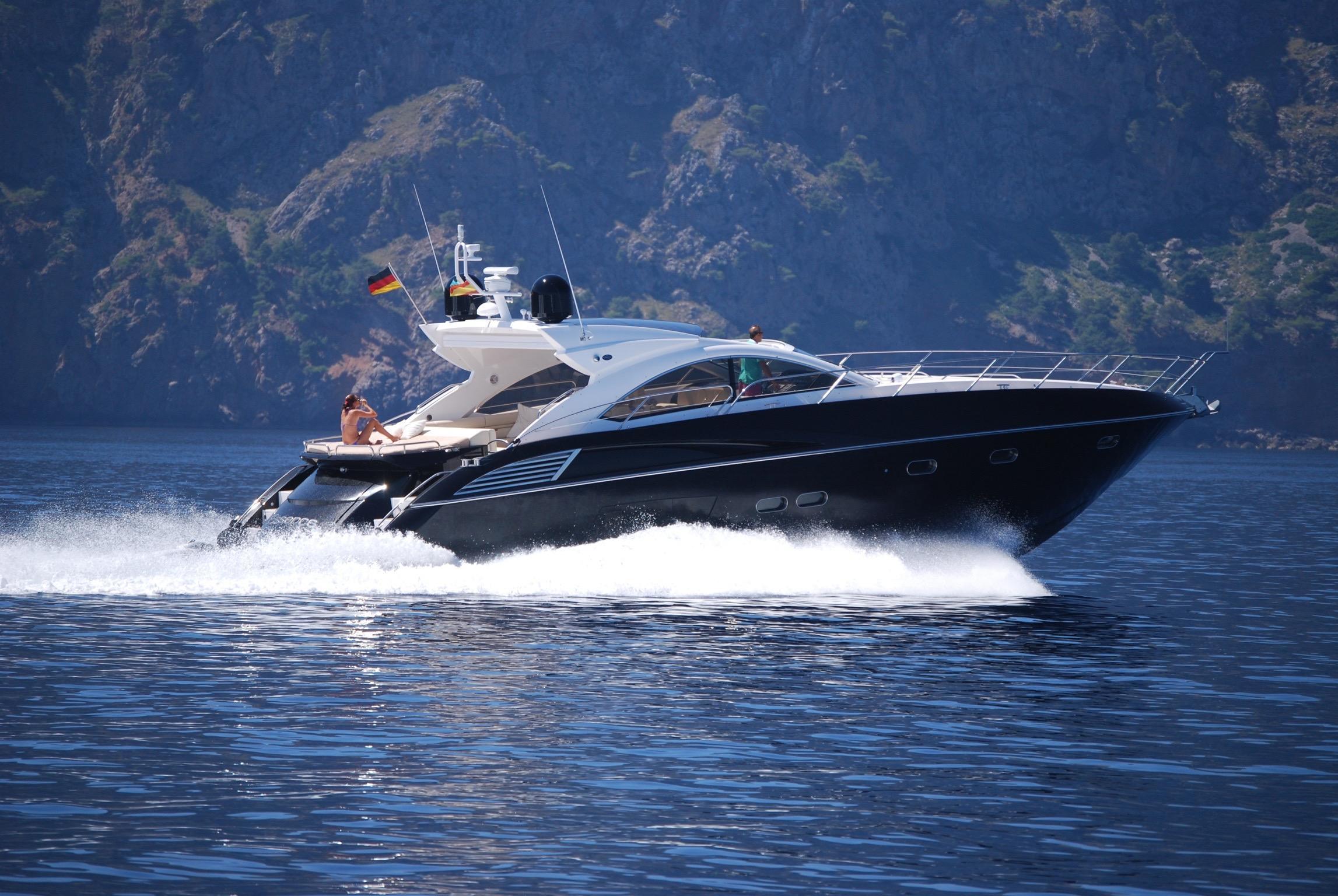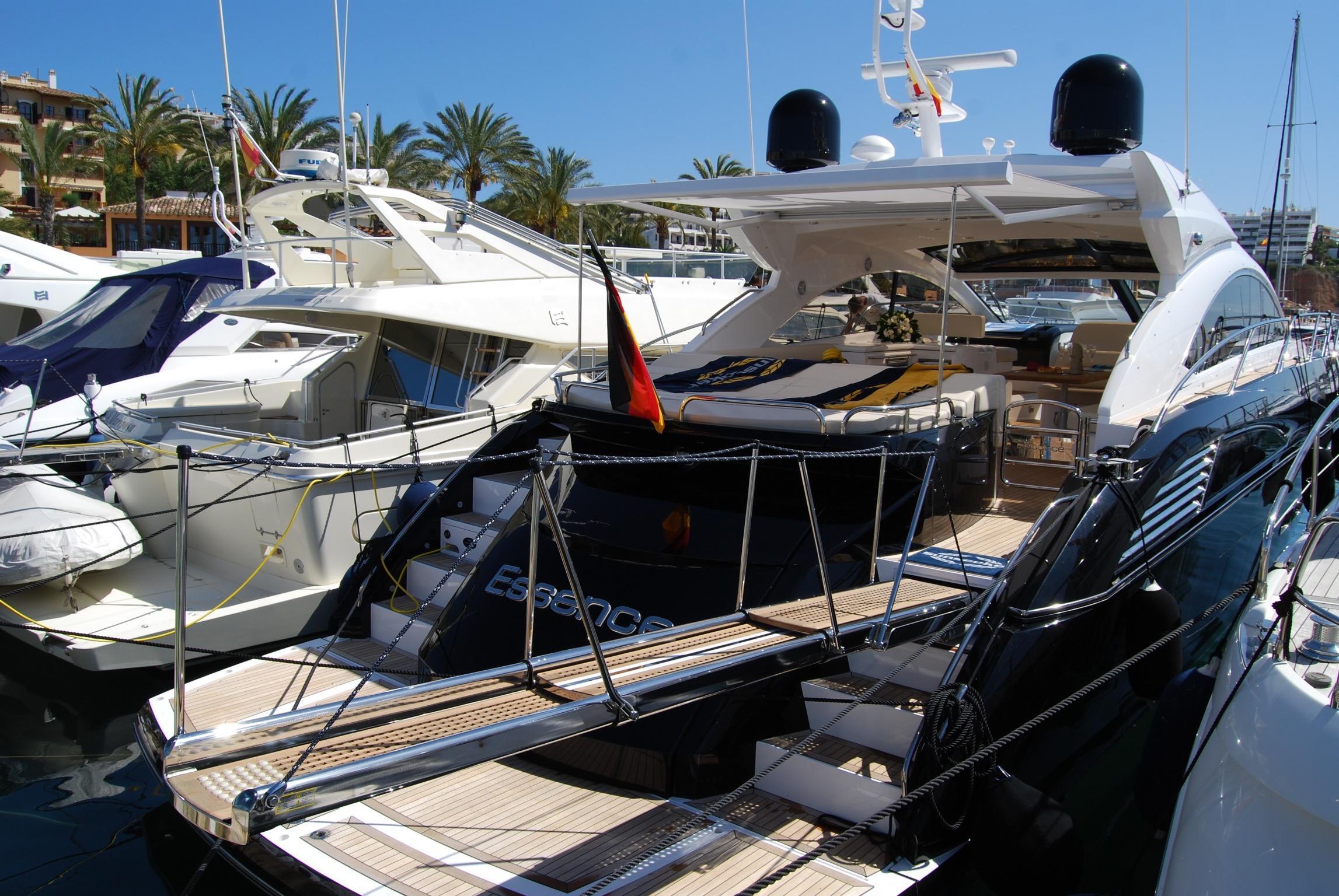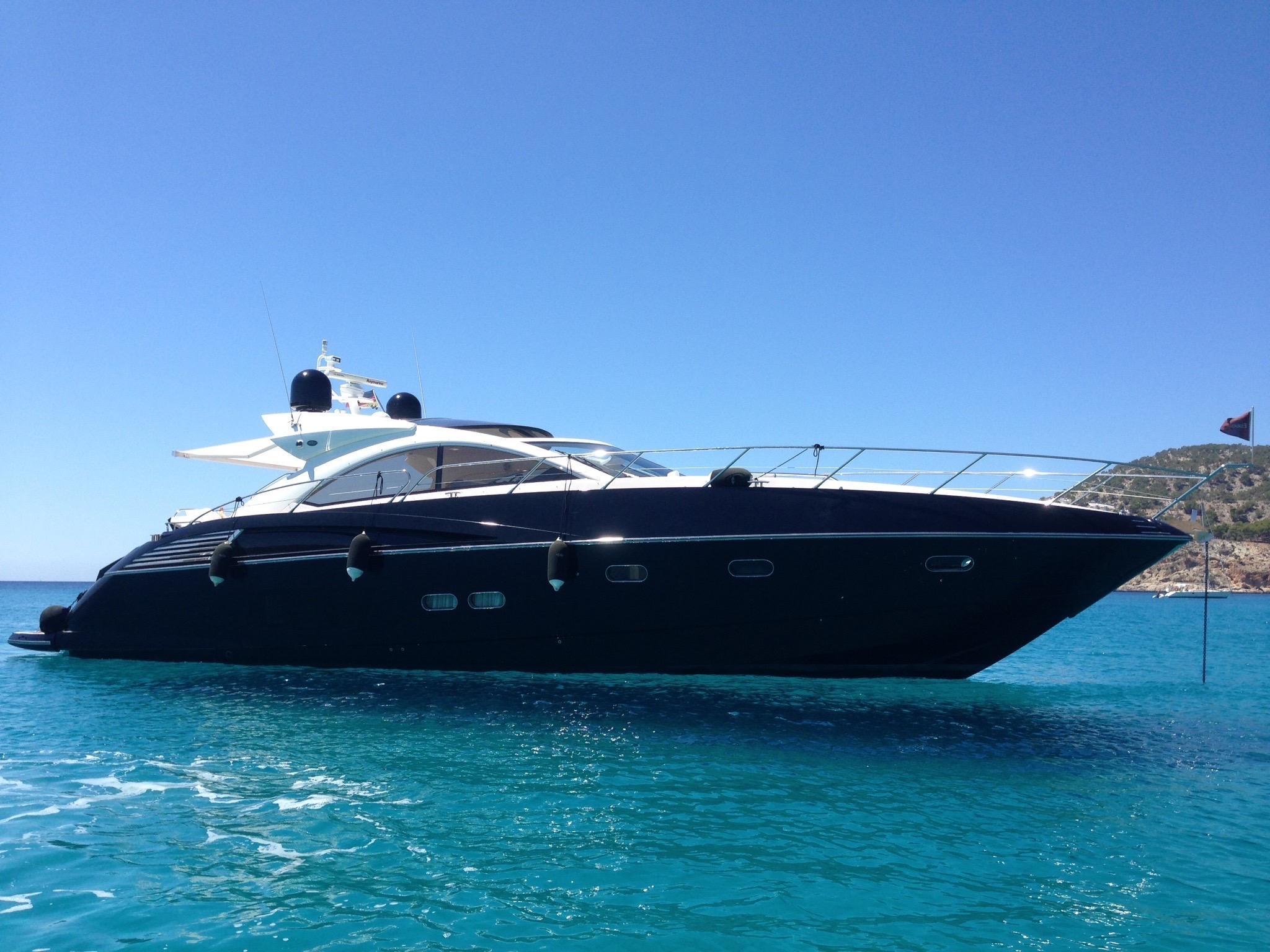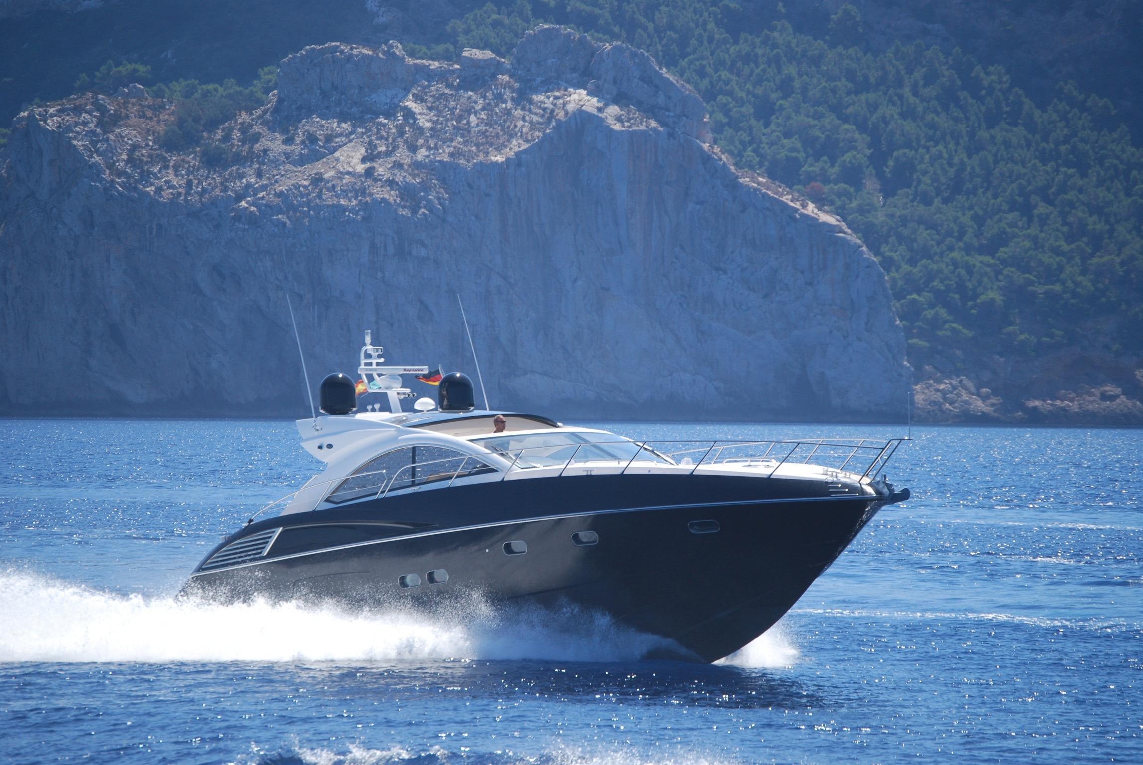 This 40-knot speedster is as much about performance as it is about comfort. A high performance hull belies the space onboard, where accommodation is optimised. Both open and hard top versions are available. And as well as a choice of engines, theres also an option in drive systems. The more compact pod drive saves engine room space enabling an enlarged master suite. Luxury is extended throughout with a large main deck area providing ample space for dining and entertaining. Large sunpads are positioned fore and aft and the garage provides ample storage for tender or jet ski. Down below the saloon and three guest cabins all offer a typically high level of comfort and feature their own entertainment systems. Disclaimer
