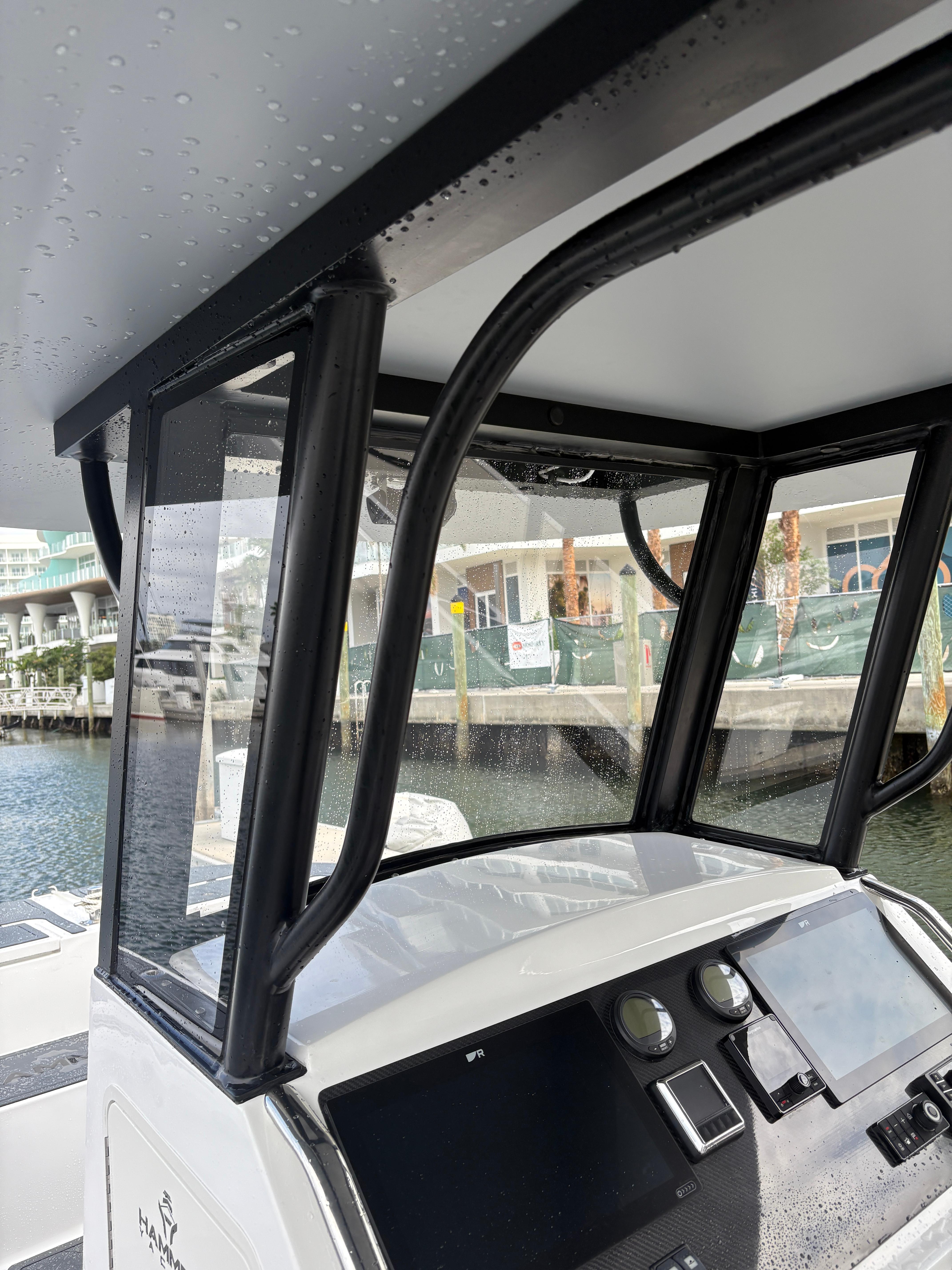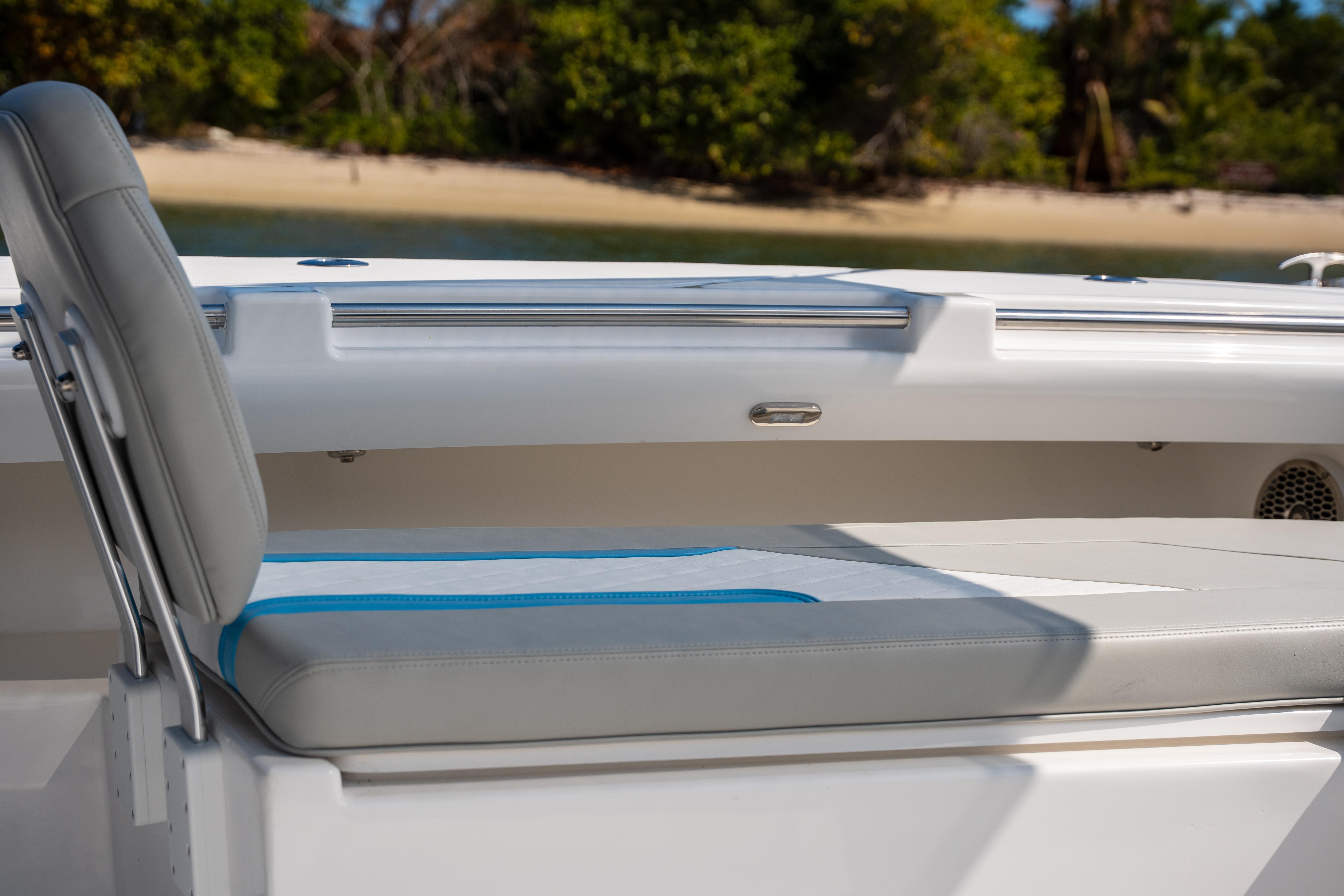 The HammerCat 30 offers an oversized epoxy composite hardtop, weighing just 150 Lbs., which protects the helmsman and guest from the sun / rain. Two helm-seats, two seats forward of the console and an aft-bench offer seating for your guests while still having plenty of space for fishing or lounging.