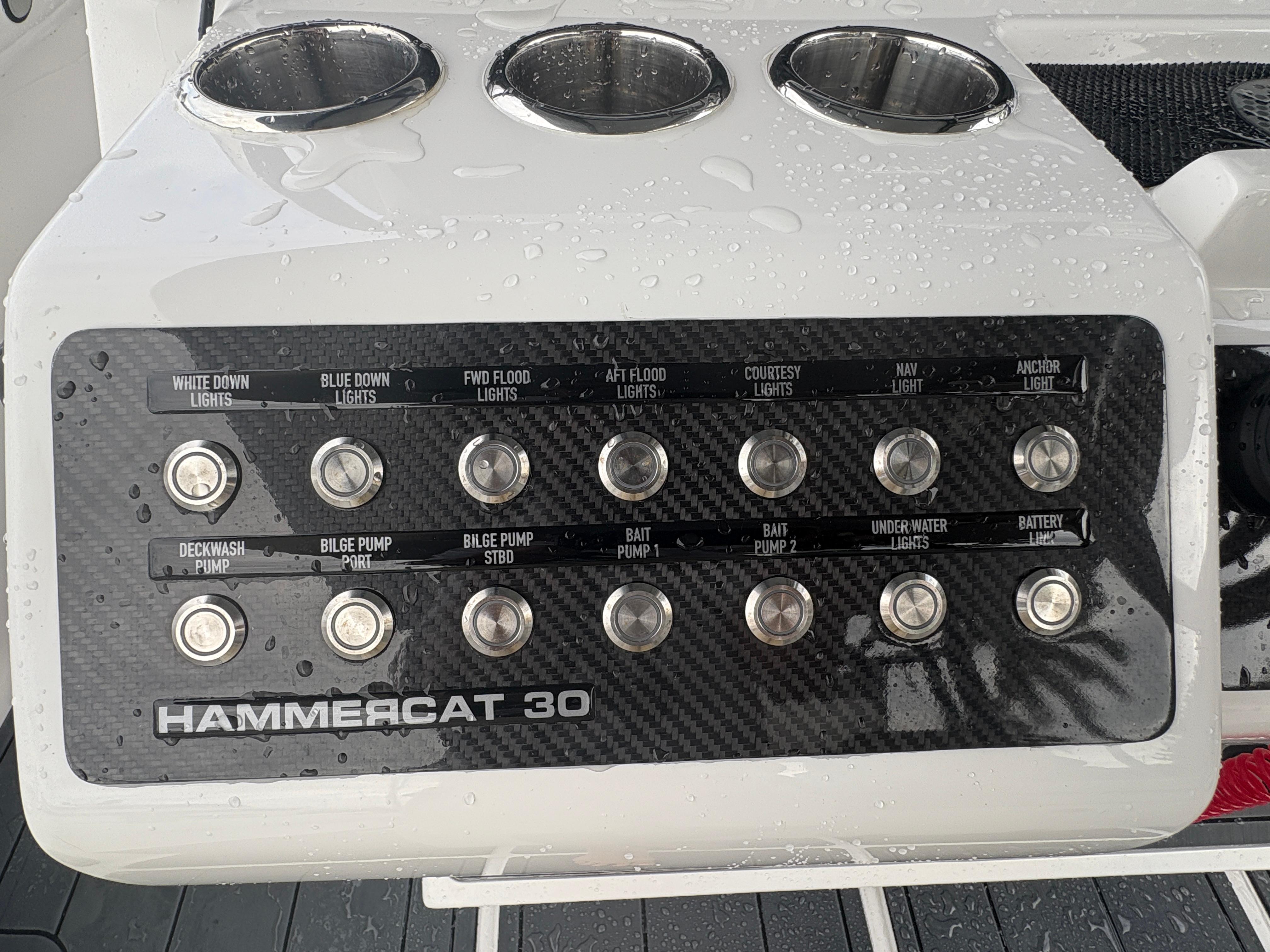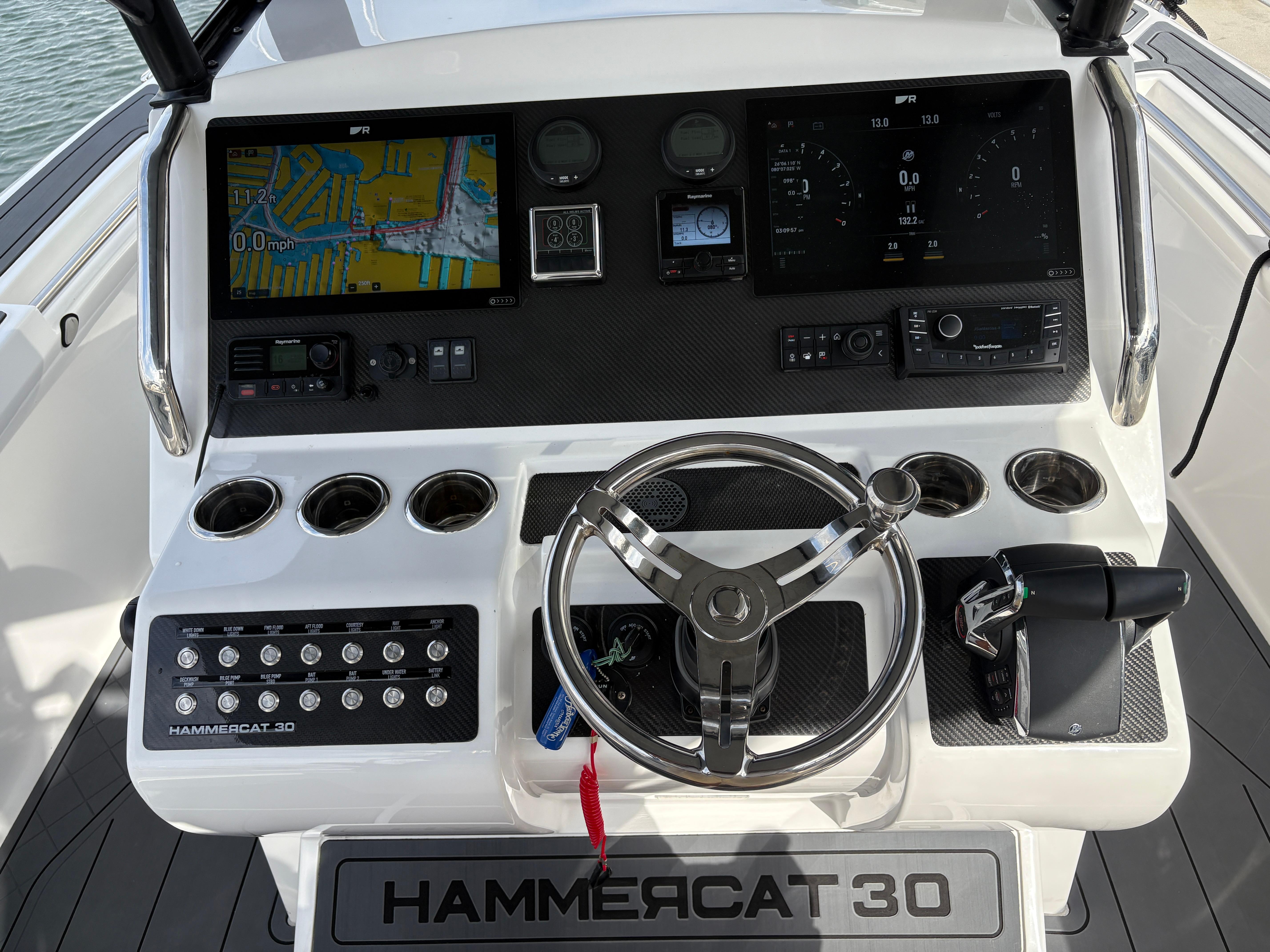The HammerCat 30 features 2 x 12” Raymarine Axiom MFD’s, autopilot, quantum radar, VHF, 1kW in hull transducer as well as a transom transducer as the standard navigation package. The sound system by Rockford Fosgate features 4 x 300W loudspeakers and can be upgraded with subwoofers and amplifiers according to your choice.