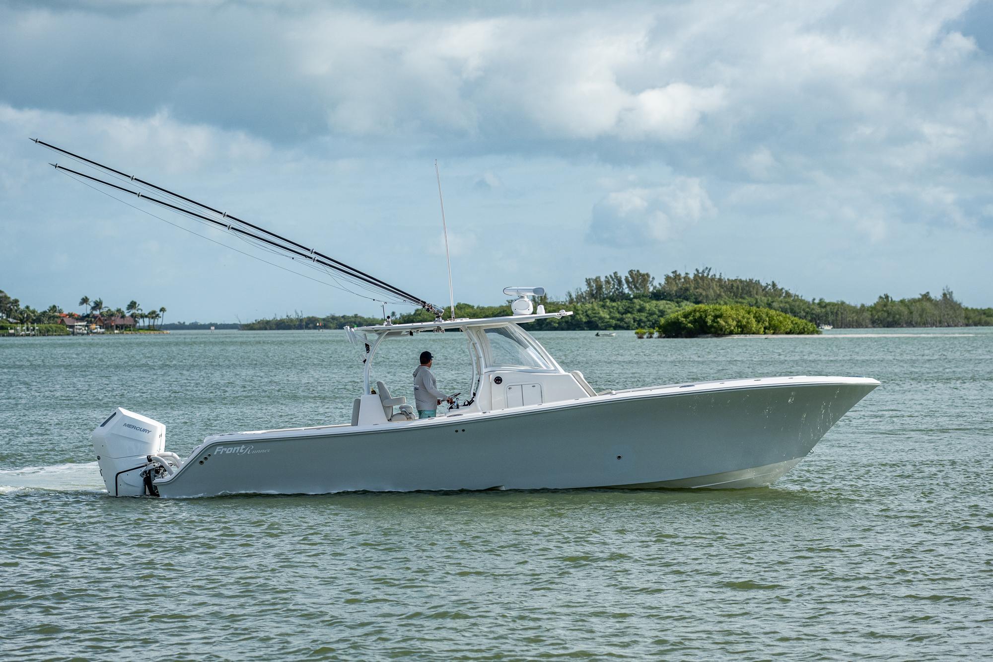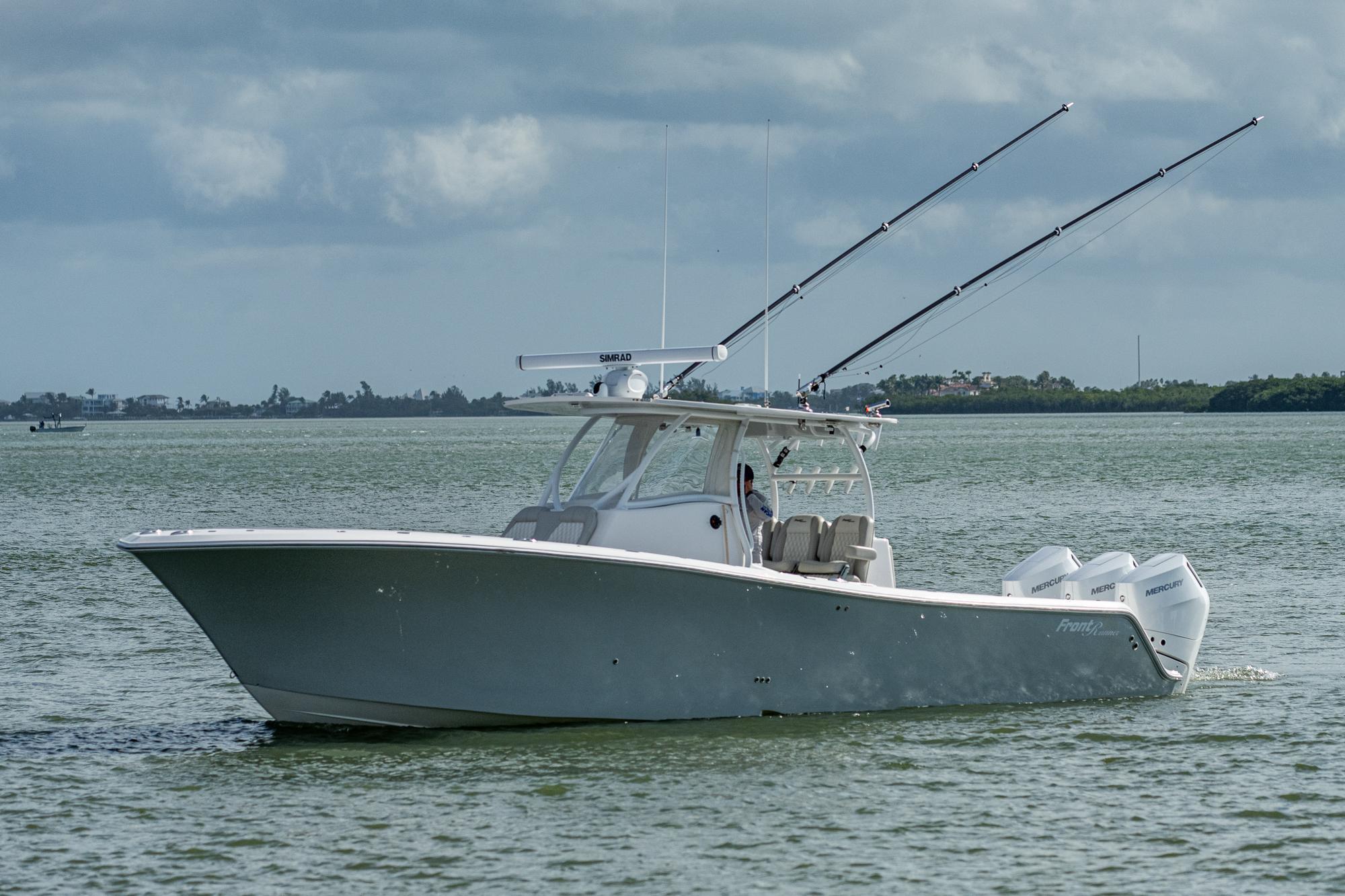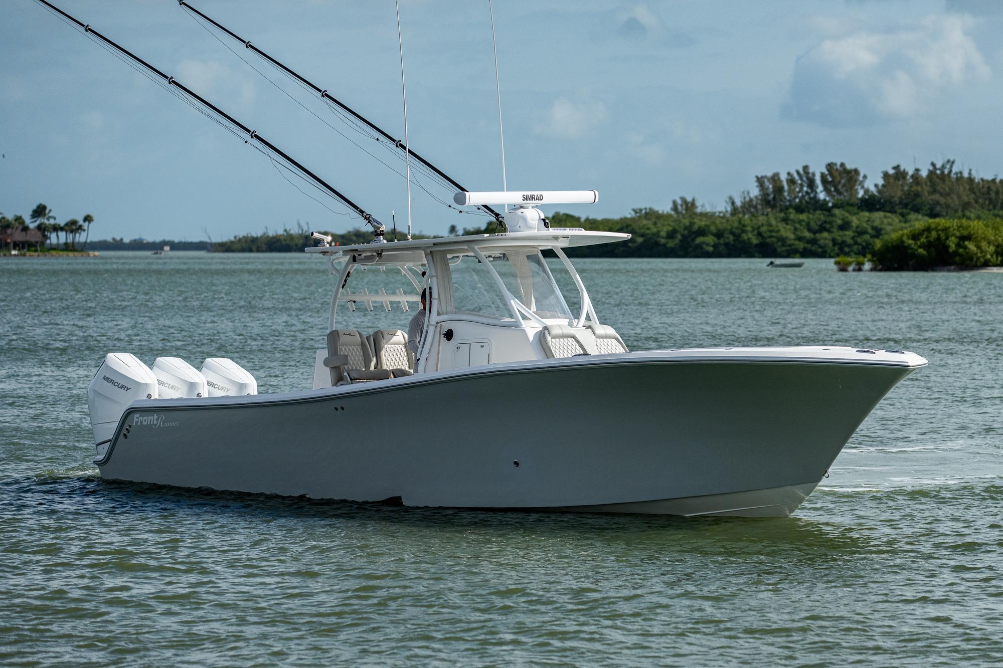 This 2021 Frontrunner is powered with 2023 triple 400hp V10 Mercurys with 650 hours on them. Feautres include Simrad electronics, Sea Keeper Ride,Gemlux riggers, Eisenglass enclosure with wings. Very well maintained and professionally detailed. Also sold with triple axel Amera Trail trailer.
