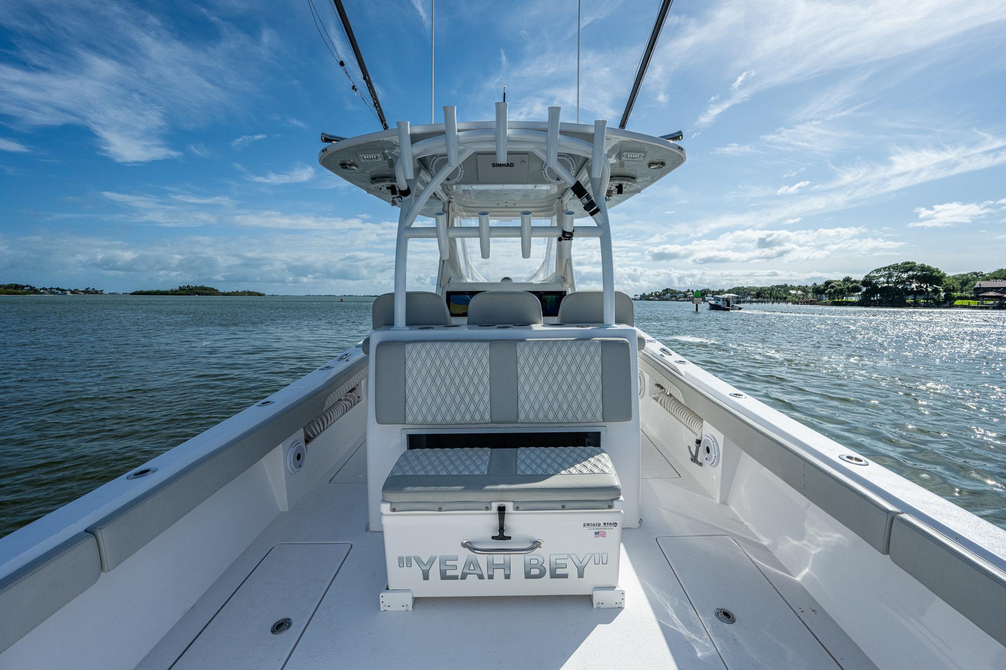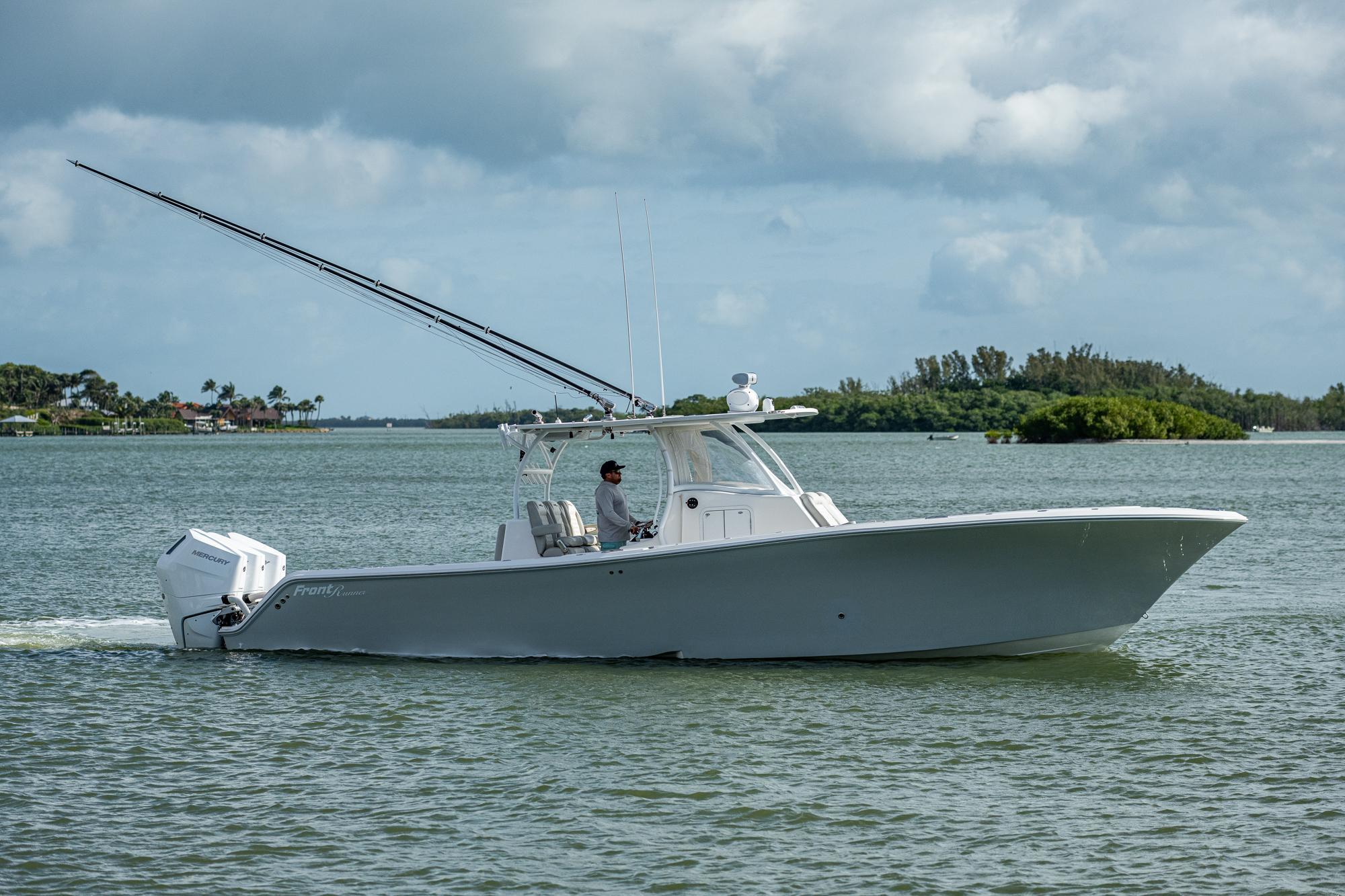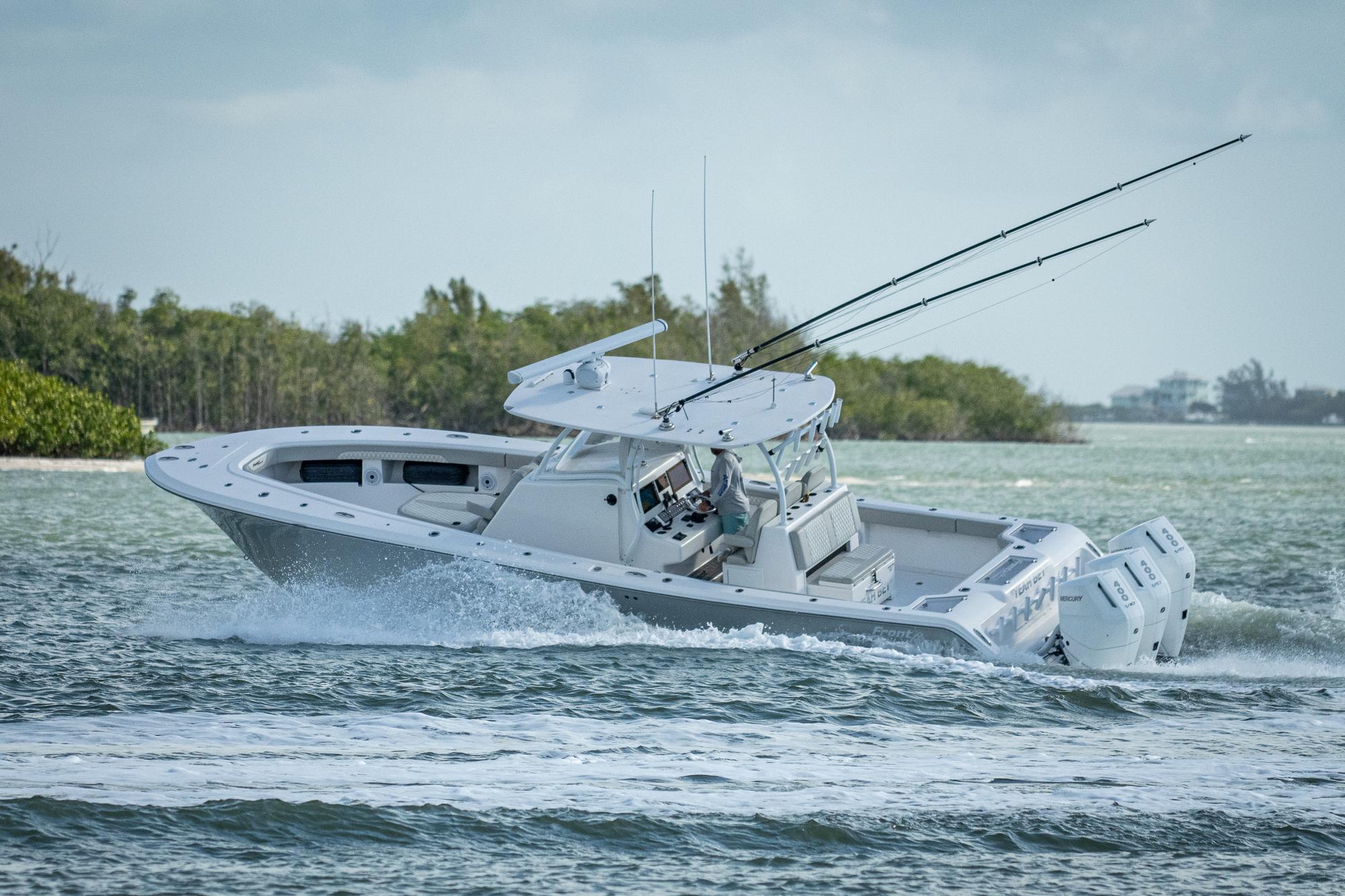 This 2021 Frontrunner is powered with 2023 triple 400hp V10 Mercurys with 650 hours on them. Feautres include Simrad electronics, Sea Keeper Ride,Gemlux riggers, Eisenglass enclosure with wings. Very well maintained and professionally detailed. Also sold with triple axel Amera Trail trailer.