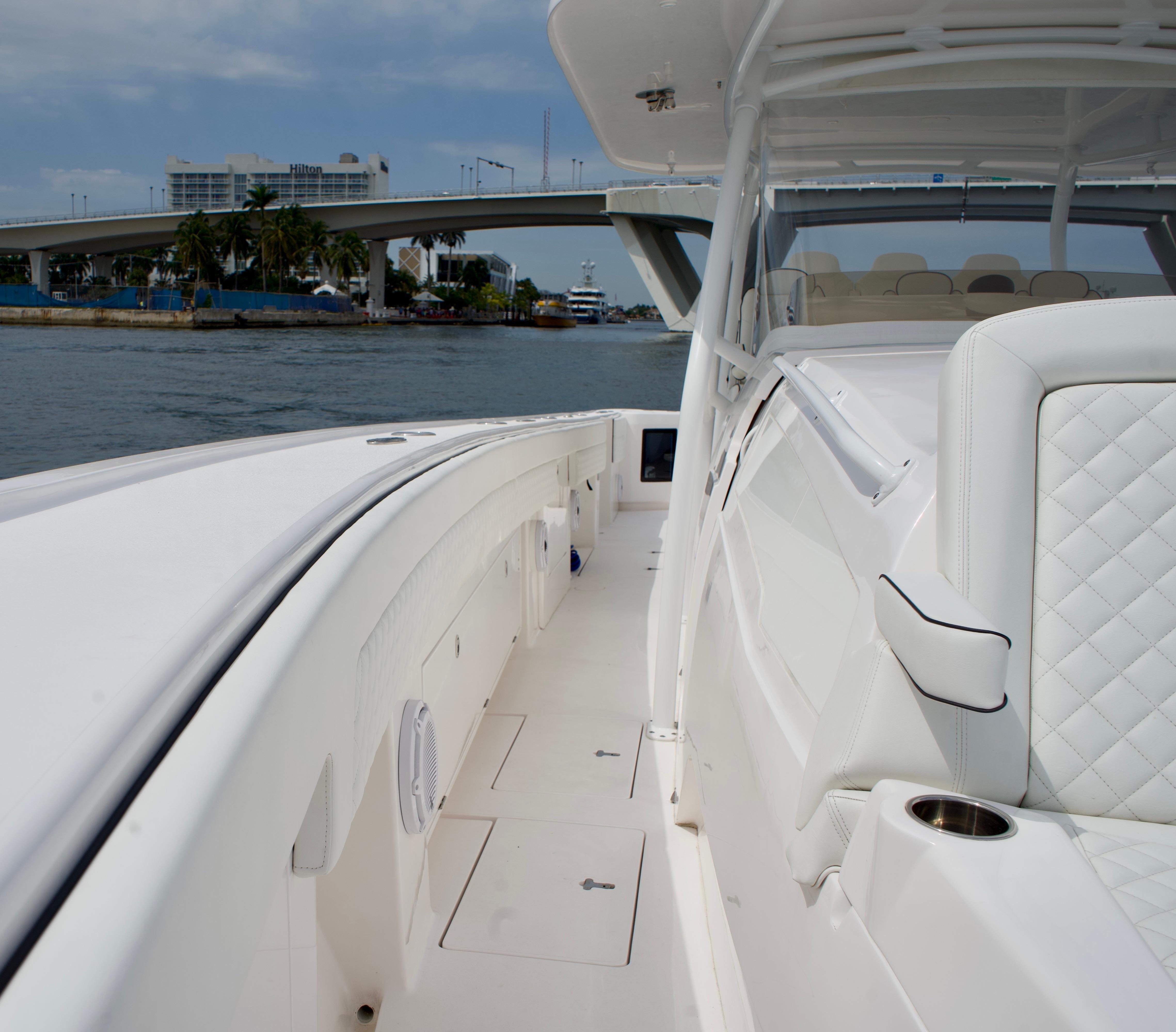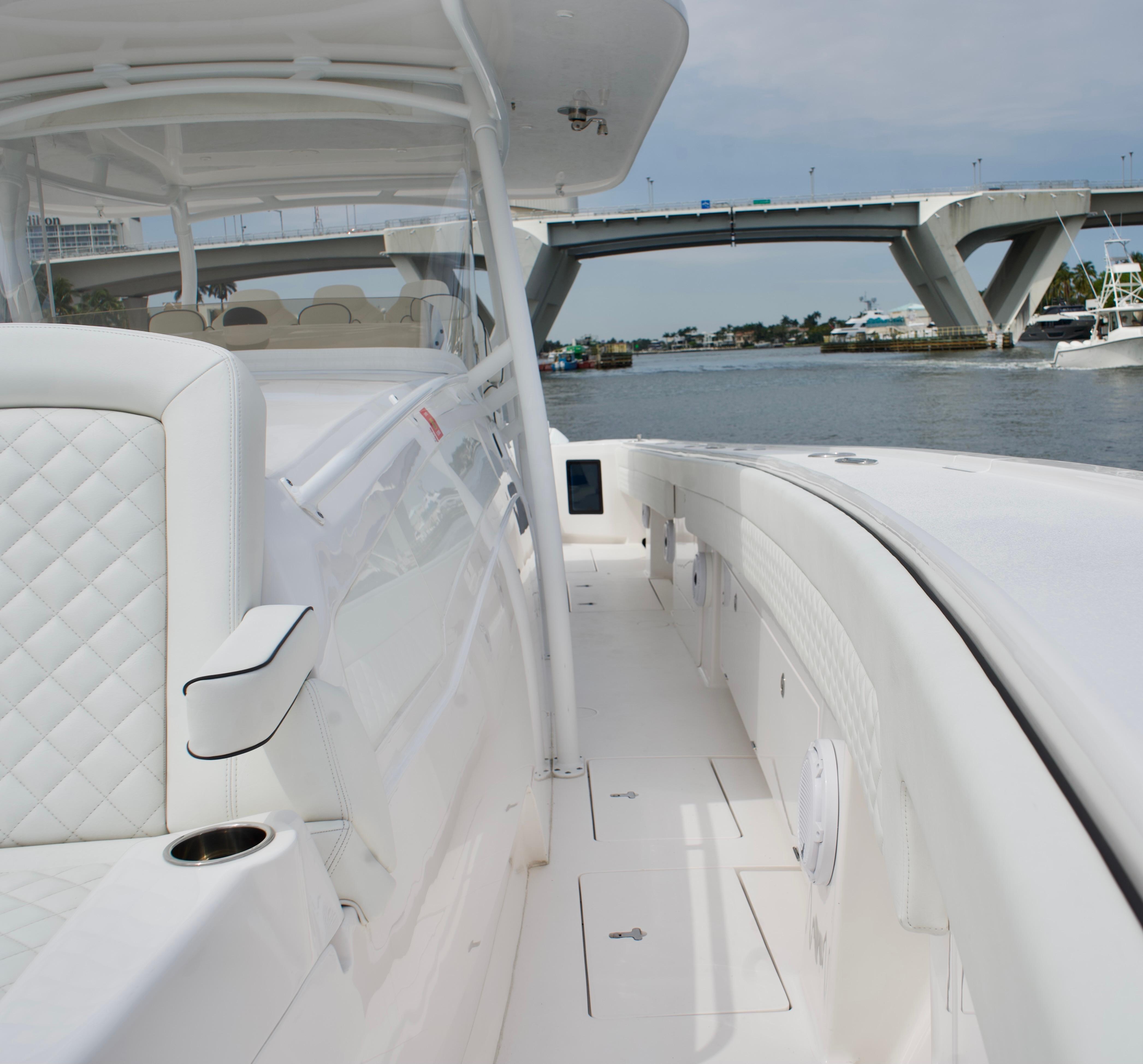 ConstructionGuttered Cockpit Hatches w/ Self Bailing Cockpit Plexi Trim Package Integrated Motor Bracket for Triple or Quad Engine Configurations Non-Skid Deck and Gunwales Non-Woven Quad and Uni-Directional Fibers Both Infused and Hand Laid PVC Foam Core Construction (wood free) FRP Infused Hull, Liner, and Deck
