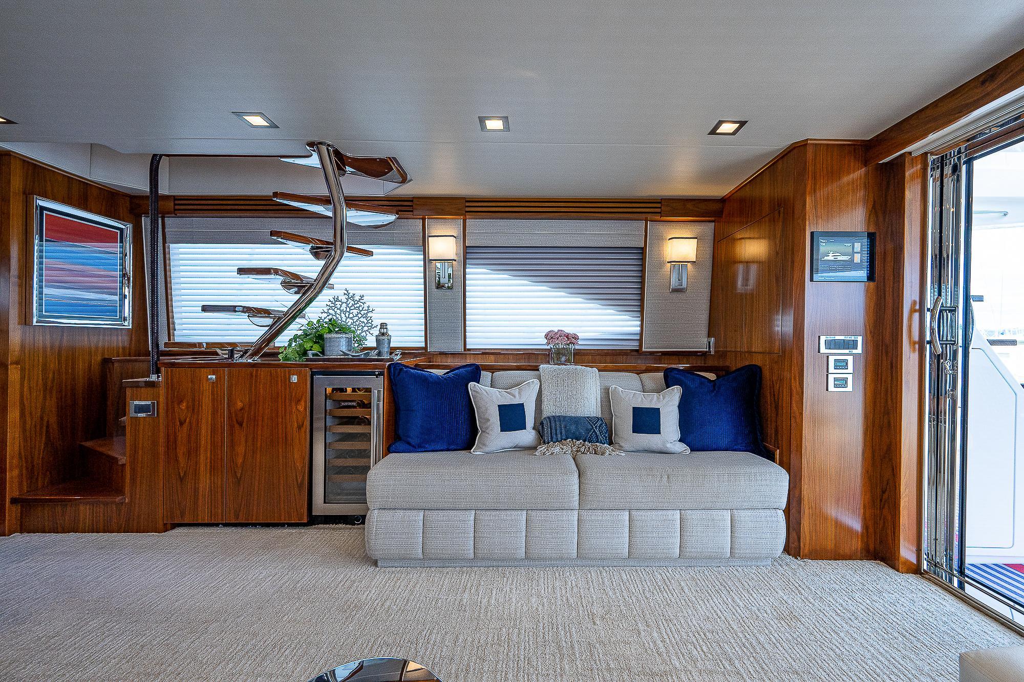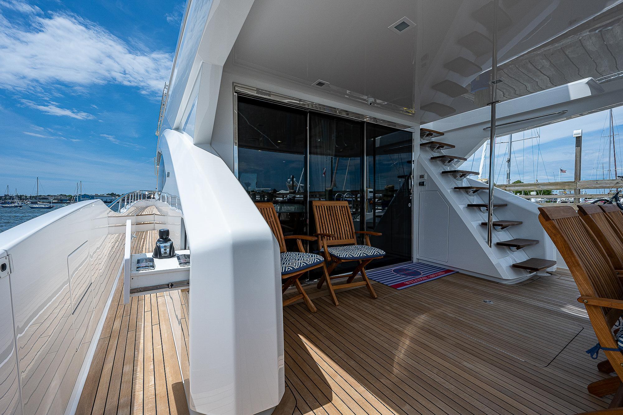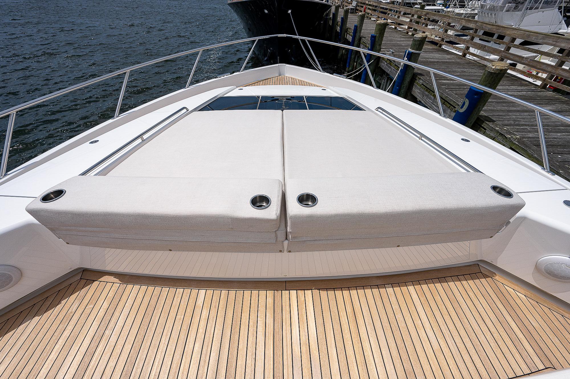 Exterior Convenience OptionsSURE SHADE electric awning in flybridge overhang, air conditioned seat backs on aft deck, docking controls concealed in aft deck haunches include shifter, joystick, and thruster controls, foredeck seating and sunpad, foredeck drink refrigerator, removable sun shade on foredeck, transom shower, opening glass sunroof panel on flybridge custom furniture on aft flybridge deck, underwater lights, TIDE RIDE boarding ladder system, (5) aft deck teak chairs, concealed fender storage forward.