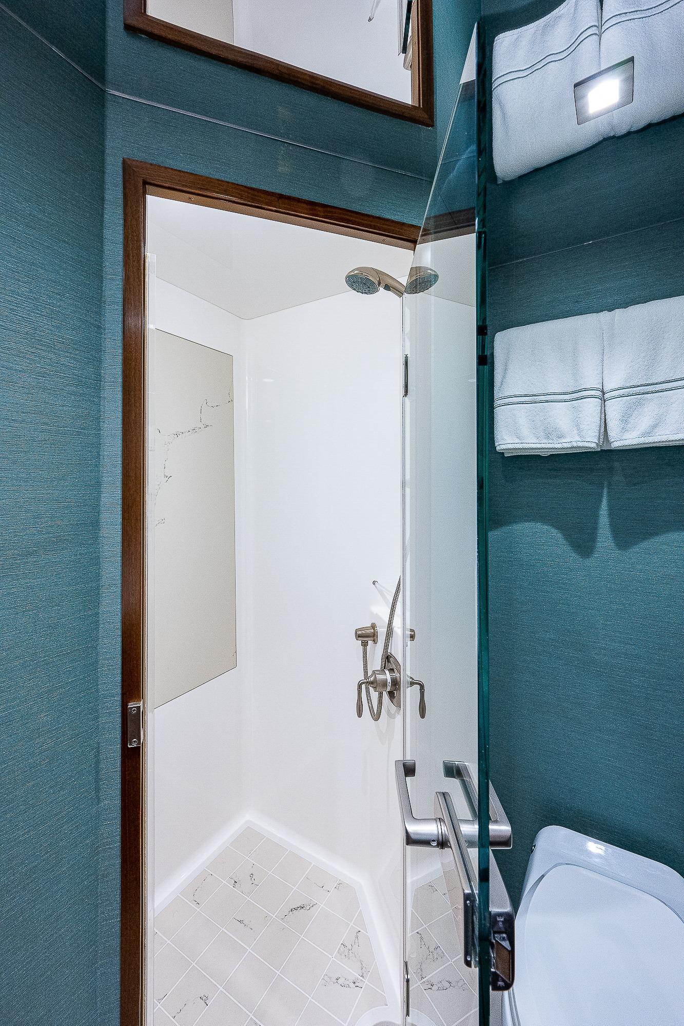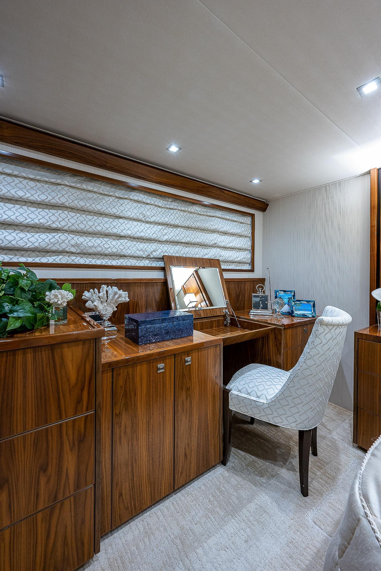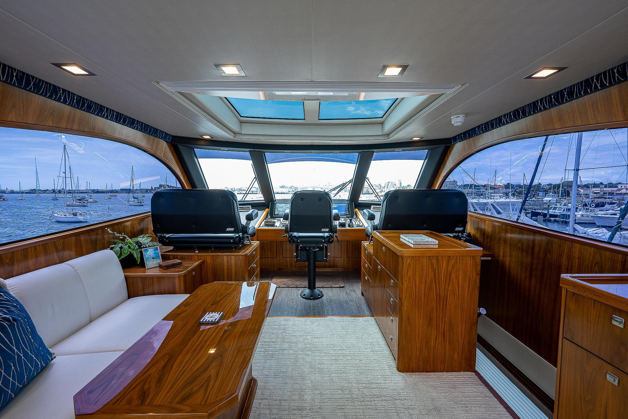 Exterior Convenience OptionsSURE SHADE electric awning in flybridge overhang, air conditioned seat backs on aft deck, docking controls concealed in aft deck haunches include shifter, joystick, and thruster controls, foredeck seating and sunpad, foredeck drink refrigerator, removable sun shade on foredeck, transom shower, opening glass sunroof panel on flybridge custom furniture on aft flybridge deck, underwater lights, TIDE RIDE boarding ladder system, (5) aft deck teak chairs, concealed fender storage forward.