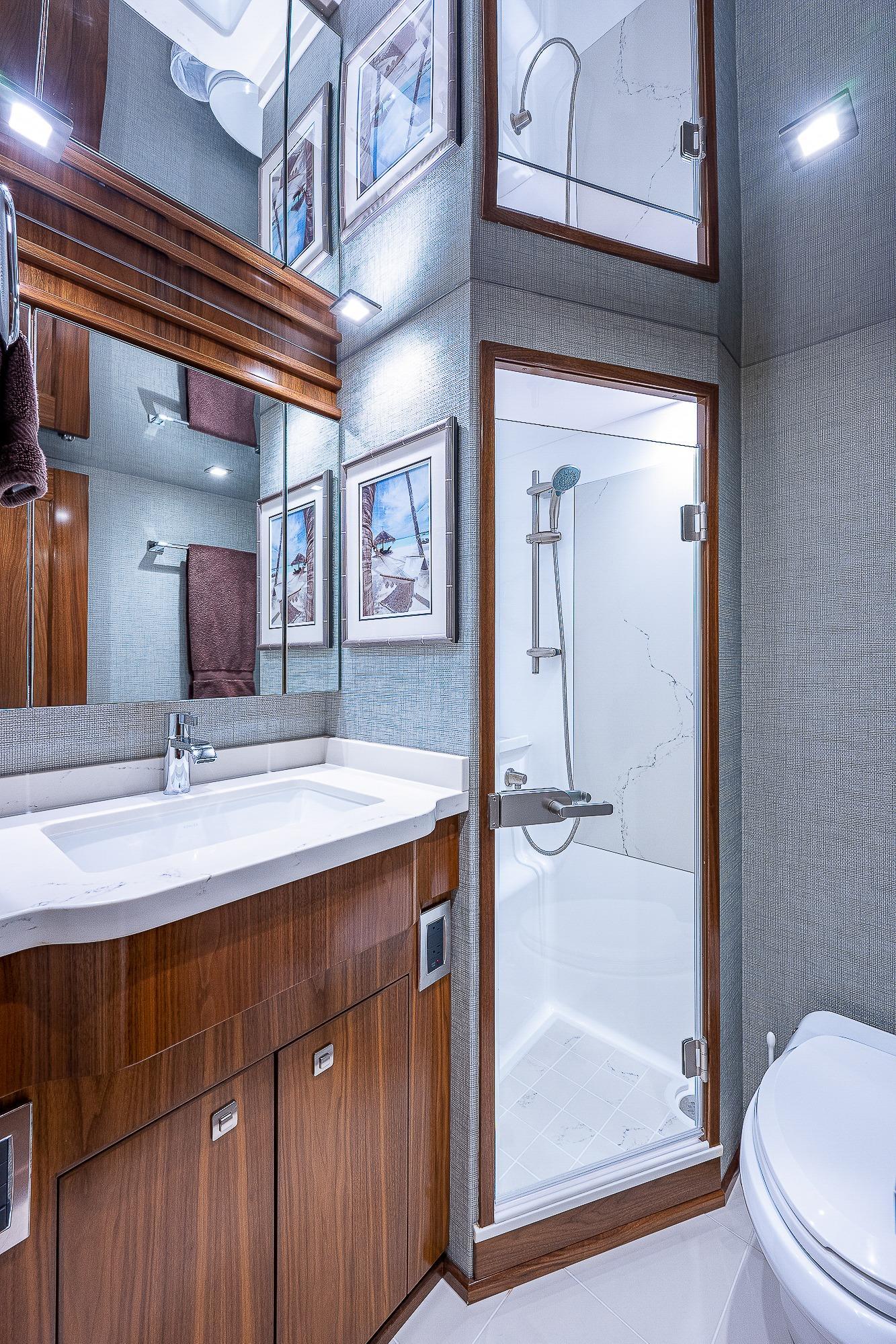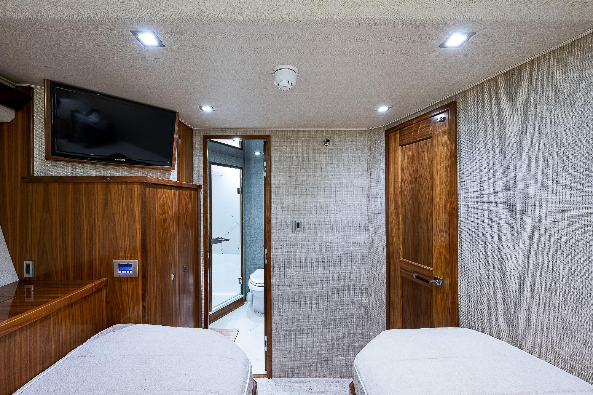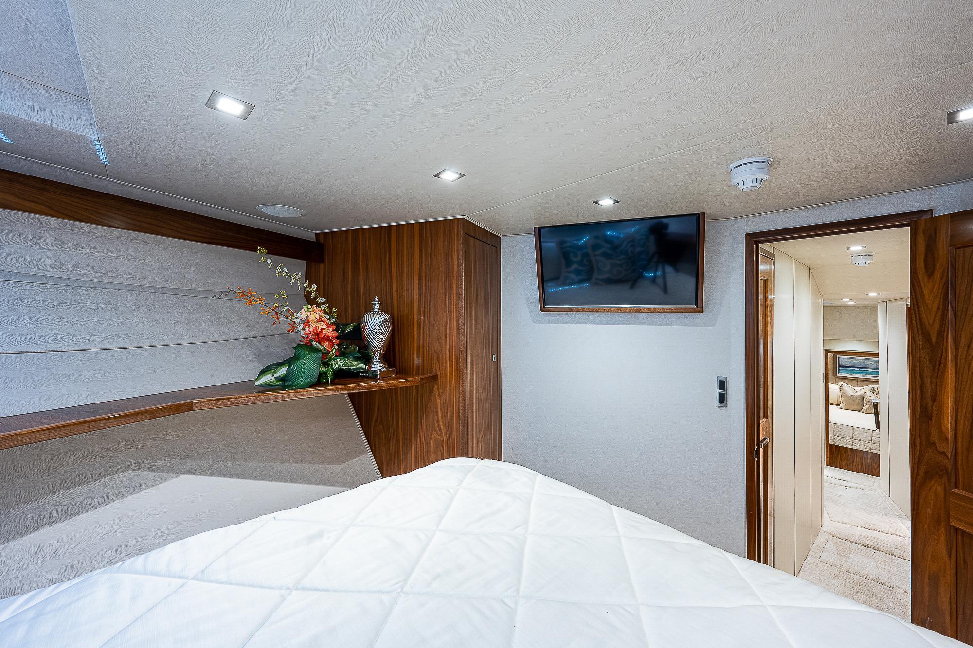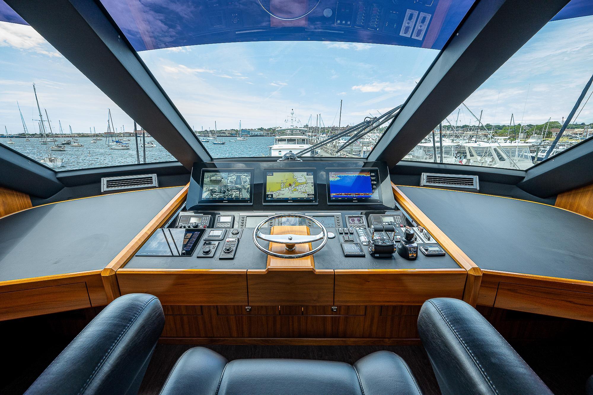 Notable Factory OptionsMaxwell RC12 hydraulic anchor windlass, upgraded polished stainless steel anchor, hydraulic swim platform, SEAKEEPER SK26 gyro stabilizer, 1400 GPD watermaker with auto backflush, power distribution system with touch screen controls in salon, crew area, and on flybridge, Veem interceptor propellers