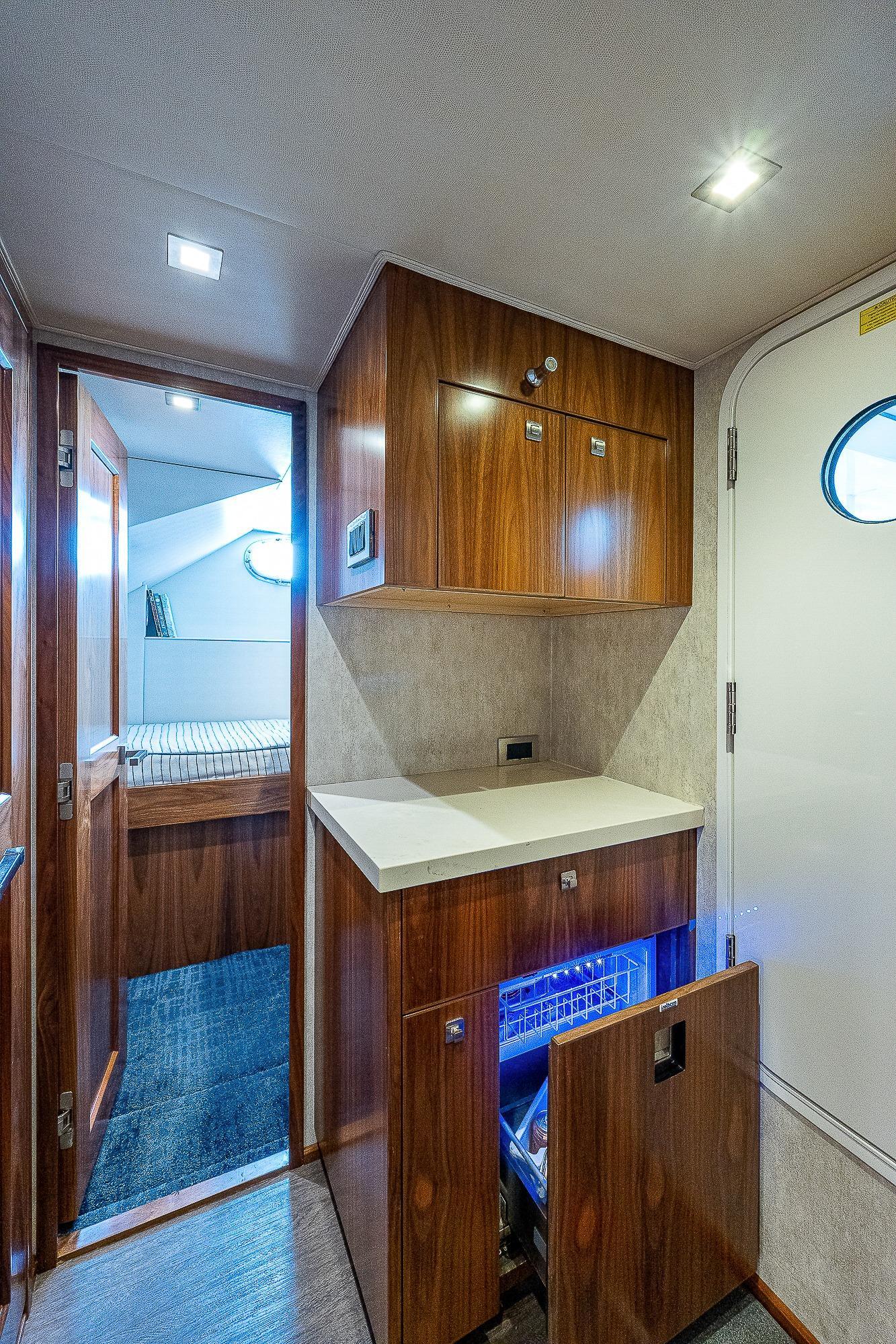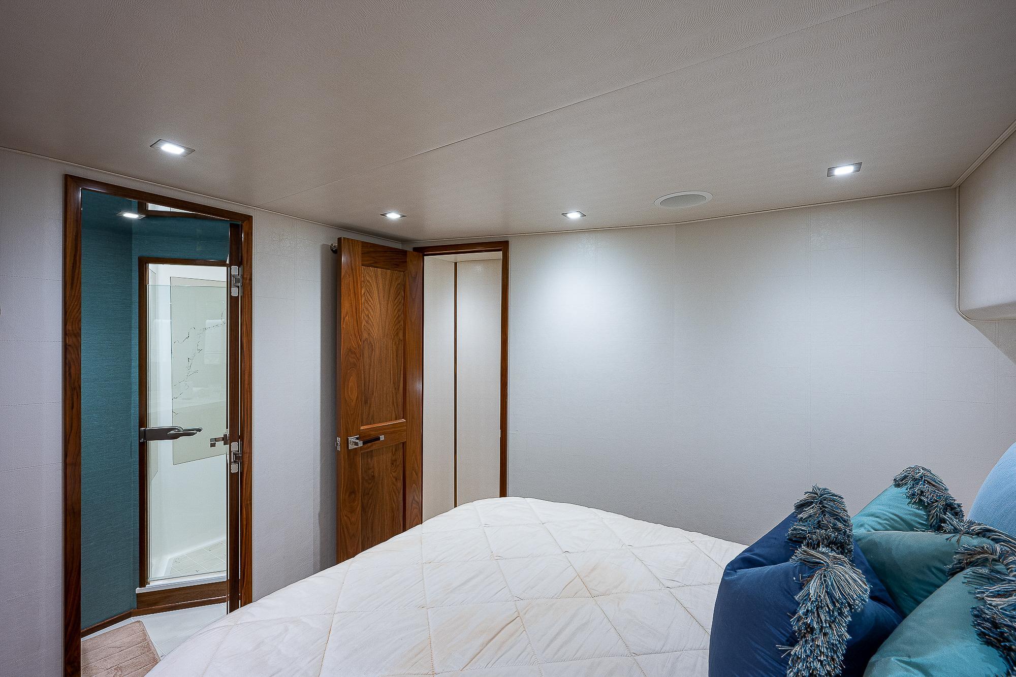 Access to the enclosed flybridge in provided from the salon and the aft deck. There is room to roam on this yacht! Galley features include SUB ZERO refrigeration, four-burner cooktop, disposal, dishwasher, microwave/convection oven, built-in full oven, compactor, double stainless steel sink, and an abundance of storage.
