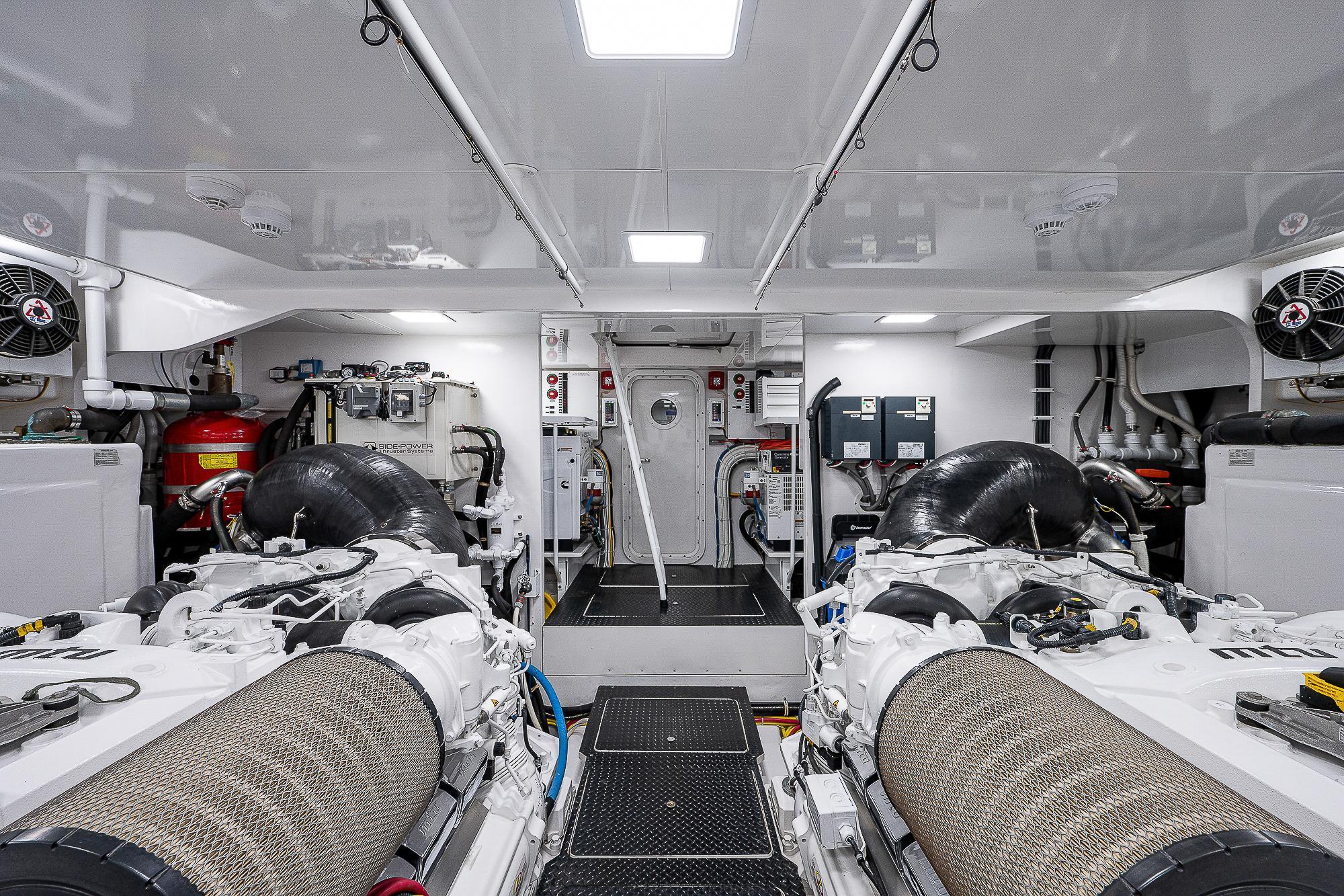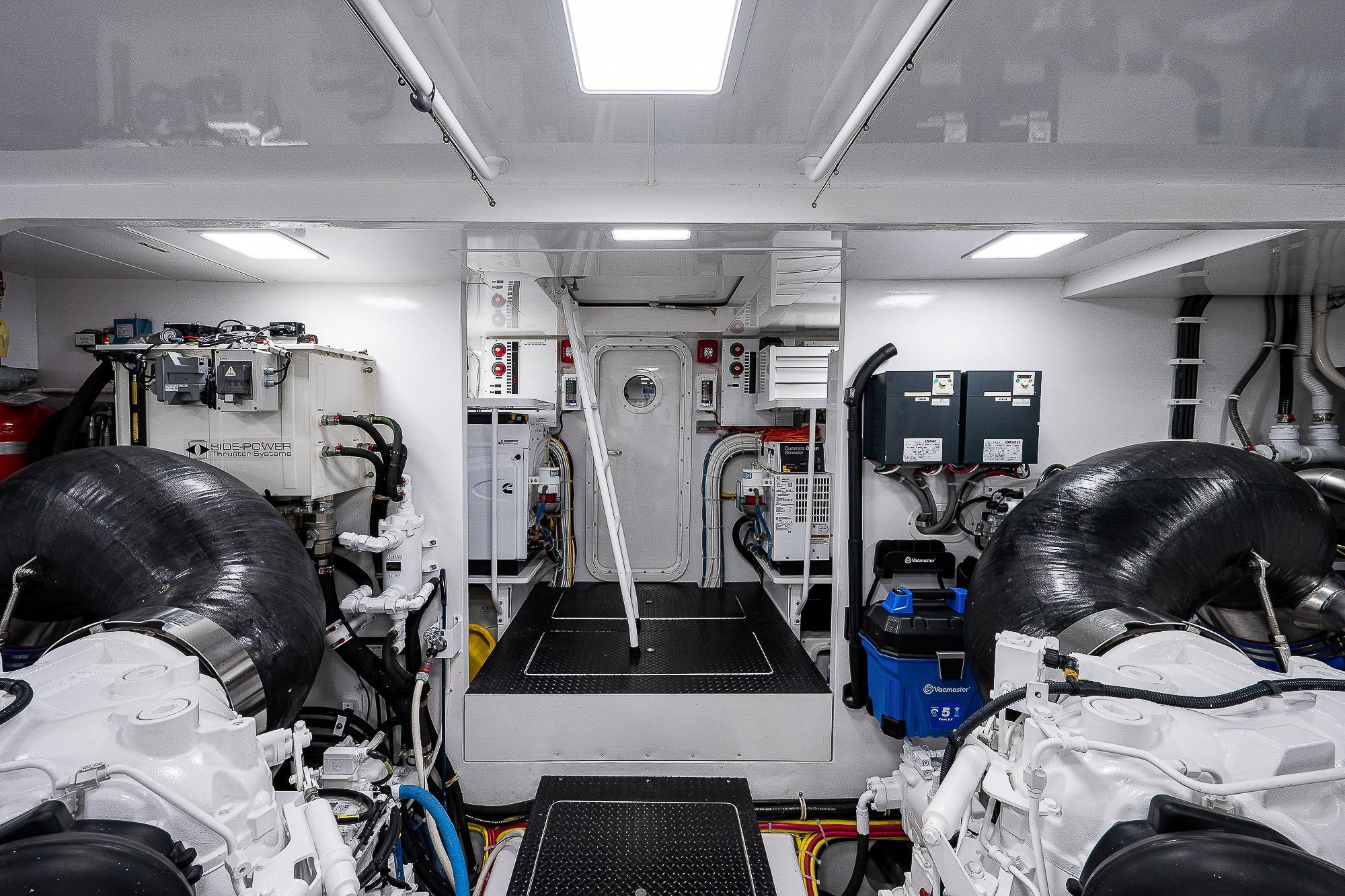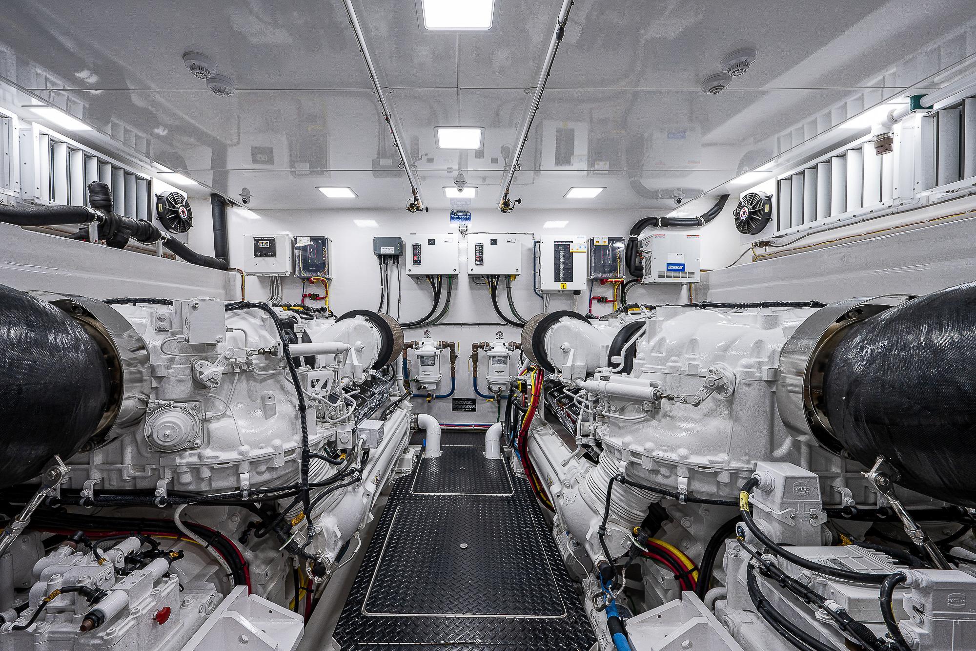 Engine Room / Mechanical Equipment(2) 12V2000 M96L diesels with dynamic positioning joystick and EXTENDED WARRANTY COVERAGE UNTIL 10/31/2026 or 1583 hours, (2) 29KW Onan generators (815 and 820 hours), DELTA T ventilation system, fuel priming pumps, fuel transfer system, oil change system for engines, transmissions, and generators with exterior pump out, central sea water system, fresh water in engine room, dual Racor fuel filters, Tides dripless shaft seals, Glendenning Cablemasters for 100A cords, back up fuel transfer and sea water pumps, storage shelves over both generators, tool box