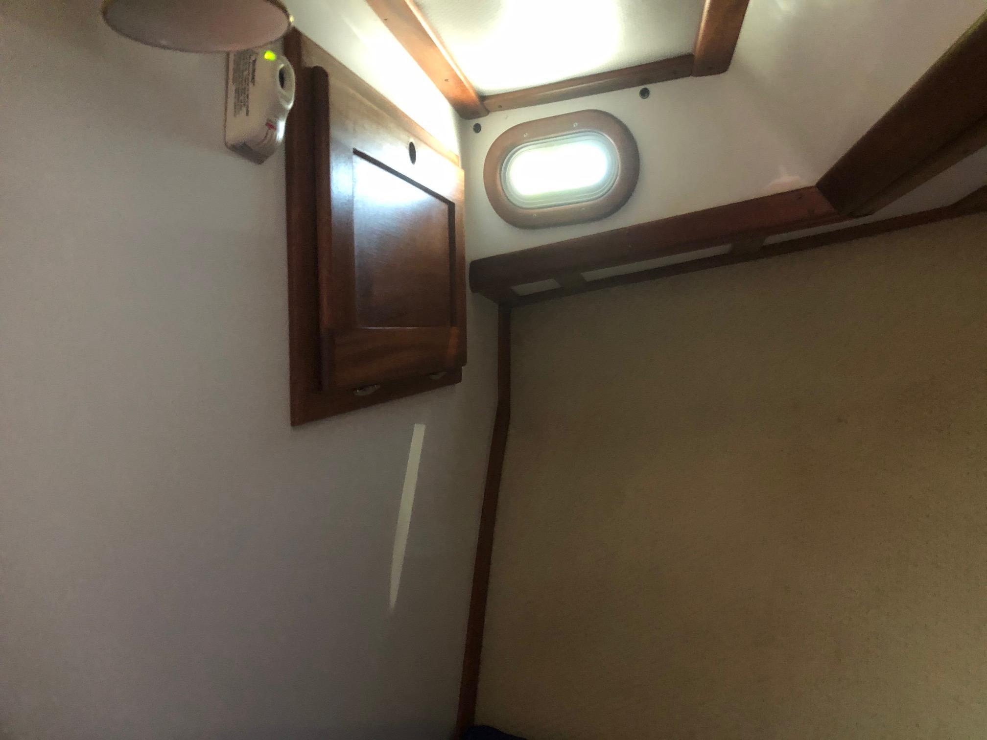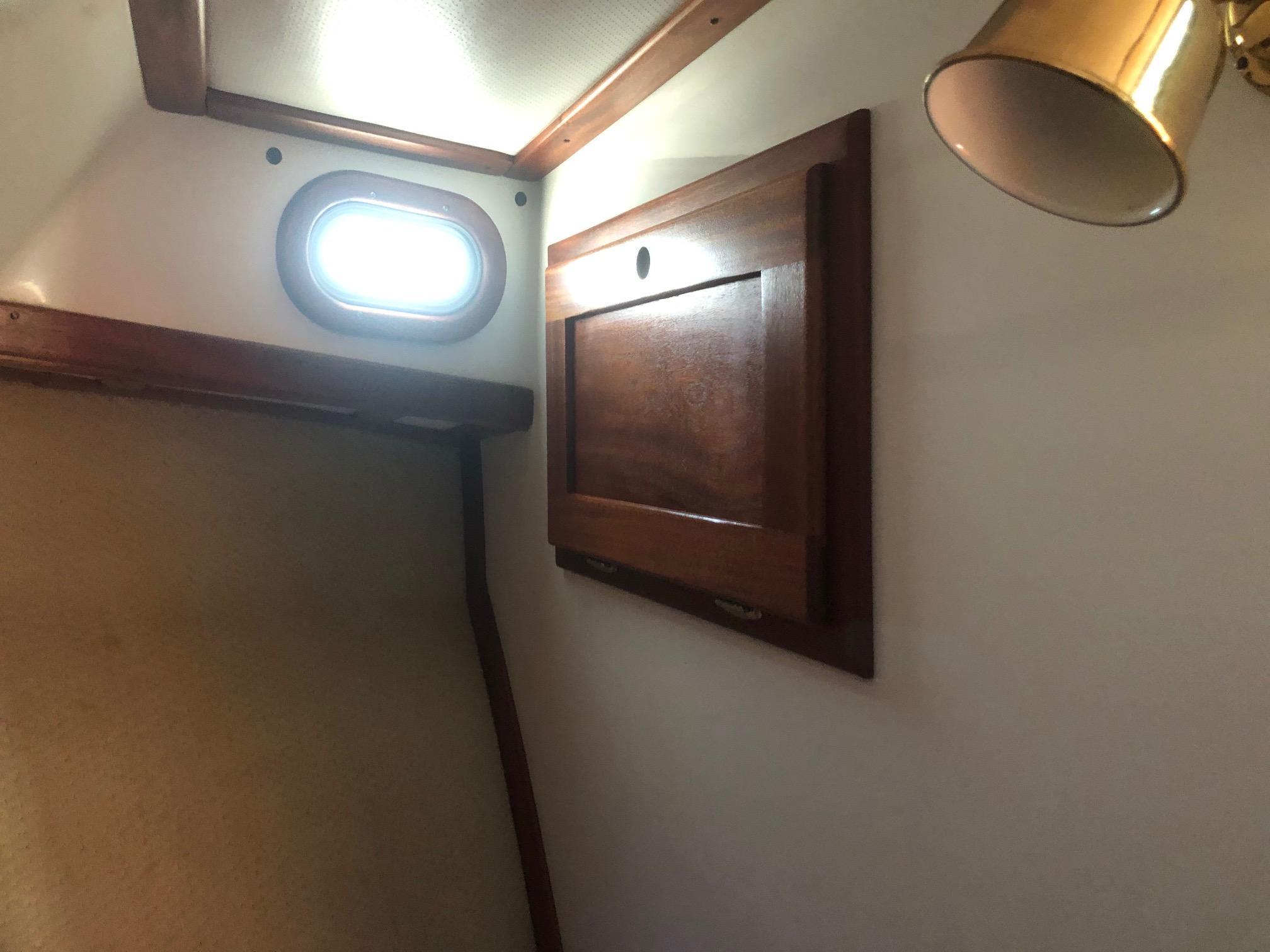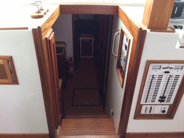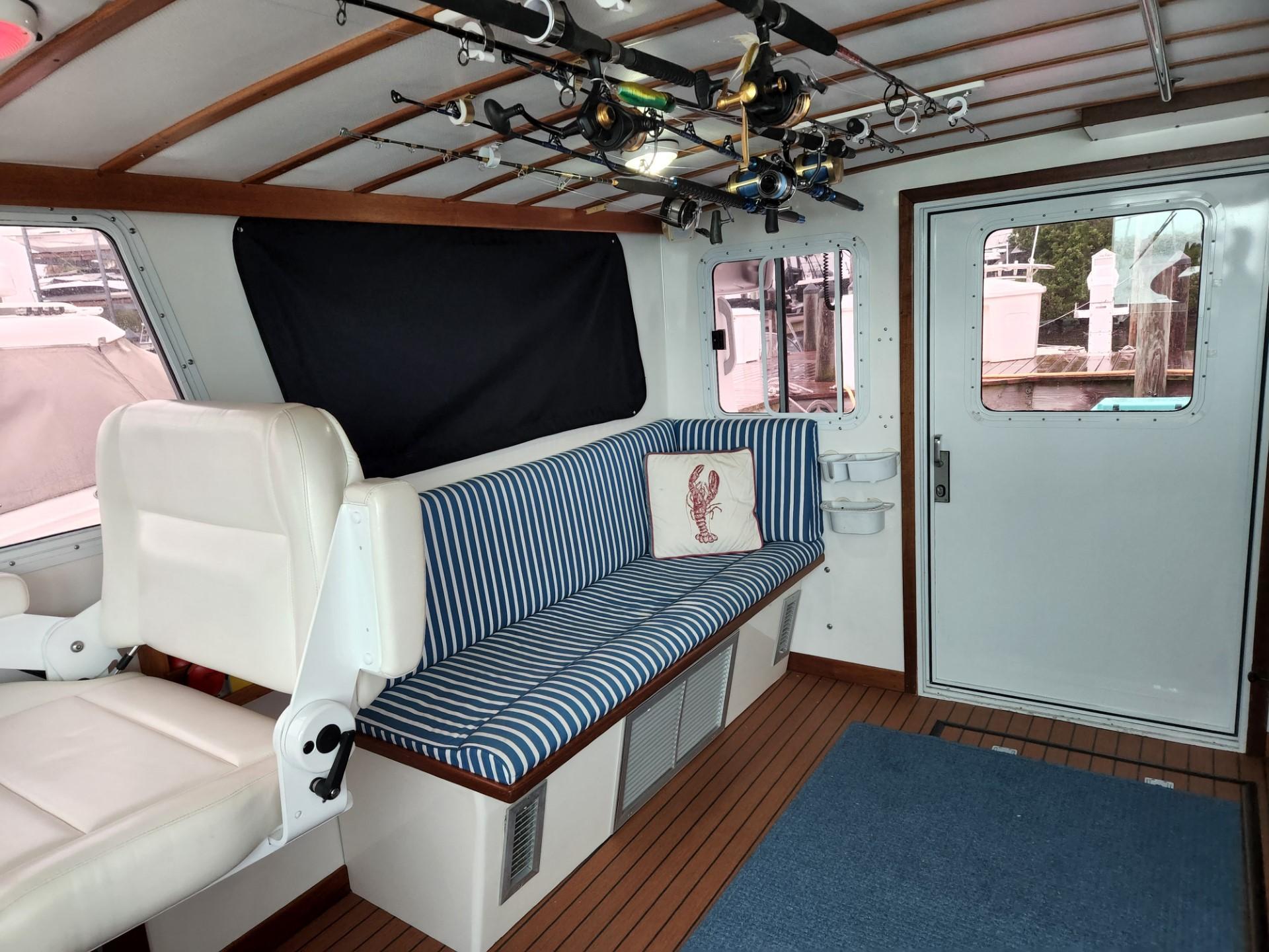Large cockpit with tuna door/boarding gate, enclosed port/starboard storage lockers and center hatch opening to huge under deck lazarette storage. Ladder to fly bridge with molded seating and upper helm station. Diamond Seaglaze sliding door to wheel house with large L shaped settee, hi-low table and navigator’s station with double Stidd seat to port; straight settee, lower helm station and single oversized Stidd helm seat to starboard; and storage areas port and starboard. Area carpet in wheel house with Soundown underlayment. Down below U shaped galley to port with double sink, two burner electric stove, GE microwave/convection oven, fridge and abundant drawers and cabinets. Head with sink, vanity, Raritan Elegance electric toilet and separate shower to starboard. Cabinet to electrical space behind toilette. Large V berth forward with storage under and hanging lockers port and starboard. Access to chain/rope locker in forepeak. Interior trimmed Herreshoff style in varnished mahogany with Soundown headliner in wheel house and forward cabin. Wheel house and lower cabin sole of Lonseal teak and ebony with one large engine room center hatch and access hatches port and starboard.