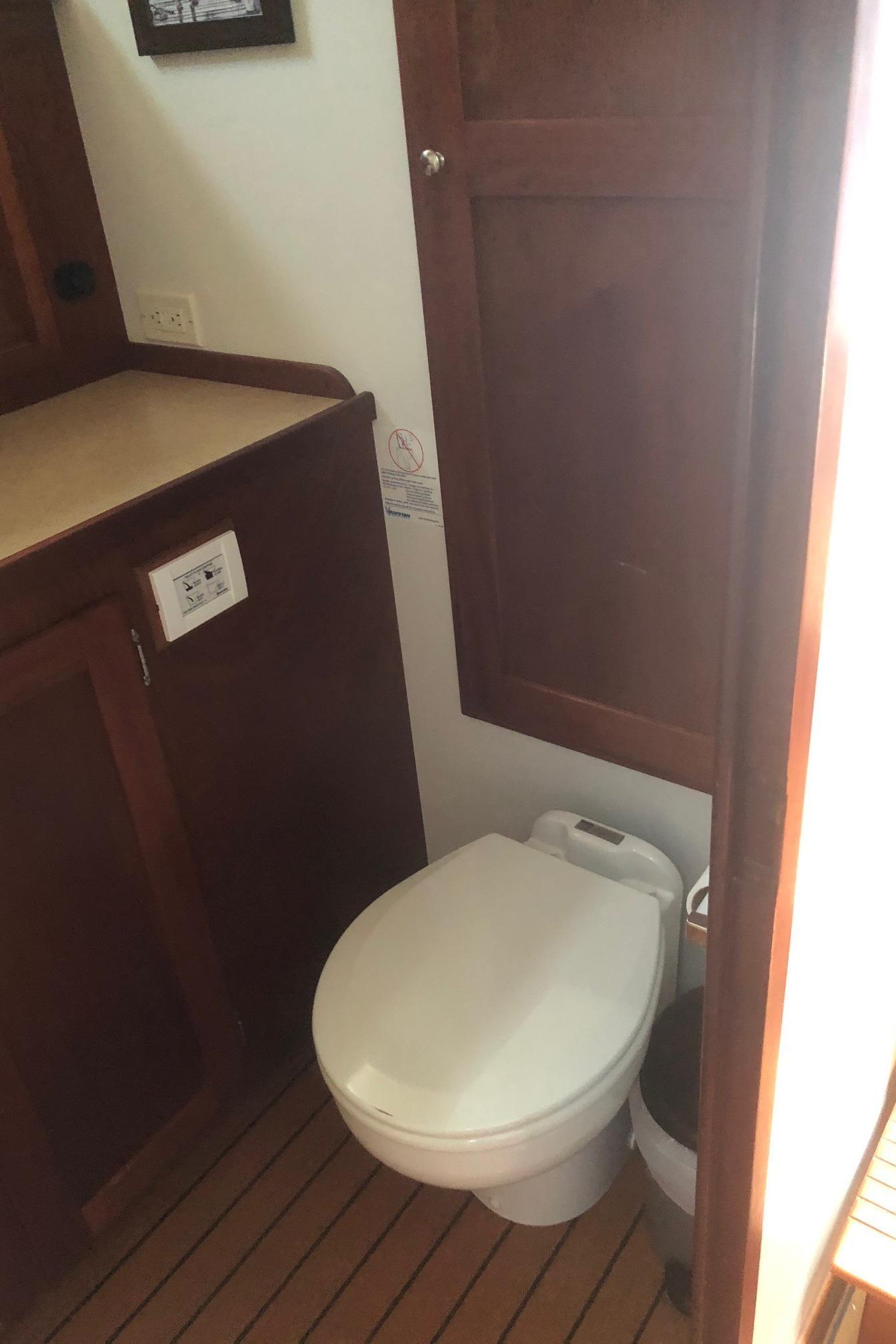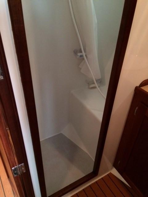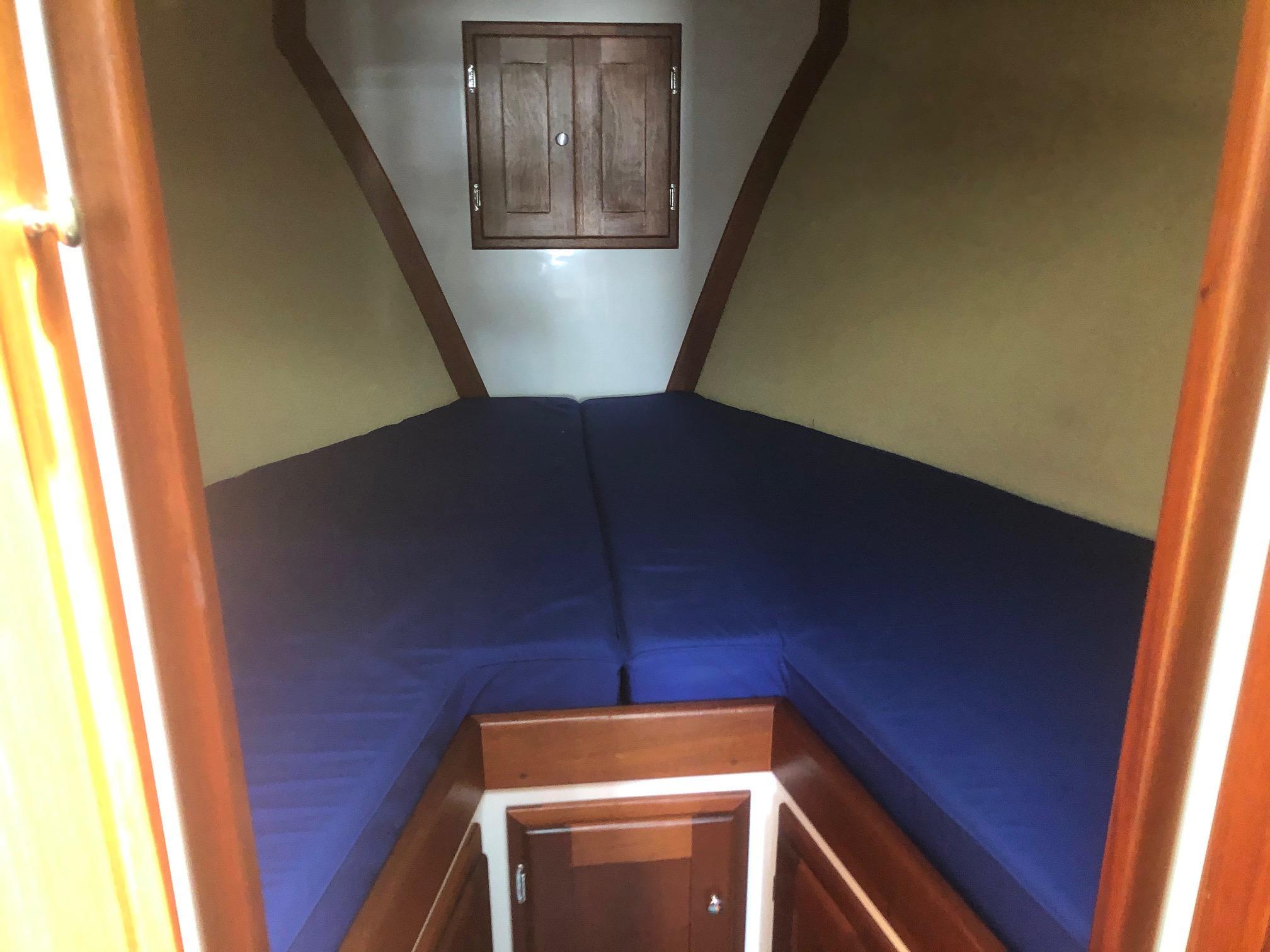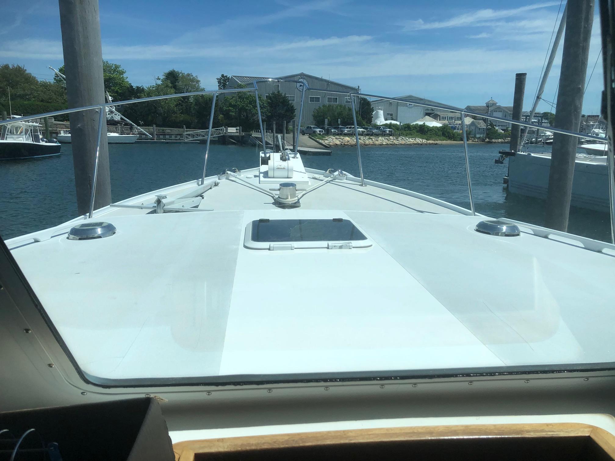 Large cockpit with tuna door/boarding gate, enclosed port/starboard storage lockers and center hatch opening to huge under deck lazarette storage. Ladder to fly bridge with molded seating and upper helm station. Diamond Seaglaze sliding door to wheel house with large L shaped settee, hi-low table and navigator’s station with double Stidd seat to port; straight settee, lower helm station and single oversized Stidd helm seat to starboard; and storage areas port and starboard. Area carpet in wheel house with Soundown underlayment. Down below U shaped galley to port with double sink, two burner electric stove, GE microwave/convection oven, fridge and abundant drawers and cabinets. Head with sink, vanity, Raritan Elegance electric toilet and separate shower to starboard. Cabinet to electrical space behind toilette. Large V berth forward with storage under and hanging lockers port and starboard. Access to chain/rope locker in forepeak. Interior trimmed Herreshoff style in varnished mahogany with Soundown headliner in wheel house and forward cabin. Wheel house and lower cabin sole of Lonseal teak and ebony with one large engine room center hatch and access hatches port and starboard.