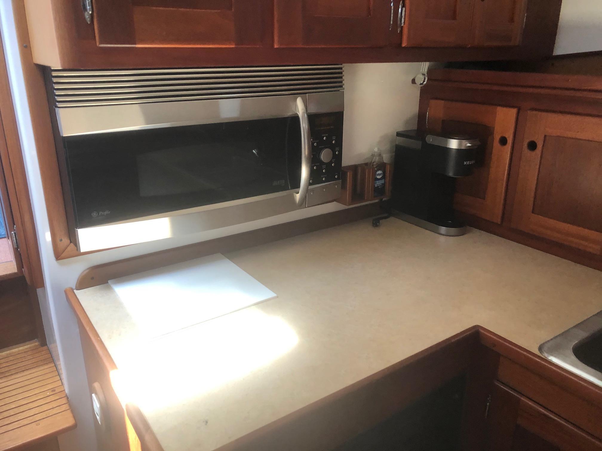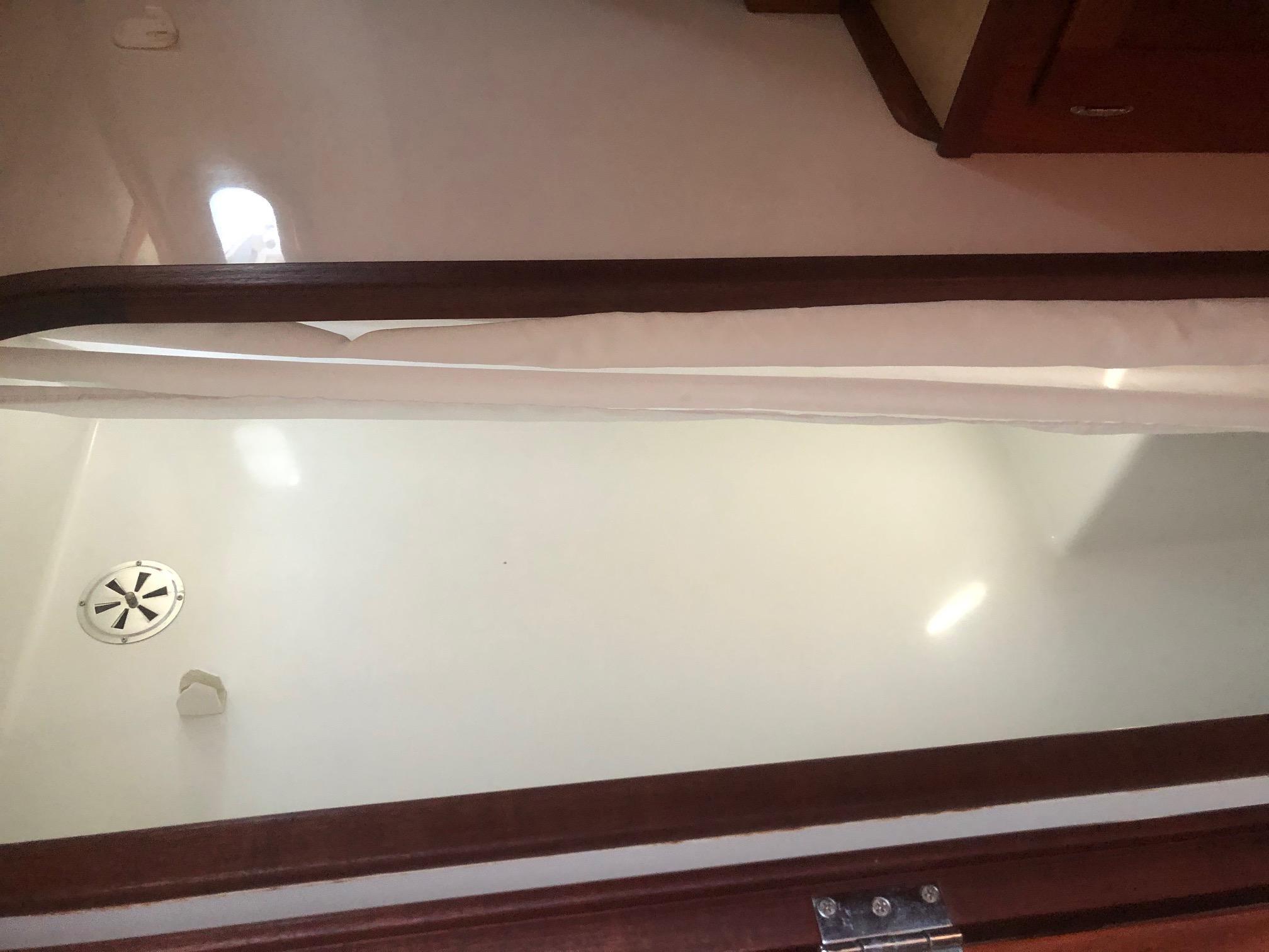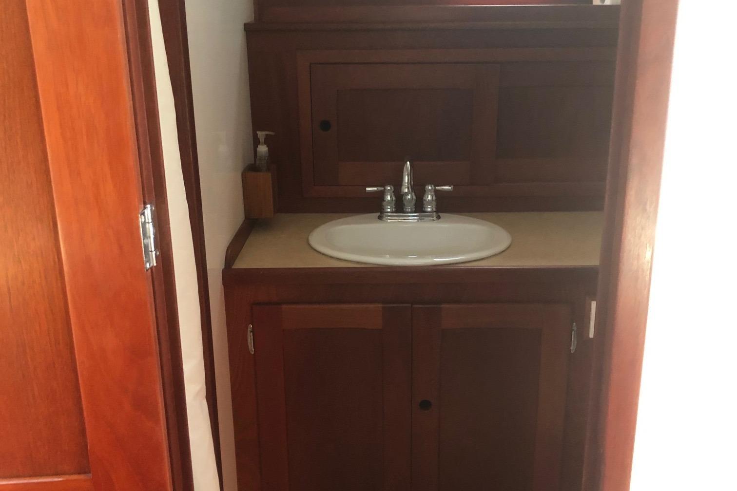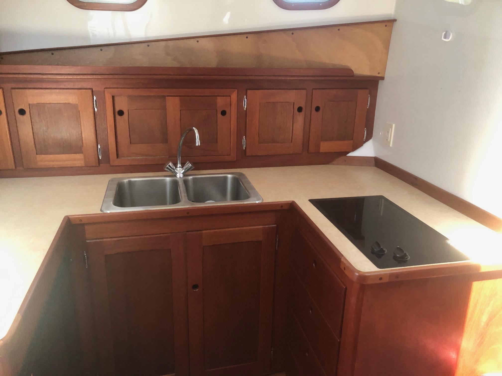 Large cockpit with tuna door/boarding gate, enclosed port/starboard storage lockers and center hatch opening to huge under deck lazarette storage. Ladder to fly bridge with molded seating and upper helm station. Diamond Seaglaze sliding door to wheel house with large L shaped settee, hi-low table and navigator’s station with double Stidd seat to port; straight settee, lower helm station and single oversized Stidd helm seat to starboard; and storage areas port and starboard. Area carpet in wheel house with Soundown underlayment. Down below U shaped galley to port with double sink, two burner electric stove, GE microwave/convection oven, fridge and abundant drawers and cabinets. Head with sink, vanity, Raritan Elegance electric toilet and separate shower to starboard. Cabinet to electrical space behind toilette. Large V berth forward with storage under and hanging lockers port and starboard. Access to chain/rope locker in forepeak. Interior trimmed Herreshoff style in varnished mahogany with Soundown headliner in wheel house and forward cabin. Wheel house and lower cabin sole of Lonseal teak and ebony with one large engine room center hatch and access hatches port and starboard.