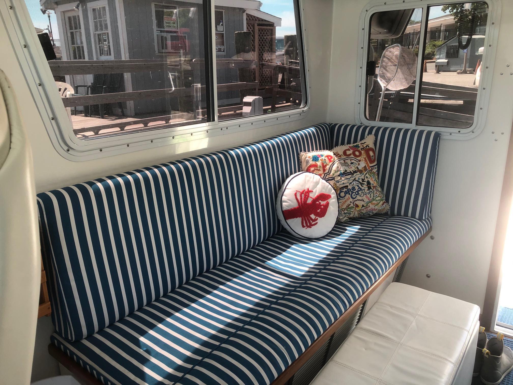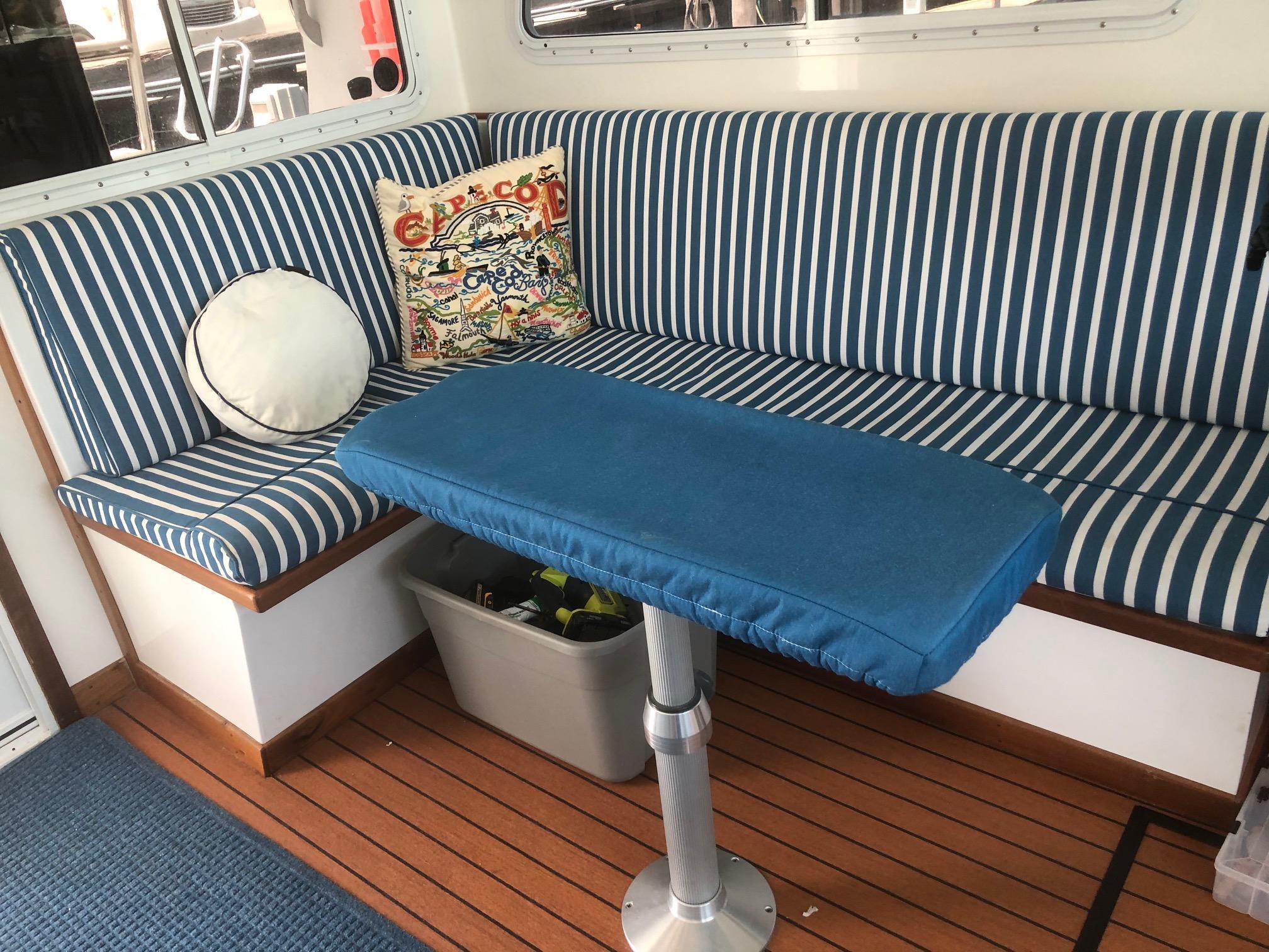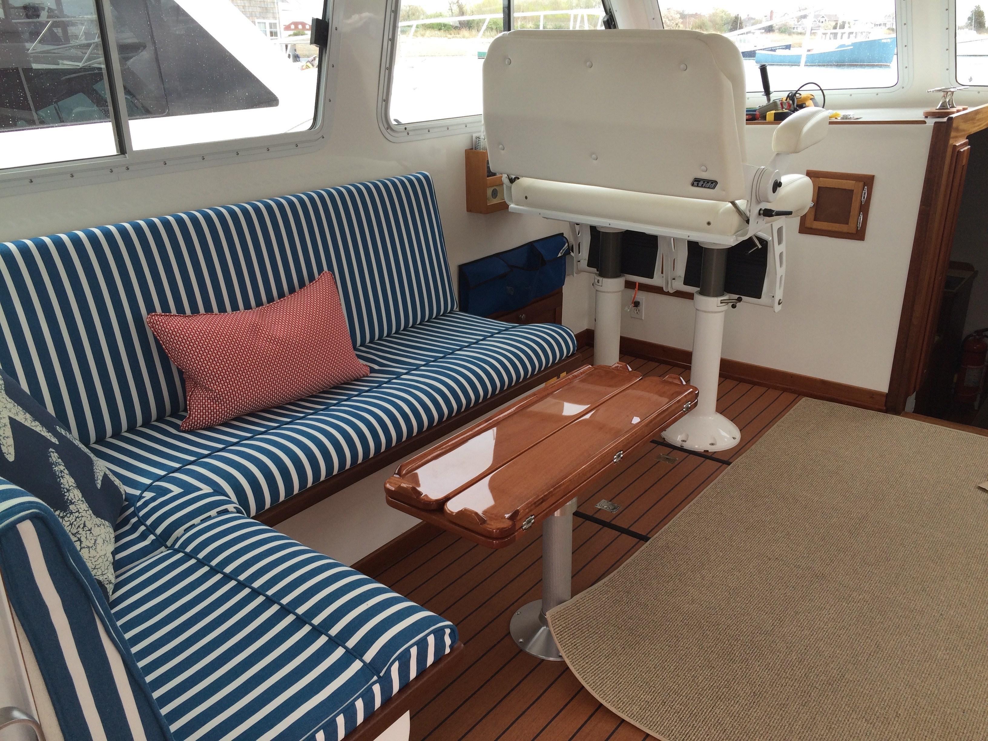 2016 – Widened port and starboard settees for more comfortable seating and added new settee cushions and custom mahogany hi-lo table.