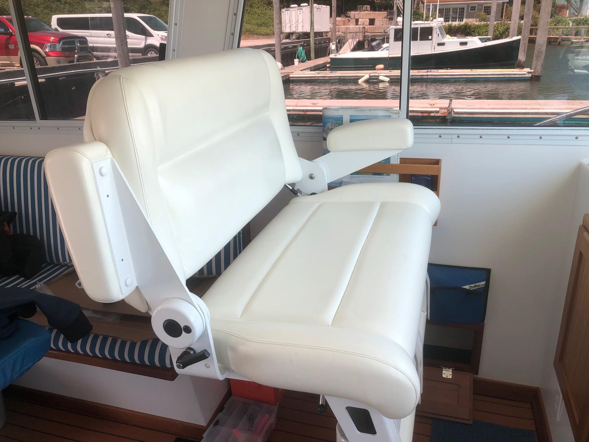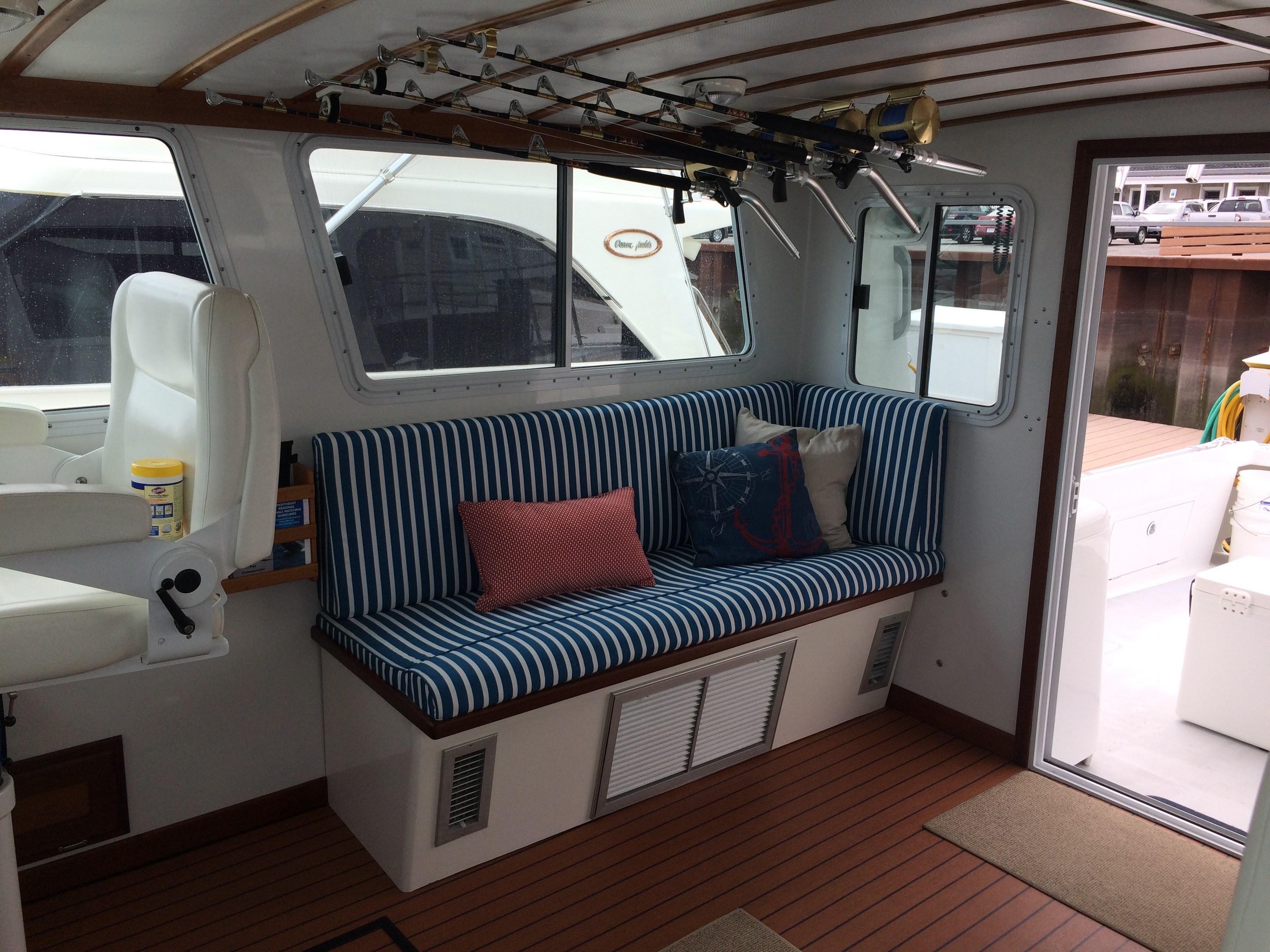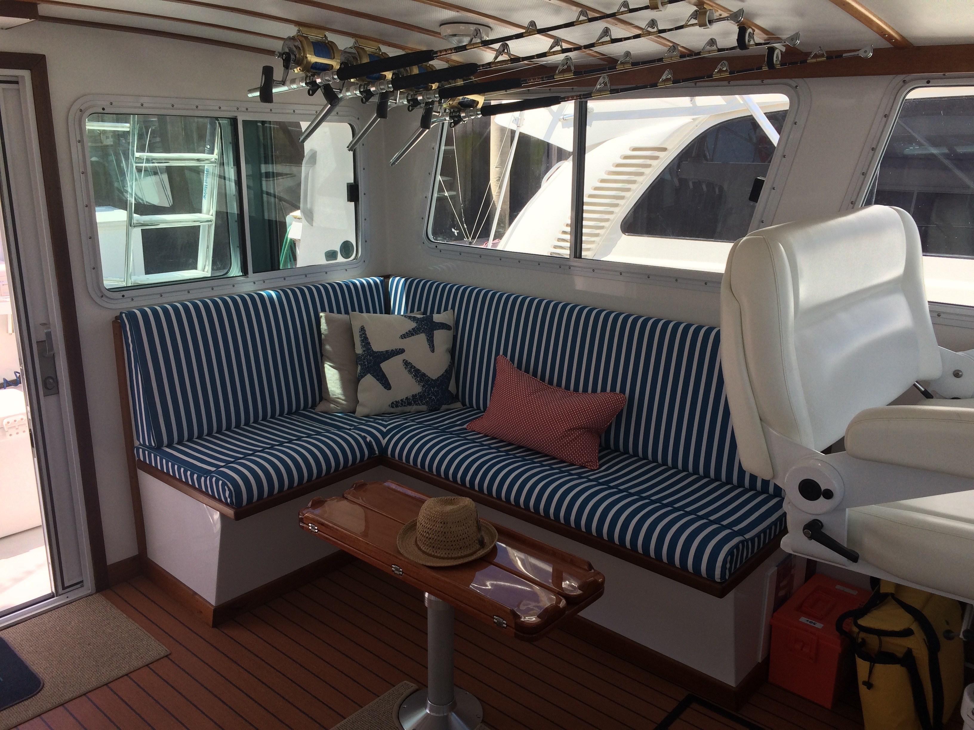 2016 – Widened port and starboard settees for more comfortable seating and added new settee cushions and custom mahogany hi-lo table.