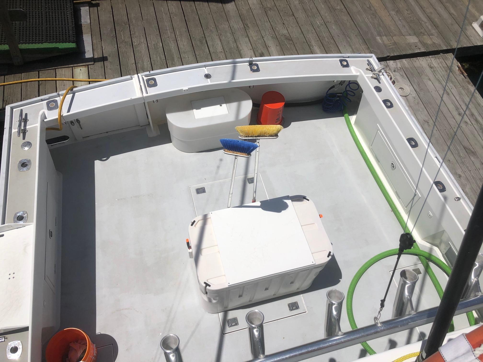 Heavy duty 12v windlass on anchor platform with 75’ of 3/8” chain, 225’ of 5/8” nylon rode and 45 lbs. CQR anchor (30 lbs. Fortress storm anchor on foredeck).
