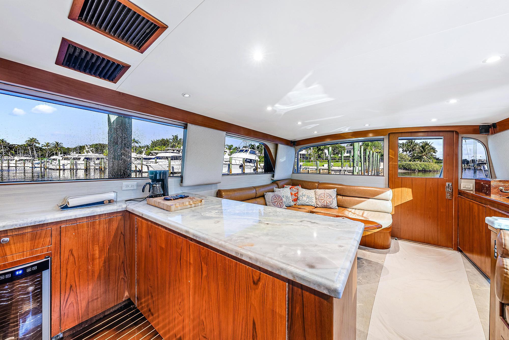 In 2019, significant updates were made, including the installation of new teak and holly flooring, a fresh headliner, updated wall coverings, and modern LED lighting. Additionally, convenient features were added, such as d the installation of a stackable washer and dryer, further enhancing the functionality and convenience of the space.