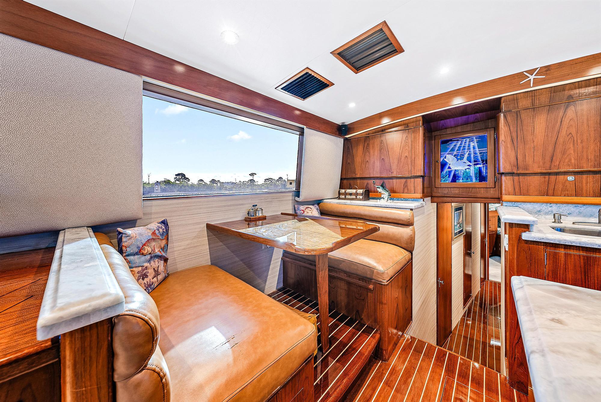Ascending three steps towards the aft end of the vessel, you'll find yourself in the salon, where the galley sits to starboard and the dinette to port, both positioned towards the forward section. An expansive L-shaped sofa occupies the starboard side, providing comfortable seating arrangements, while custom cabinetry to port houses a flat-screen TV on a hi-lo electric actuator. Access to the cockpit is facilitated by a convenient sliding door.