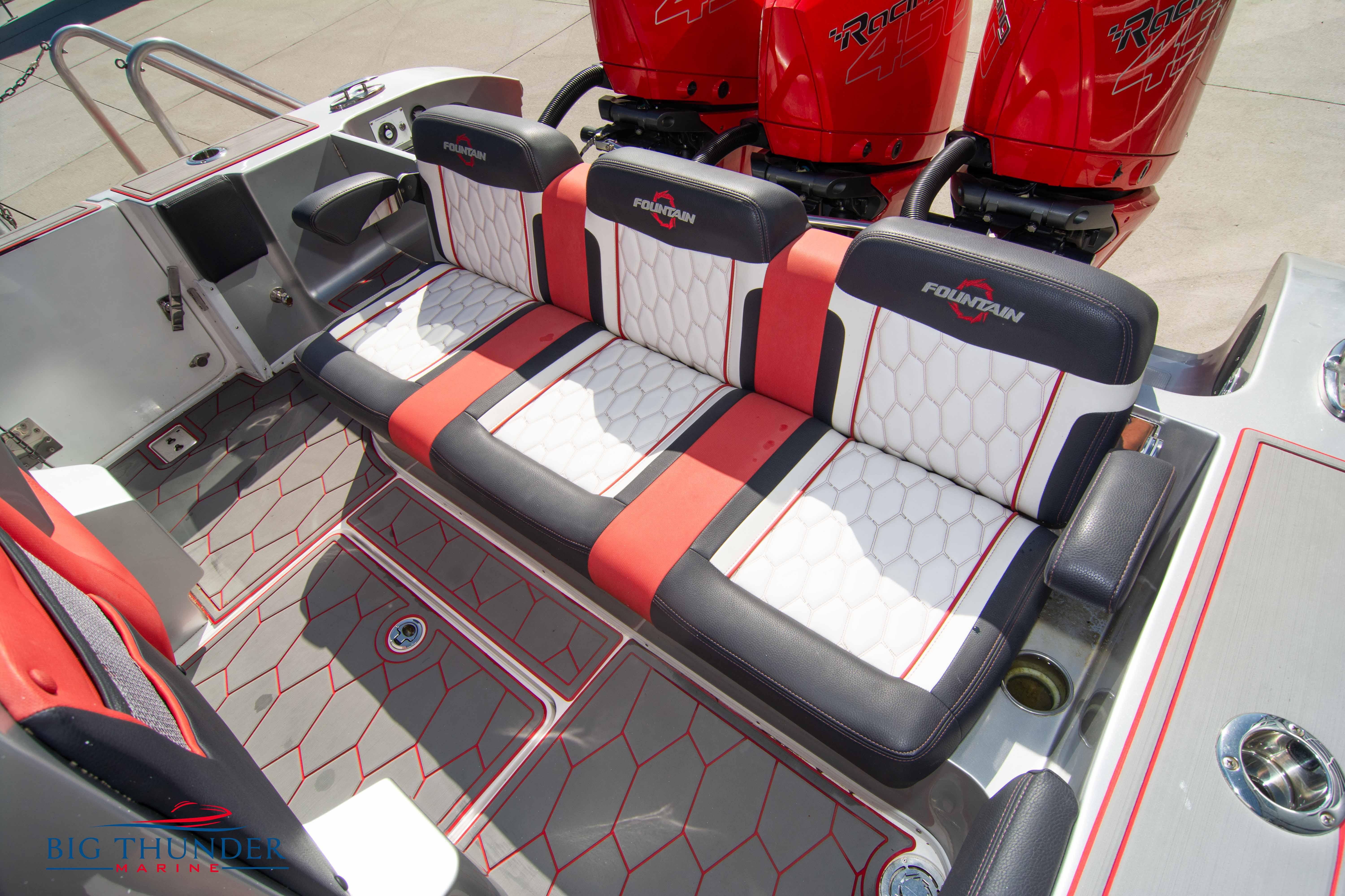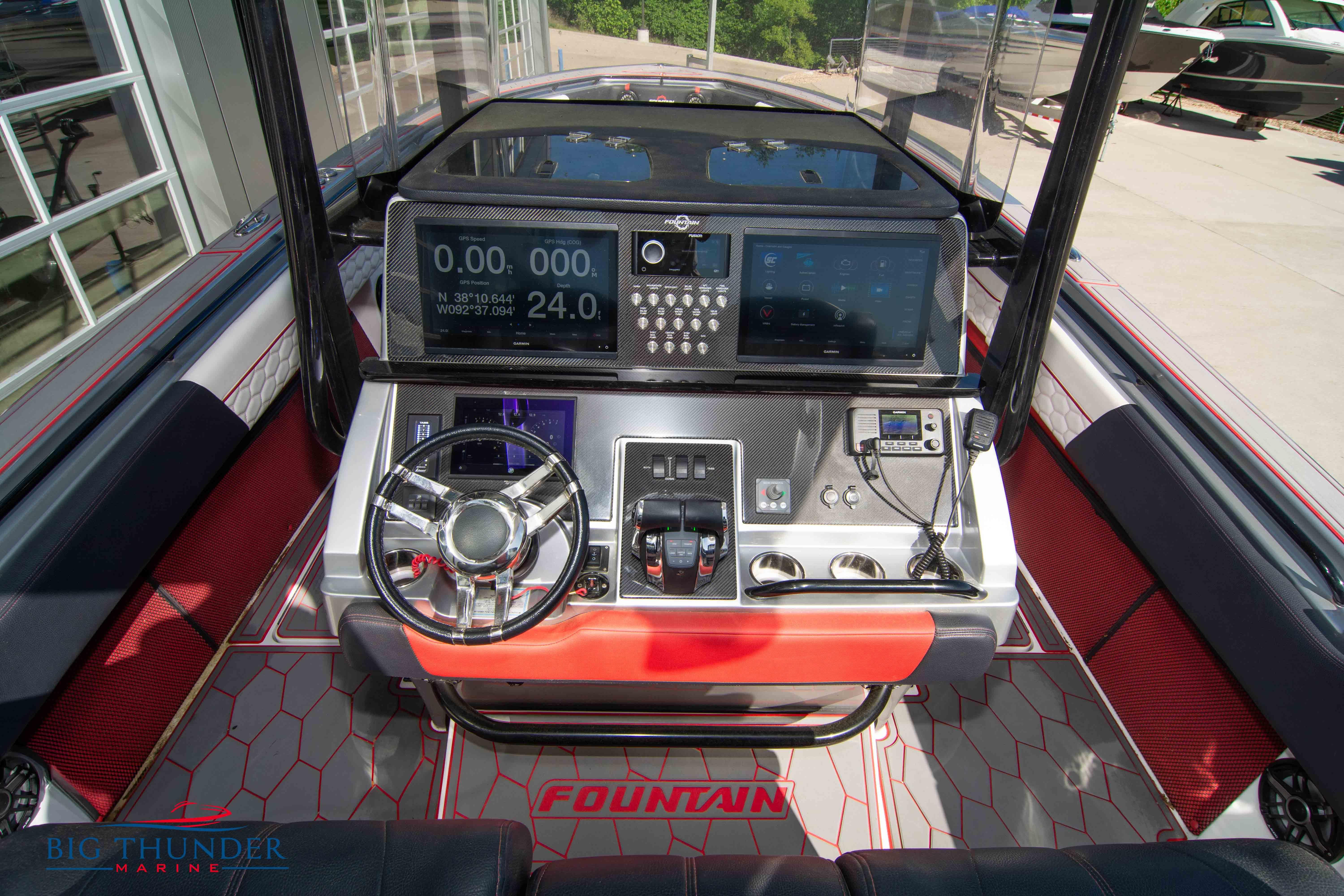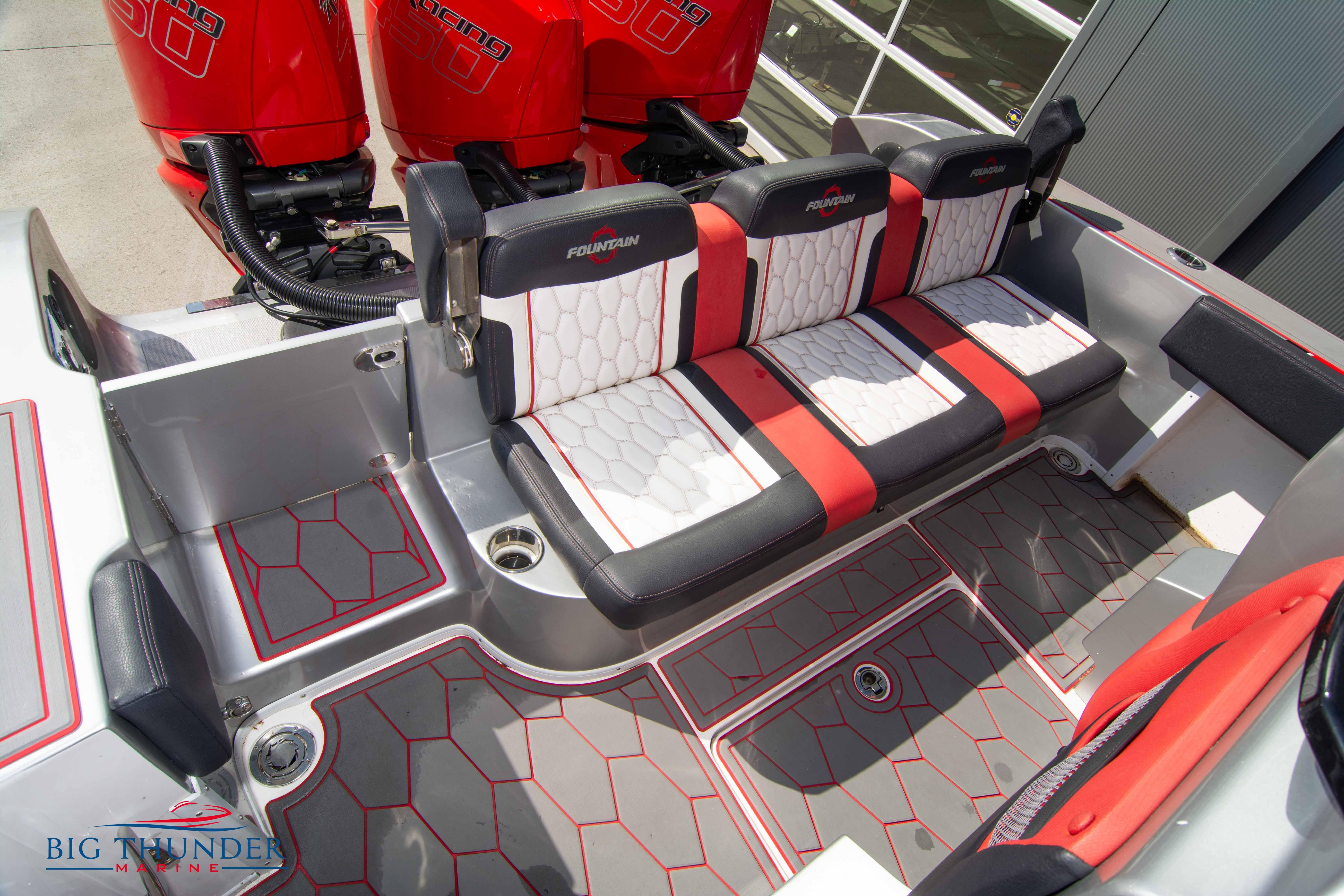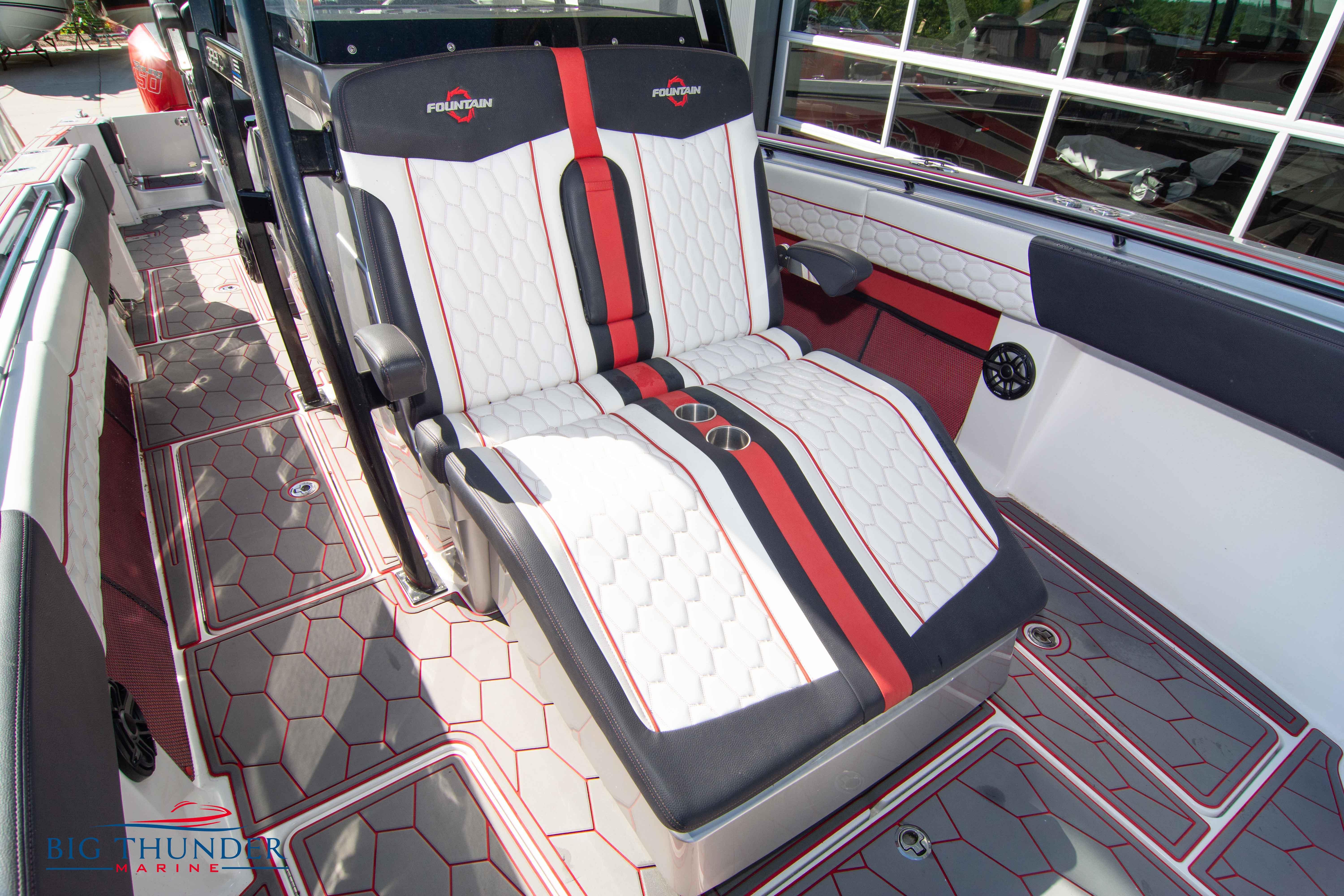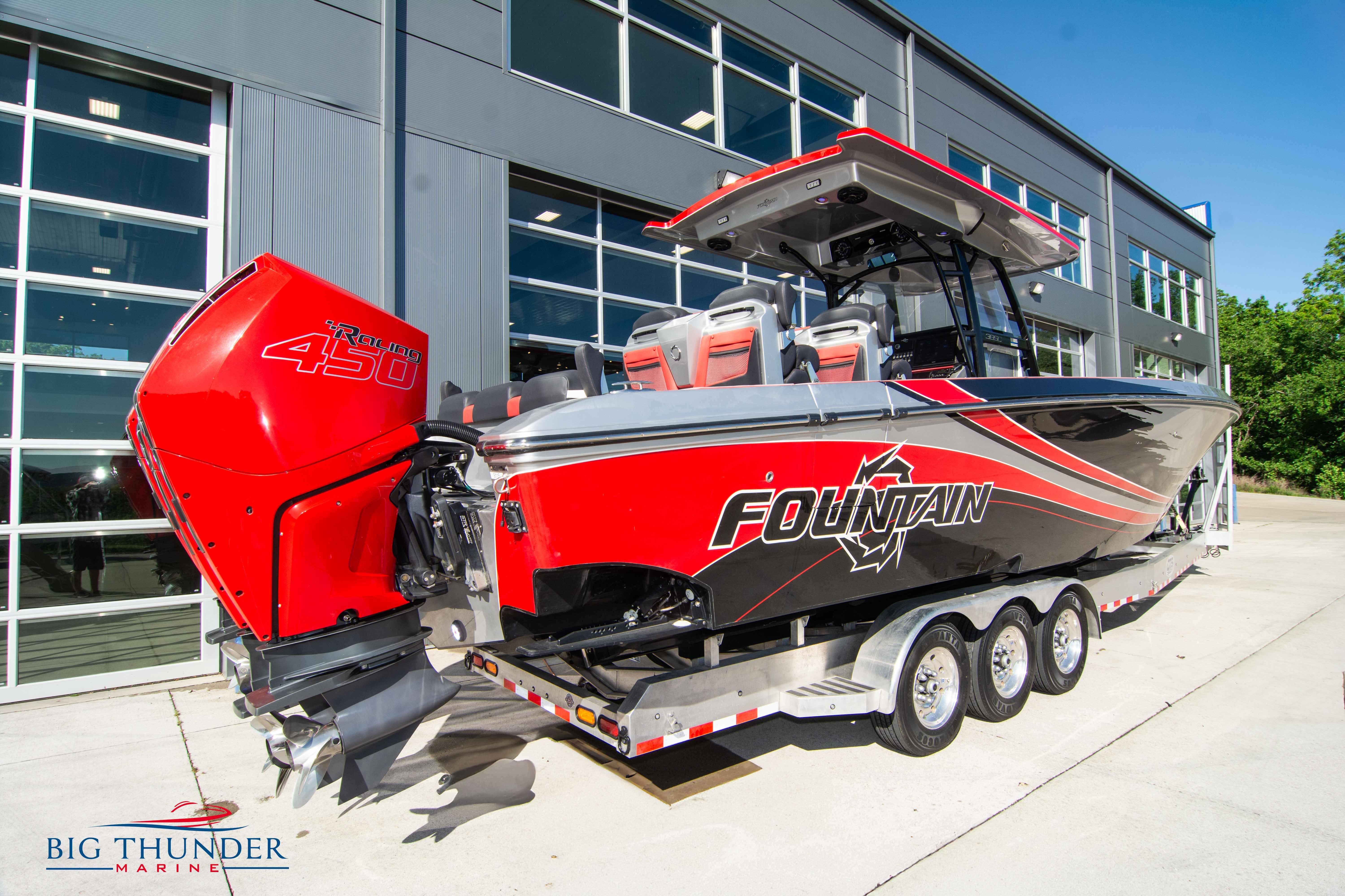 2021 Fountain 38 SC Triple Paint Matched Mercury Racing 450R Verado's (373 hours). Reverso Automatic Engine Flushing System. Custom Paint & Graphics w/ Matching Console, Helm, & T-Top. Hard Top SeaDek Insert. Livorsi 1150 Hydraulic Trim Tabs. Bow Thruster. Thru Hull Anchor Windlass/Rode Kit, Striker Plate, Polished SS Plow, 15’ of 5/16"" Galvanized Chain, 150’ of 5/8"" 8-Strand Braided Rope. Black Cool Touch Interior Vinyl Upholstery w/ White Alpah Quilted Panels, Bright Red Hitch Accents & Piping, White Hex Pattern Stitching & Dark Gray Embroidered Logos. Stitched Sport Leather Steering Wheel. Additional USB Outlet in Dash. Screened Portlight. Starboard Side Cockpit Dive Door w/ Ladder. Shadow-Caster RGB Cockpit & Underwater Lighting Control System. Garmin xHD 24" Dome Radar. Dual GPSMap 8616 16" Displays. Vessel View 903 Engine Monitoring Display. Garmin 215 AIS VHF w/ Antenna. Premium Audio System (Fusion Touchscreen Entertainment Center w/ Built In WiFi, (4) JL 6.5 LED Spkrs., (6) 7.7 LED Spkrs., (2) 8.8 LED Spkrs., (4) 10"" Subs, (2) 600W 6 Ch Amps & (2) 600W Mono Block Amps). (2) Additional 7.7" Bow Speakers w/ Upgraded Amp. Wireless Stereo Remote. Double Row Stand Up Helm Bolsters w/ (2) Additional Subwoofers. Additional 20 Gal. Fresh Water Tank (30 Gal. Total)Trailer not included, new trailer quotes available separate. Financing and nationwide delivery also available, all 2005 and newer model year trades considered. Call for more info and demo scheduling.DisclaimerThe Company offers the details of this vessel in good faith but cannot guarantee or warrant the accuracy of this information nor warrant the condition of the vessel. A buyer should instruct his agents, or his surveyors, to investigate such details as the buyer desires validated. This vessel is offered subject to prior sale, price change, or withdrawal without notice.