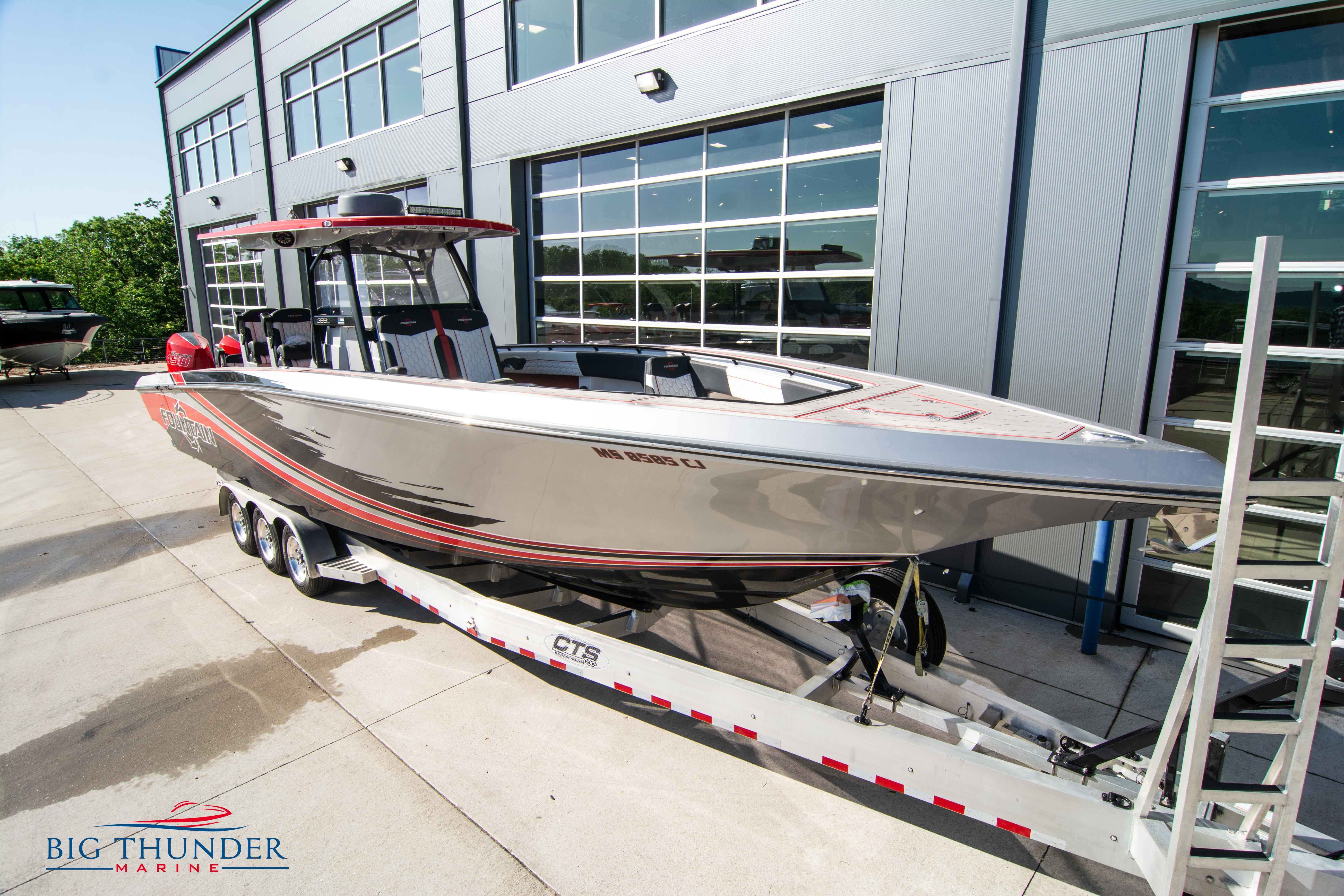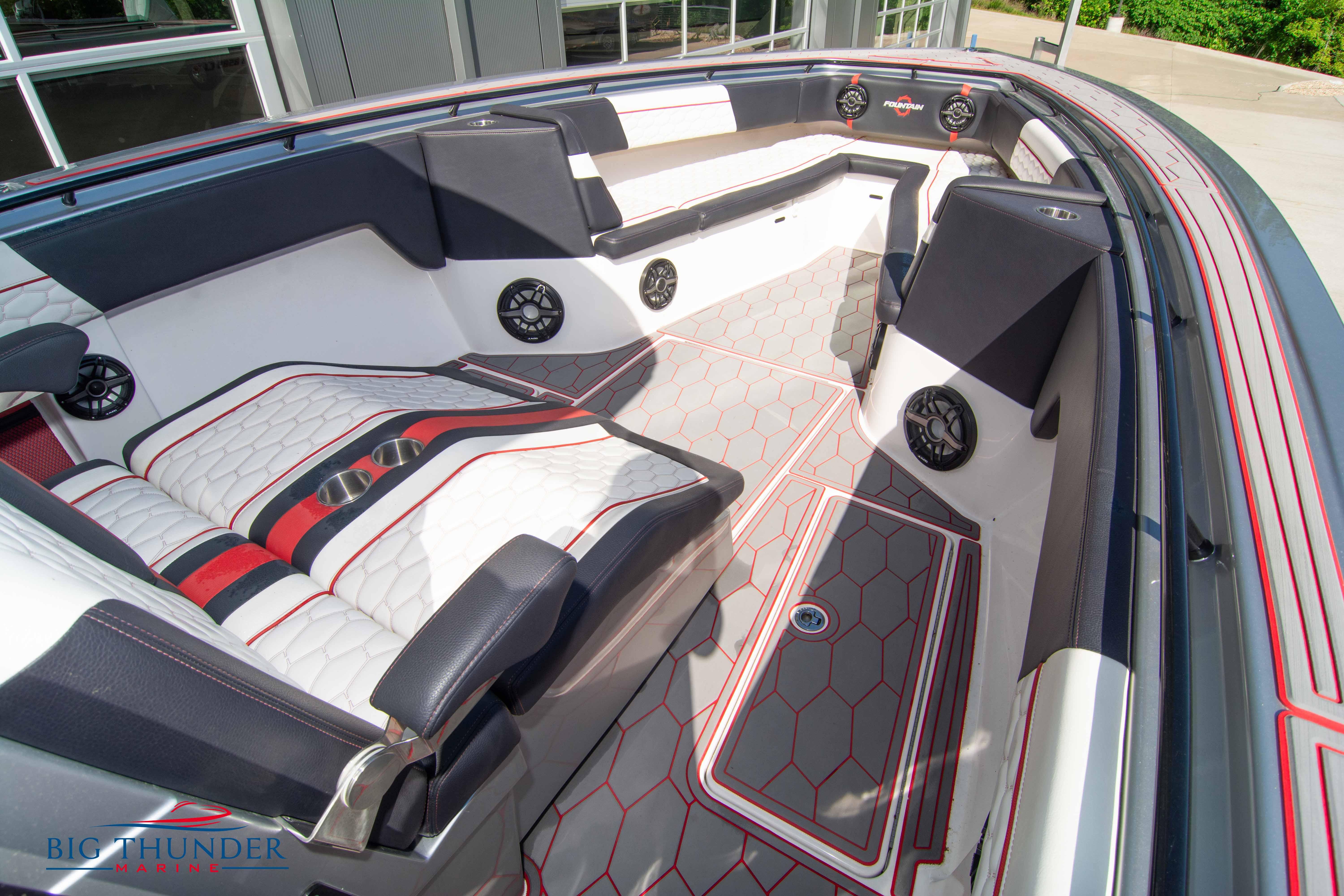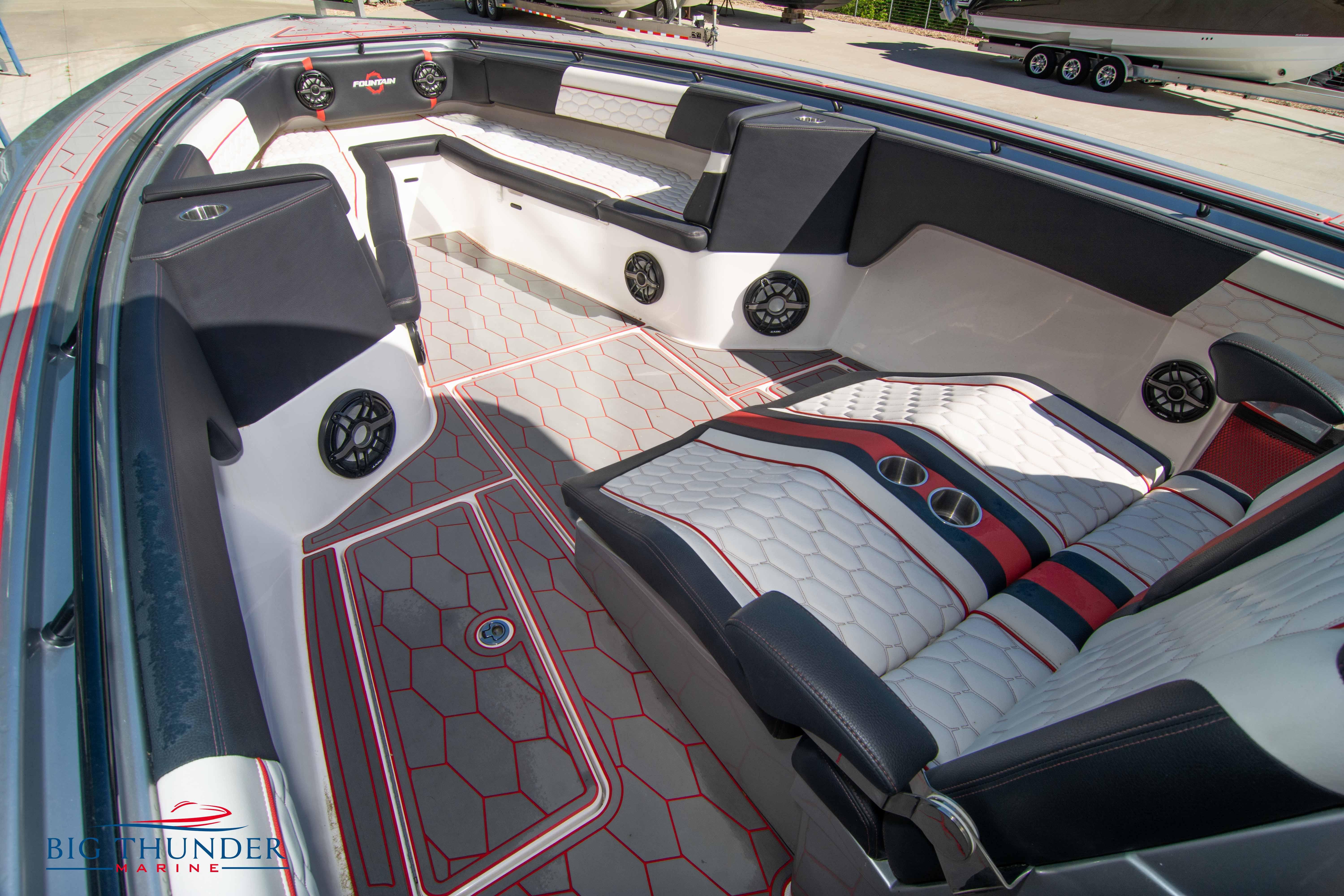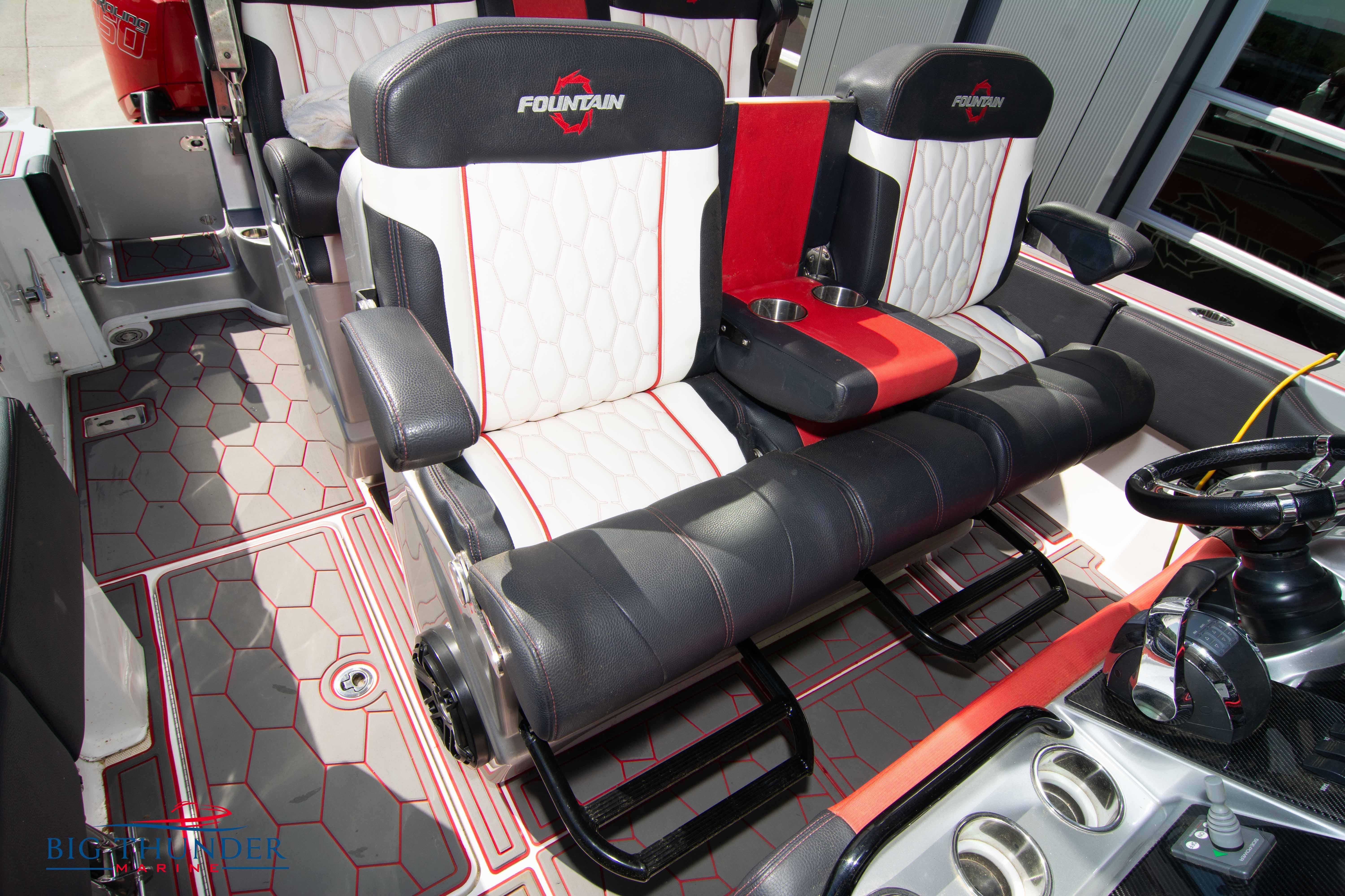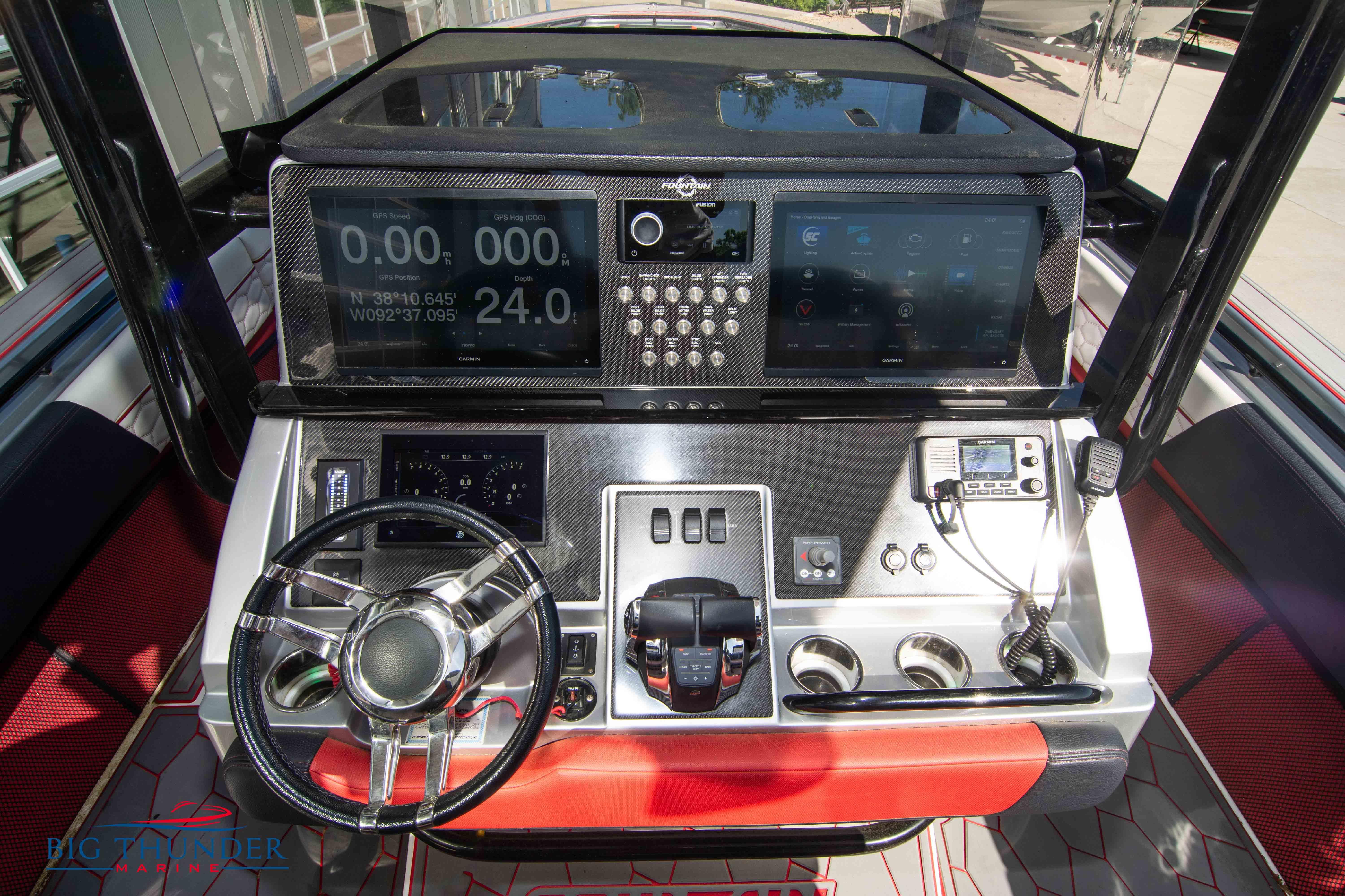 2021 Fountain 38 SC Triple Paint Matched Mercury Racing 450R Verado's (373 hours). Reverso Automatic Engine Flushing System. Custom Paint & Graphics w/ Matching Console, Helm, & T-Top. Hard Top SeaDek Insert. Livorsi 1150 Hydraulic Trim Tabs. Bow Thruster. Thru Hull Anchor Windlass/Rode Kit, Striker Plate, Polished SS Plow, 15’ of 5/16"" Galvanized Chain, 150’ of 5/8"" 8-Strand Braided Rope. Black Cool Touch Interior Vinyl Upholstery w/ White Alpah Quilted Panels, Bright Red Hitch Accents & Piping, White Hex Pattern Stitching & Dark Gray Embroidered Logos. Stitched Sport Leather Steering Wheel. Additional USB Outlet in Dash. Screened Portlight. Starboard Side Cockpit Dive Door w/ Ladder. Shadow-Caster RGB Cockpit & Underwater Lighting Control System. Garmin xHD 24" Dome Radar. Dual GPSMap 8616 16" Displays. Vessel View 903 Engine Monitoring Display. Garmin 215 AIS VHF w/ Antenna. Premium Audio System (Fusion Touchscreen Entertainment Center w/ Built In WiFi, (4) JL 6.5 LED Spkrs., (6) 7.7 LED Spkrs., (2) 8.8 LED Spkrs., (4) 10"" Subs, (2) 600W 6 Ch Amps & (2) 600W Mono Block Amps). (2) Additional 7.7" Bow Speakers w/ Upgraded Amp. Wireless Stereo Remote. Double Row Stand Up Helm Bolsters w/ (2) Additional Subwoofers. Additional 20 Gal. Fresh Water Tank (30 Gal. Total)Trailer not included, new trailer quotes available separate. Financing and nationwide delivery also available, all 2005 and newer model year trades considered. Call for more info and demo scheduling.DisclaimerThe Company offers the details of this vessel in good faith but cannot guarantee or warrant the accuracy of this information nor warrant the condition of the vessel. A buyer should instruct his agents, or his surveyors, to investigate such details as the buyer desires validated. This vessel is offered subject to prior sale, price change, or withdrawal without notice.