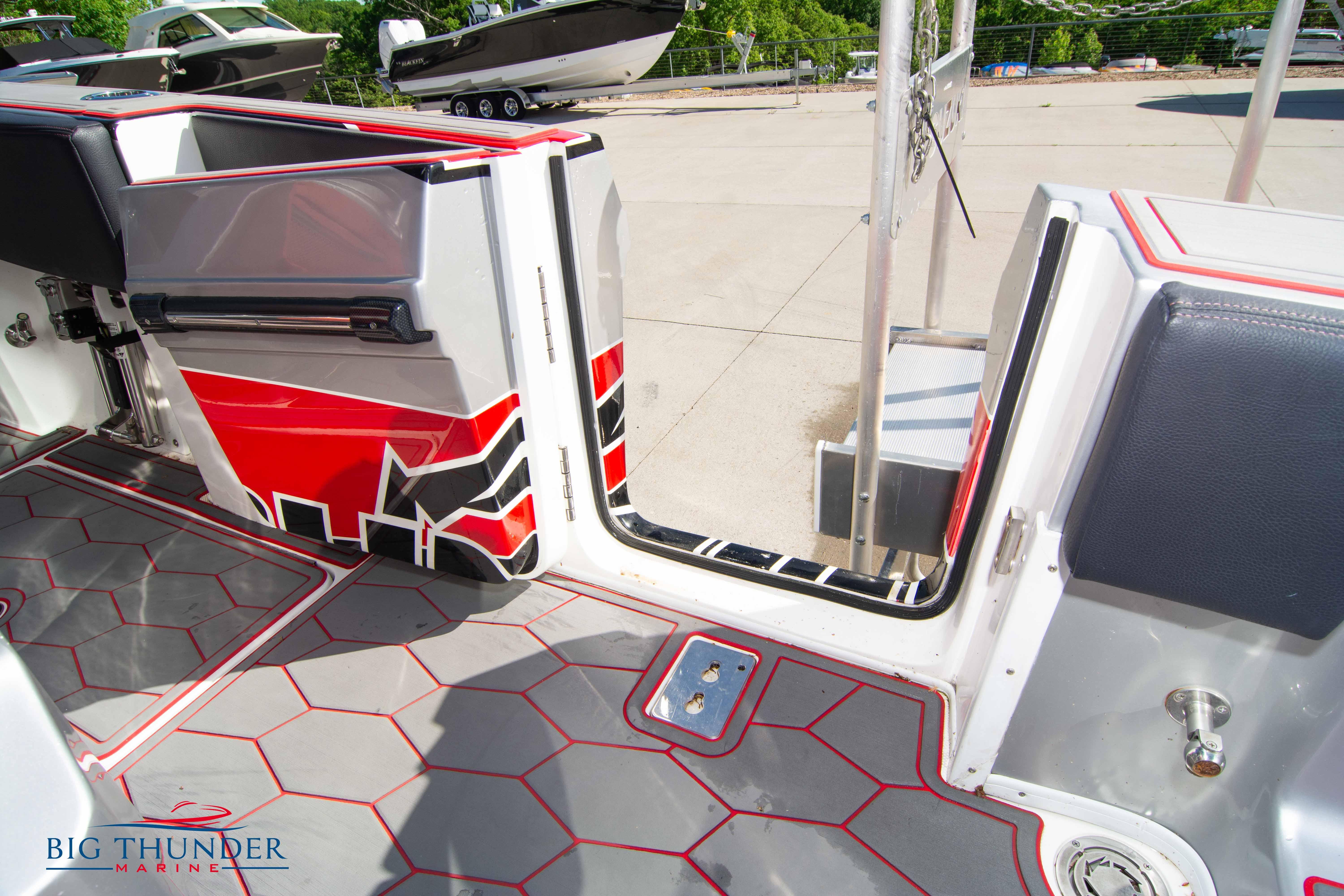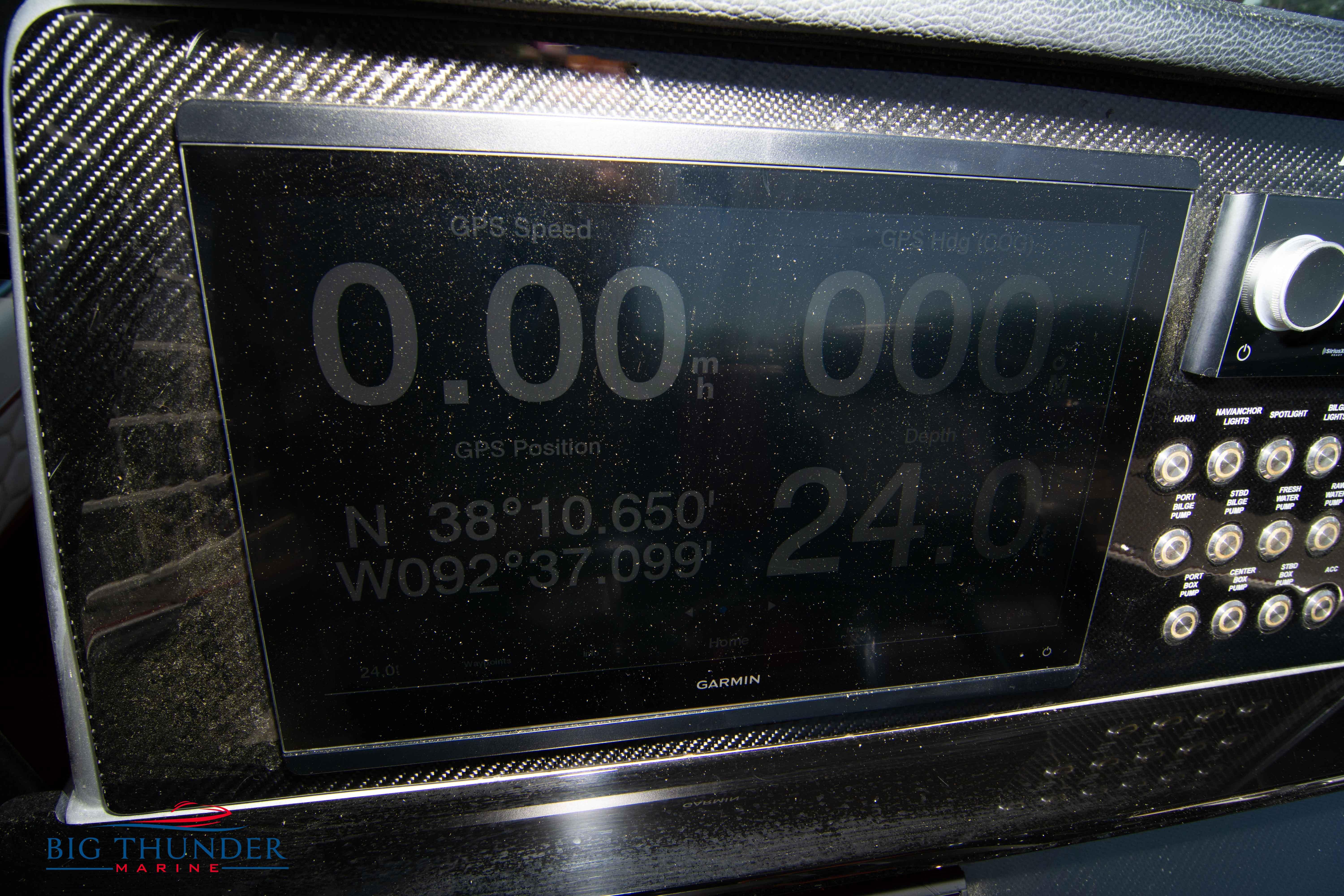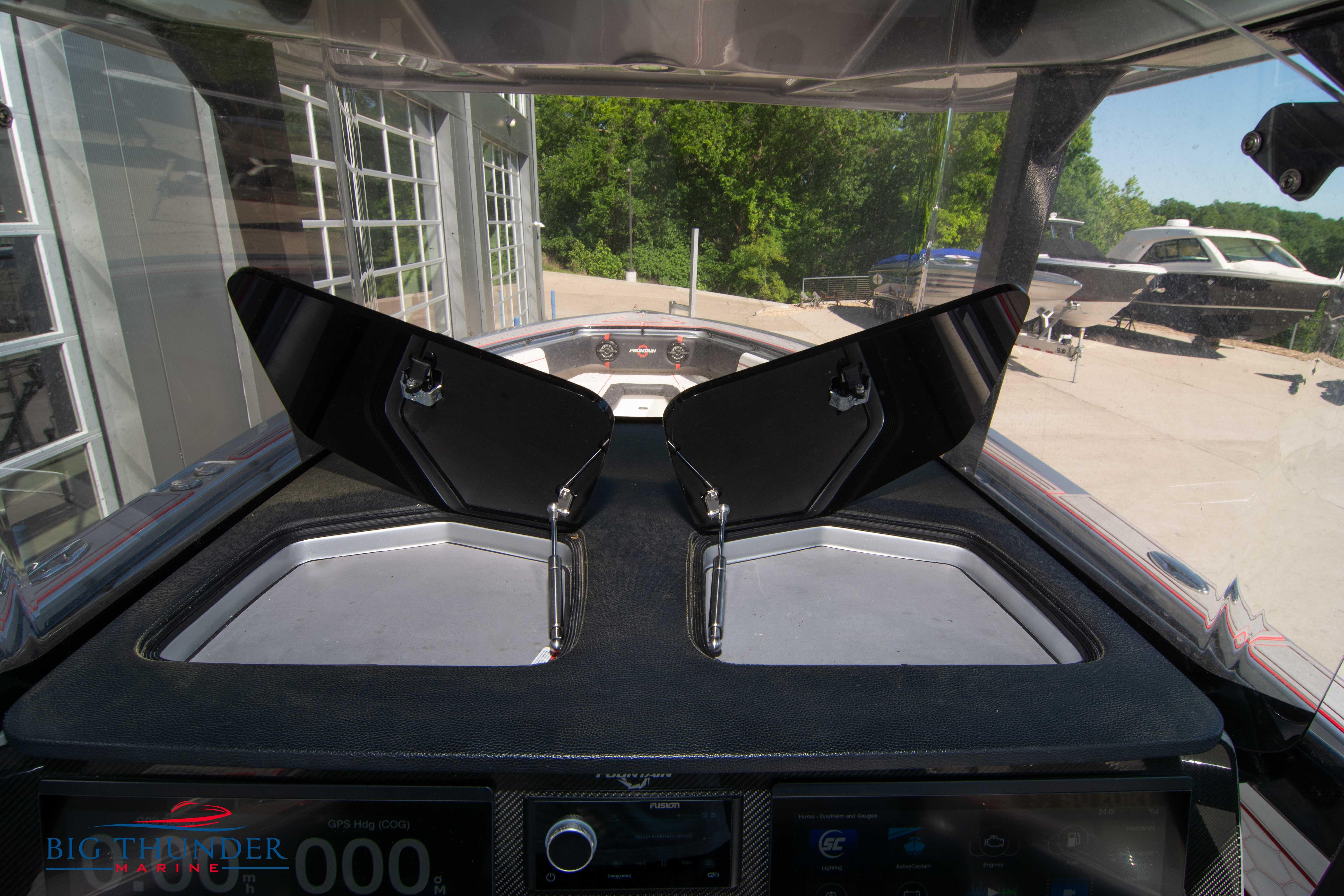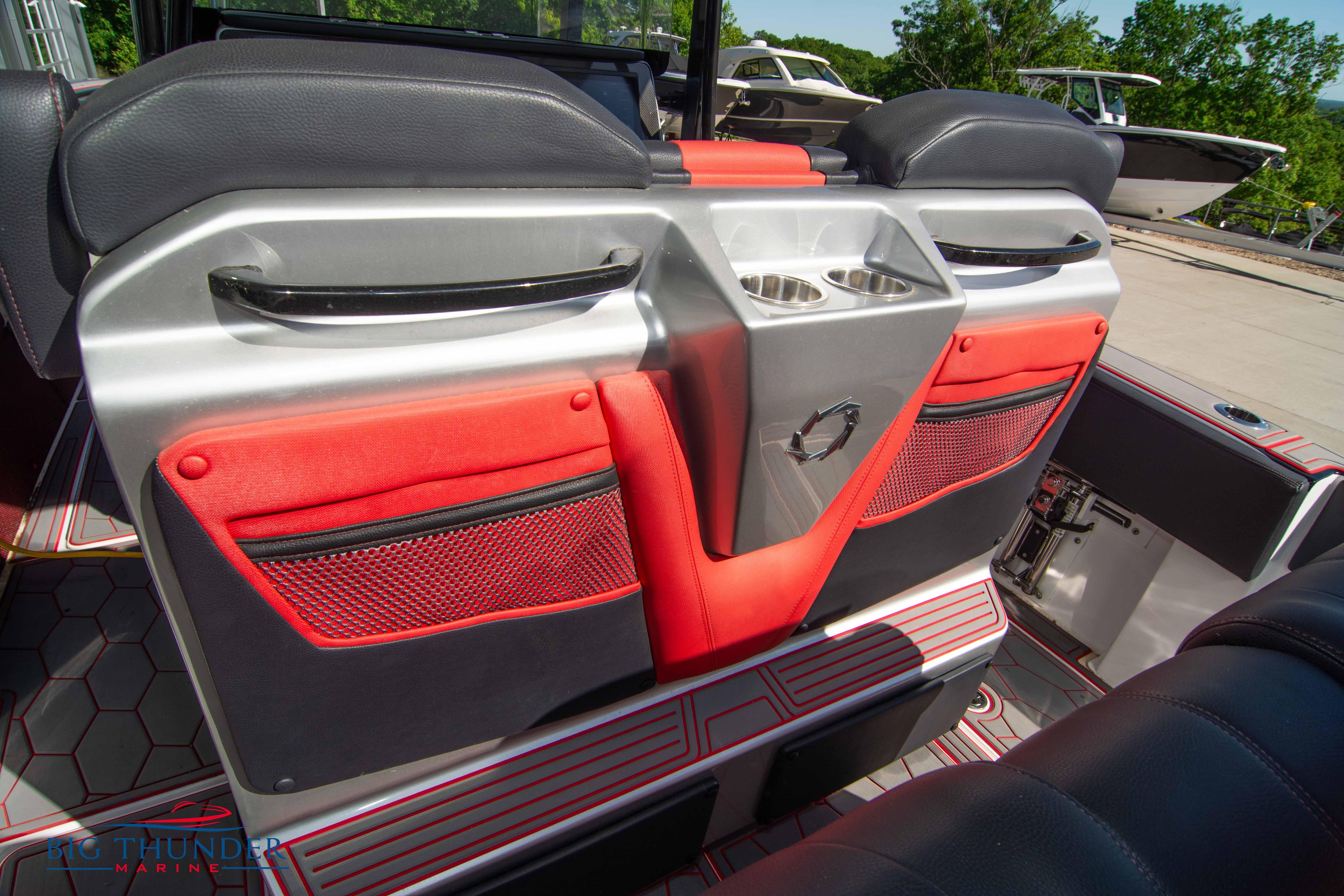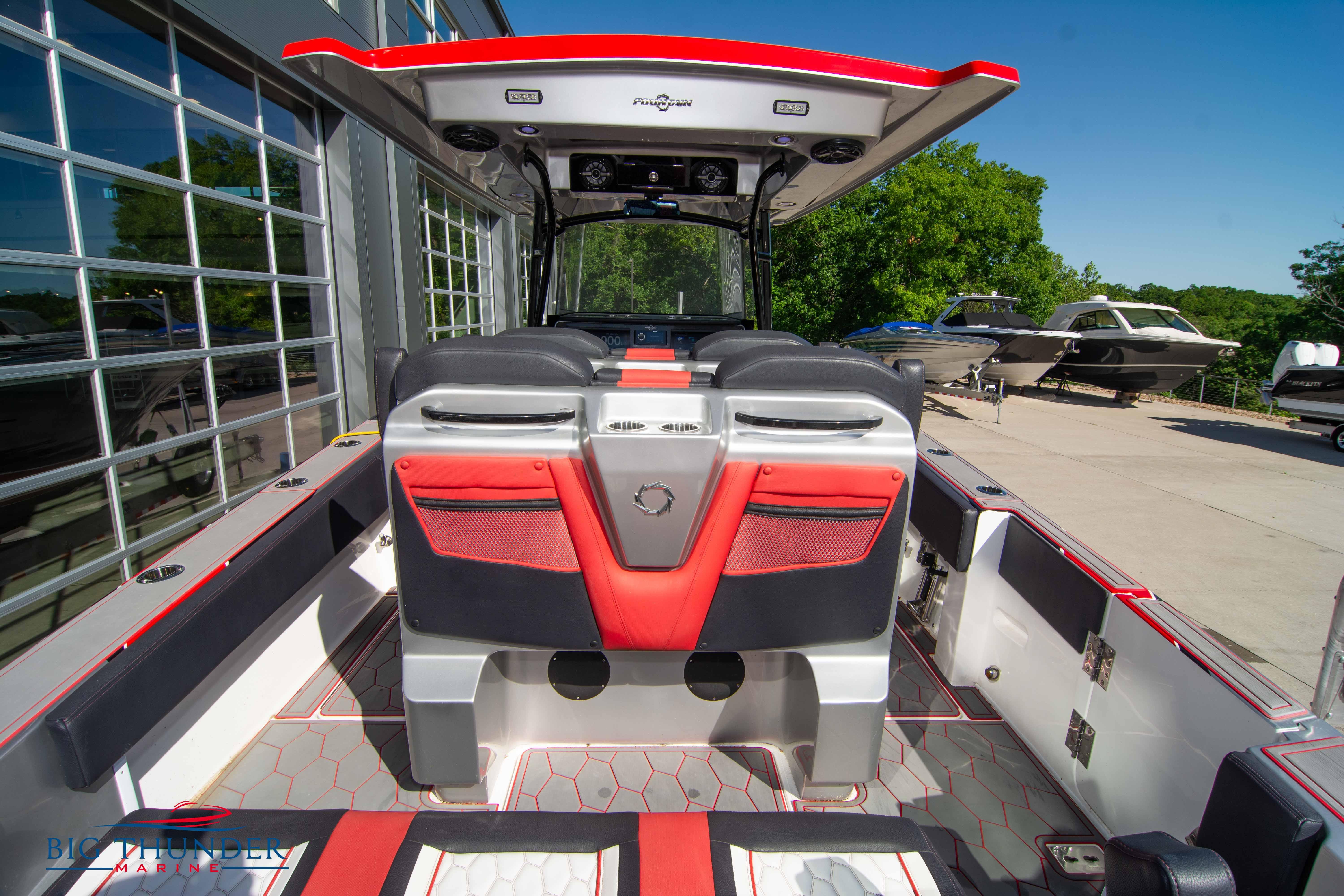2021 Fountain 38 SC Triple Paint Matched Mercury Racing 450R Verado's (373 hours). Reverso Automatic Engine Flushing System. Custom Paint & Graphics w/ Matching Console, Helm, & T-Top. Hard Top SeaDek Insert. Livorsi 1150 Hydraulic Trim Tabs. Bow Thruster. Thru Hull Anchor Windlass/Rode Kit, Striker Plate, Polished SS Plow, 15’ of 5/16"" Galvanized Chain, 150’ of 5/8"" 8-Strand Braided Rope. Black Cool Touch Interior Vinyl Upholstery w/ White Alpah Quilted Panels, Bright Red Hitch Accents & Piping, White Hex Pattern Stitching & Dark Gray Embroidered Logos. Stitched Sport Leather Steering Wheel. Additional USB Outlet in Dash. Screened Portlight. Starboard Side Cockpit Dive Door w/ Ladder. Shadow-Caster RGB Cockpit & Underwater Lighting Control System. Garmin xHD 24" Dome Radar. Dual GPSMap 8616 16" Displays. Vessel View 903 Engine Monitoring Display. Garmin 215 AIS VHF w/ Antenna. Premium Audio System (Fusion Touchscreen Entertainment Center w/ Built In WiFi, (4) JL 6.5 LED Spkrs., (6) 7.7 LED Spkrs., (2) 8.8 LED Spkrs., (4) 10"" Subs, (2) 600W 6 Ch Amps & (2) 600W Mono Block Amps). (2) Additional 7.7" Bow Speakers w/ Upgraded Amp. Wireless Stereo Remote. Double Row Stand Up Helm Bolsters w/ (2) Additional Subwoofers. Additional 20 Gal. Fresh Water Tank (30 Gal. Total)Trailer not included, new trailer quotes available separate. Financing and nationwide delivery also available, all 2005 and newer model year trades considered. Call for more info and demo scheduling.DisclaimerThe Company offers the details of this vessel in good faith but cannot guarantee or warrant the accuracy of this information nor warrant the condition of the vessel. A buyer should instruct his agents, or his surveyors, to investigate such details as the buyer desires validated. This vessel is offered subject to prior sale, price change, or withdrawal without notice.