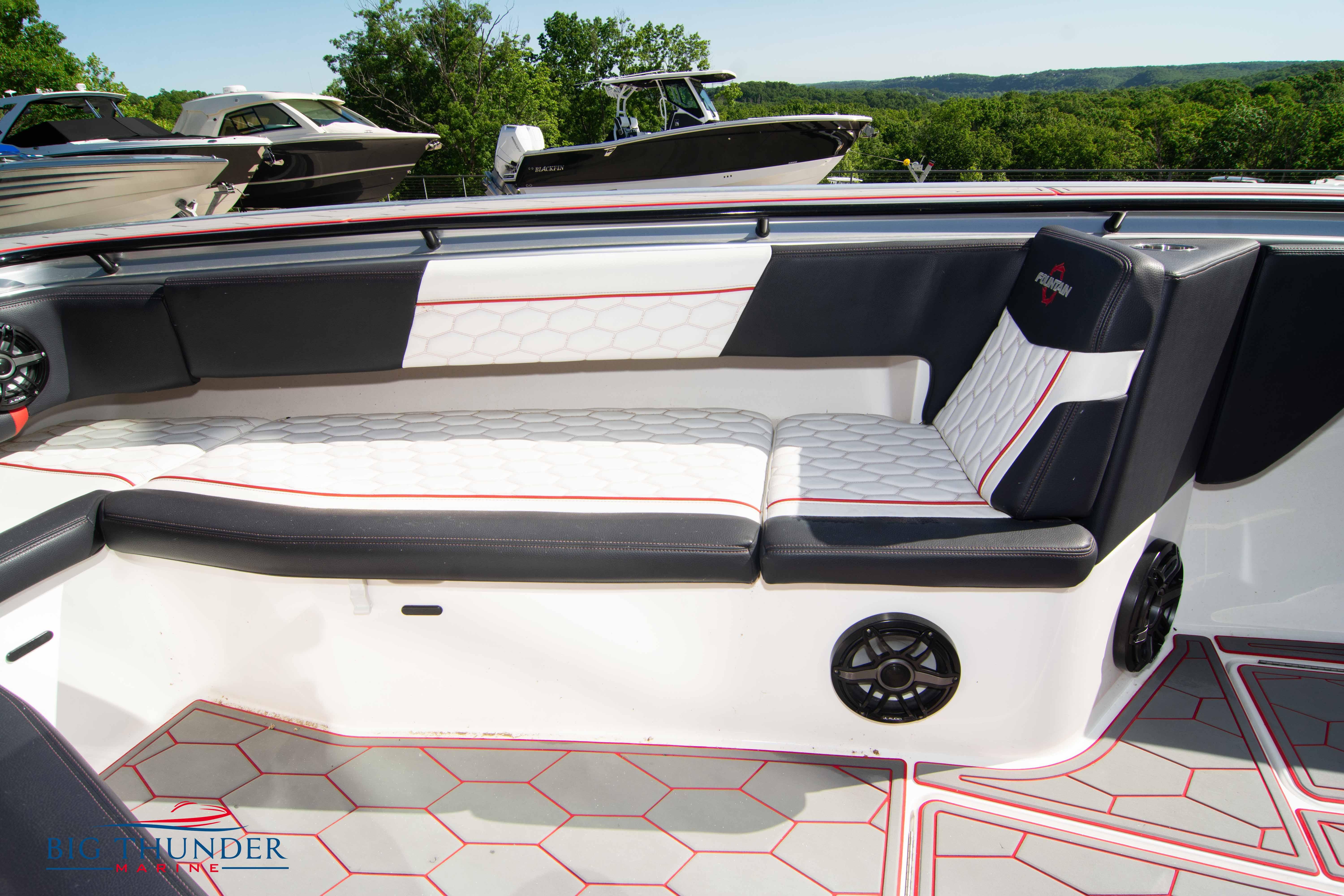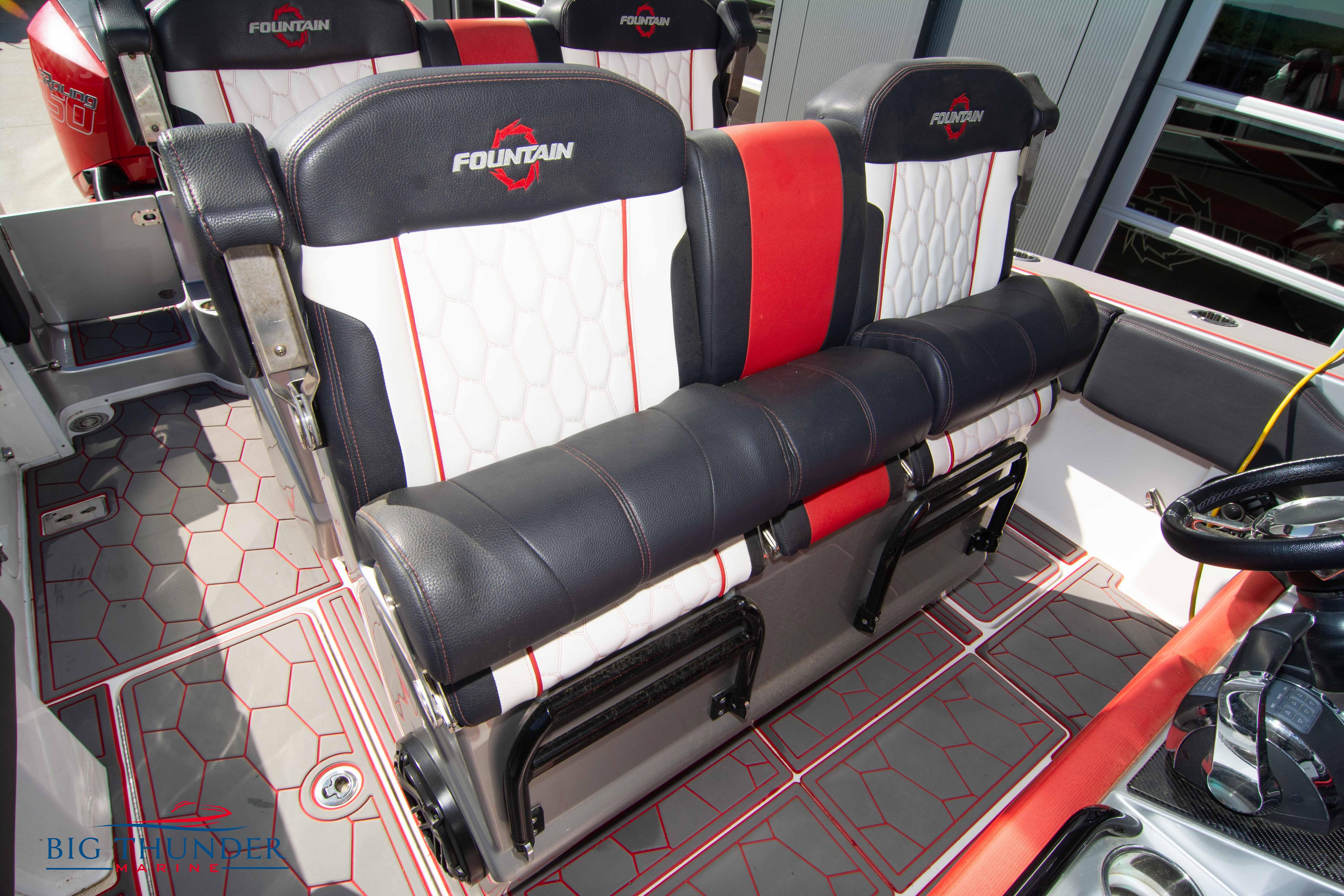 With the launch of the incredible 38SC, the next-generation of Fountain High Performance V-Bottoms is speeding on the scene. High performance boat buyers can now enjoy the roominess of a center console, the dependability of outboards and the top-end performance that has made Fountain the fastest name in boating for more than 40 years. Don't look now but with it's 100 mph top-end potential, the 38SC certainly must be considered the fastest stock center console under 40-feet on the water today. Bold graphics inside and out scream "speed." Premium Cool Touch upholstery with color coordinated thread showcase Fountain's incredible attention to detail.