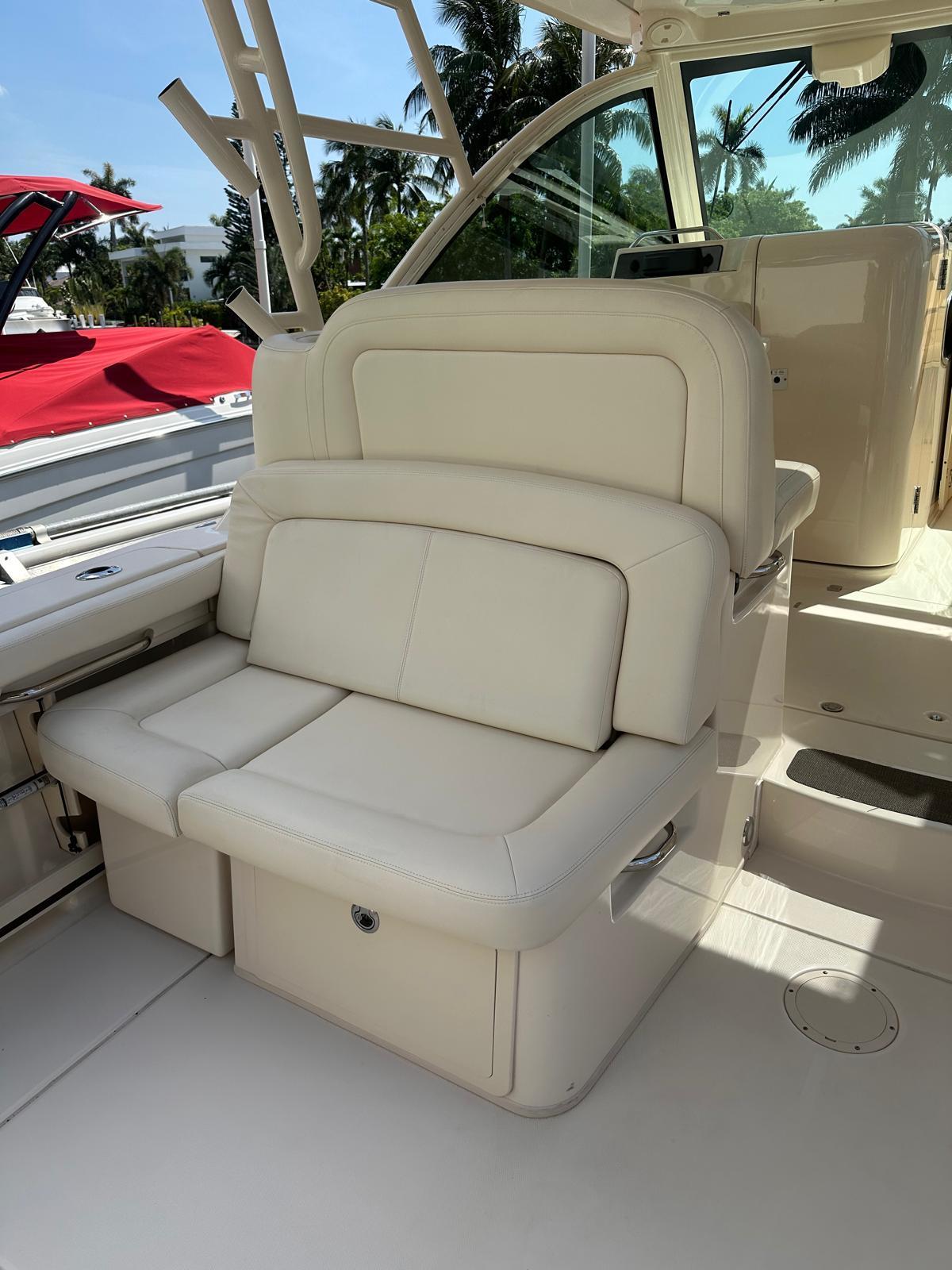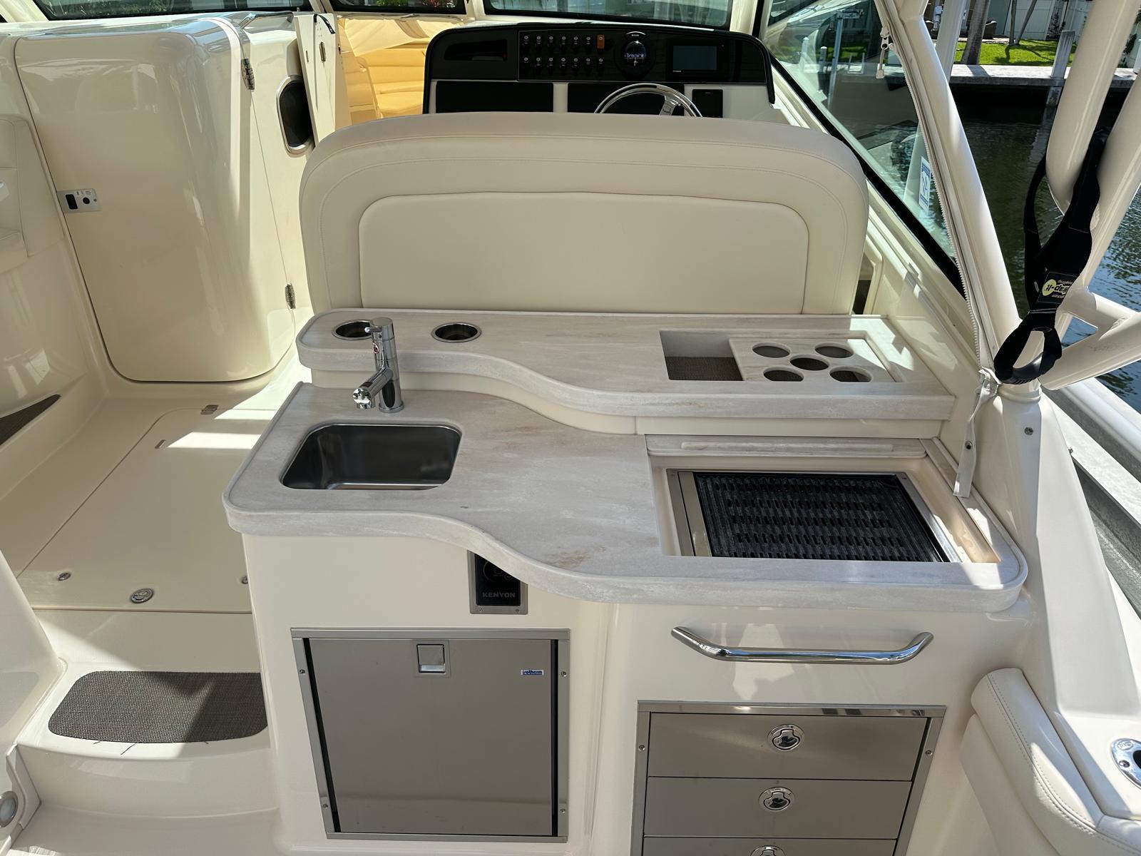 - Wet bar w/1300W grill, refrigerator, sink, storage drawers, trash bin, drink holders (2) & fire extinguisher holder (integrated with electronically adjustable helm seat)