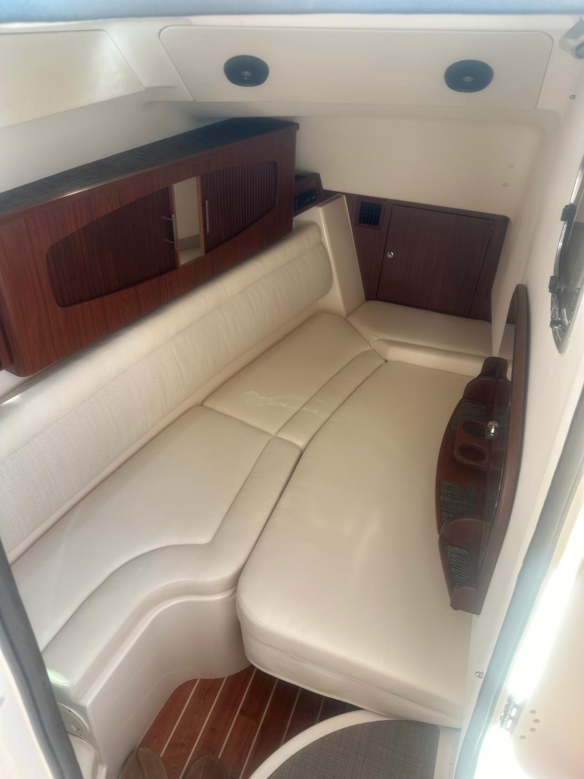 - Portside cabin console w/electronically operated sliding berth, aft berth, bench seat, cedar lined closet, drawers, flat screen 19" LED-LCD TV w/ DVD player & audio/visual inputs, mirror, lighting, tinted screened window & bulk storage