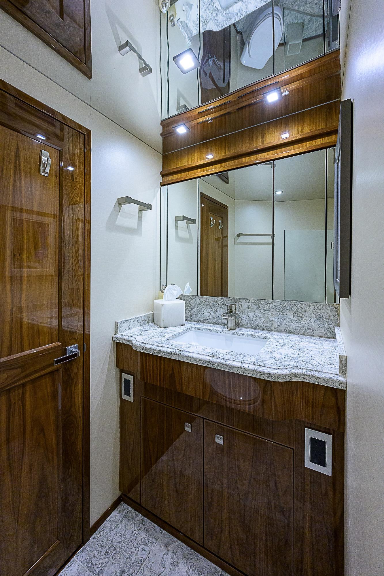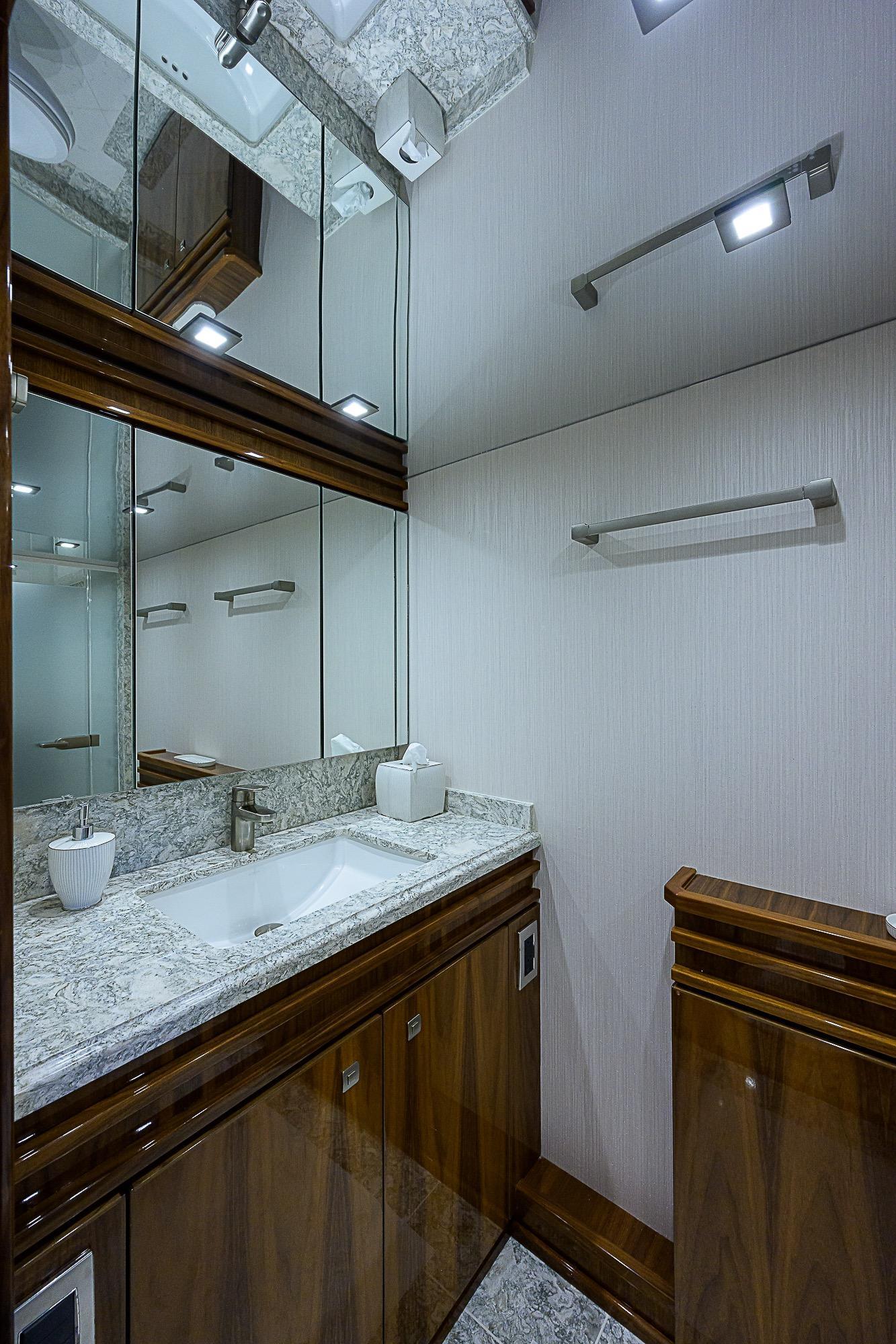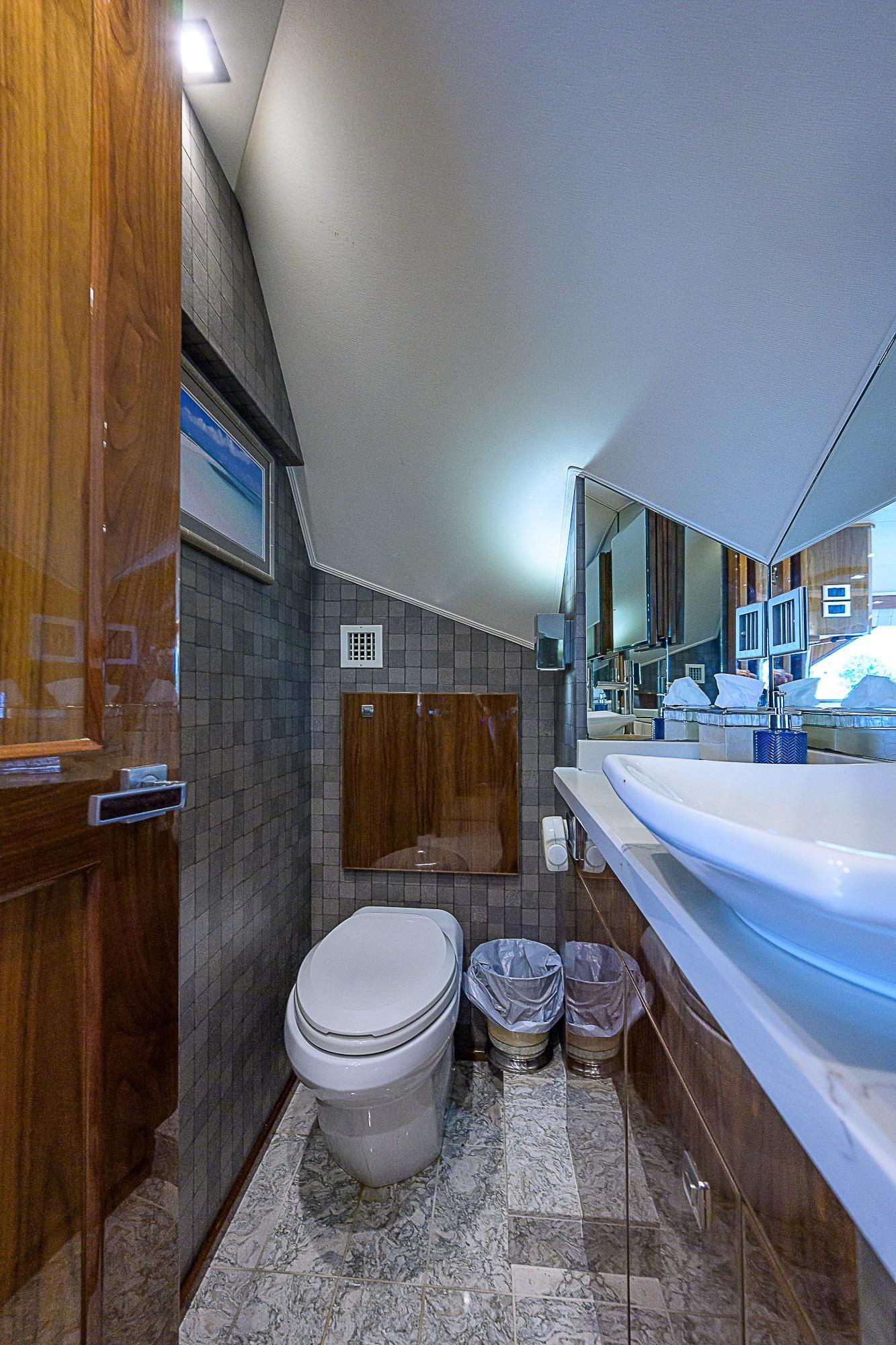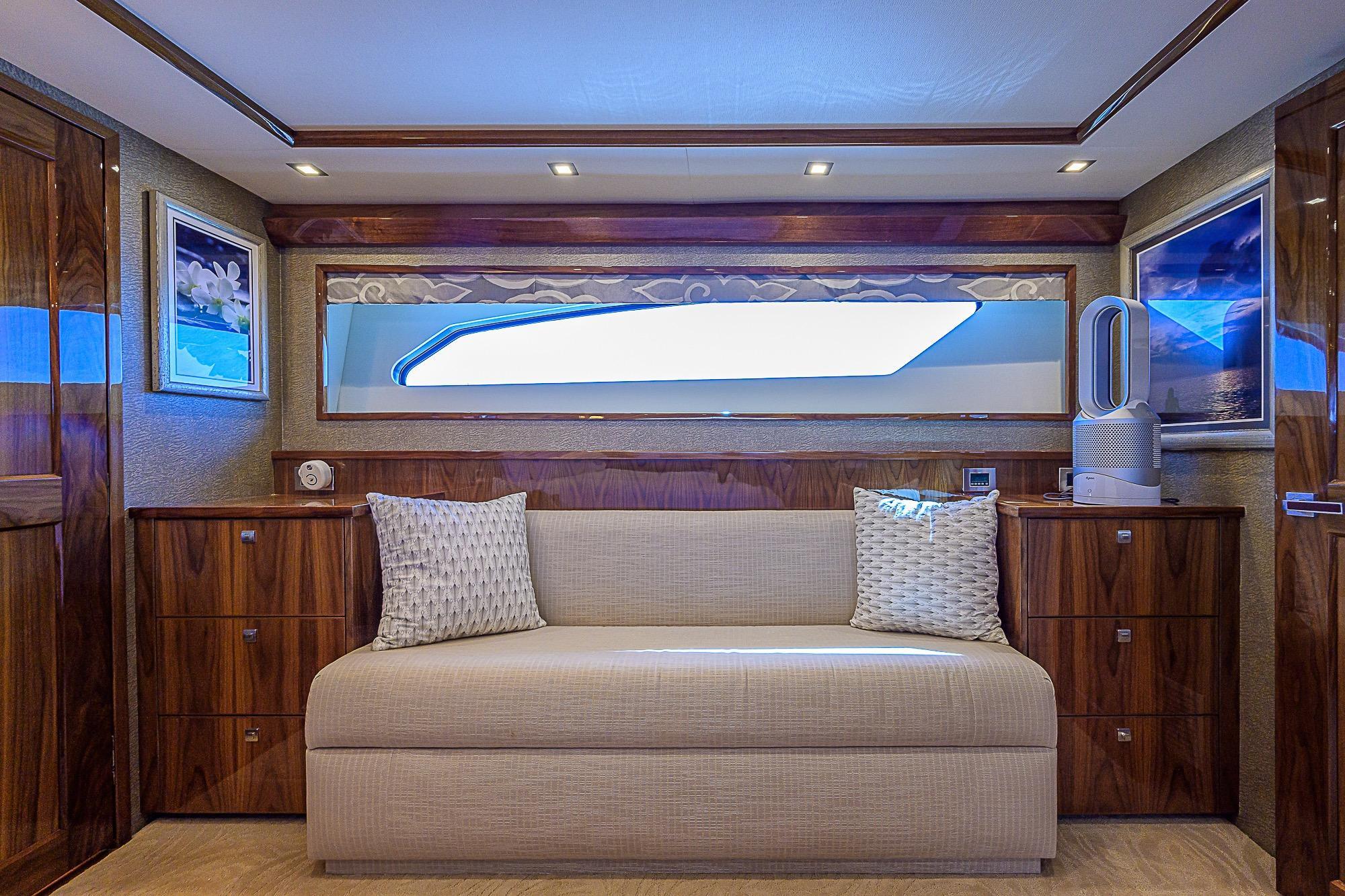 - Hull-side windows provide soothing natural lighting and overlook a vanity to starboard and a lounge to port