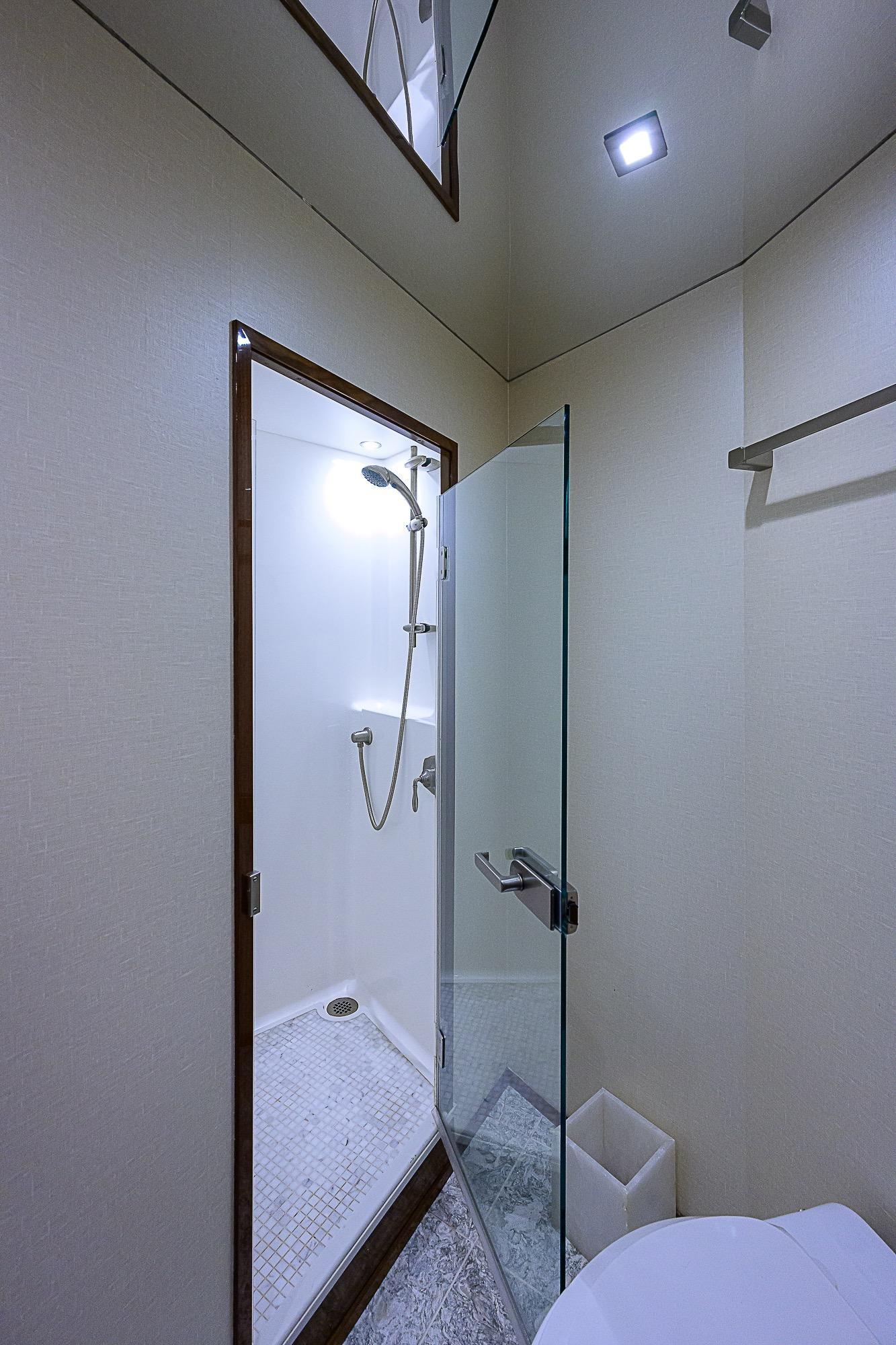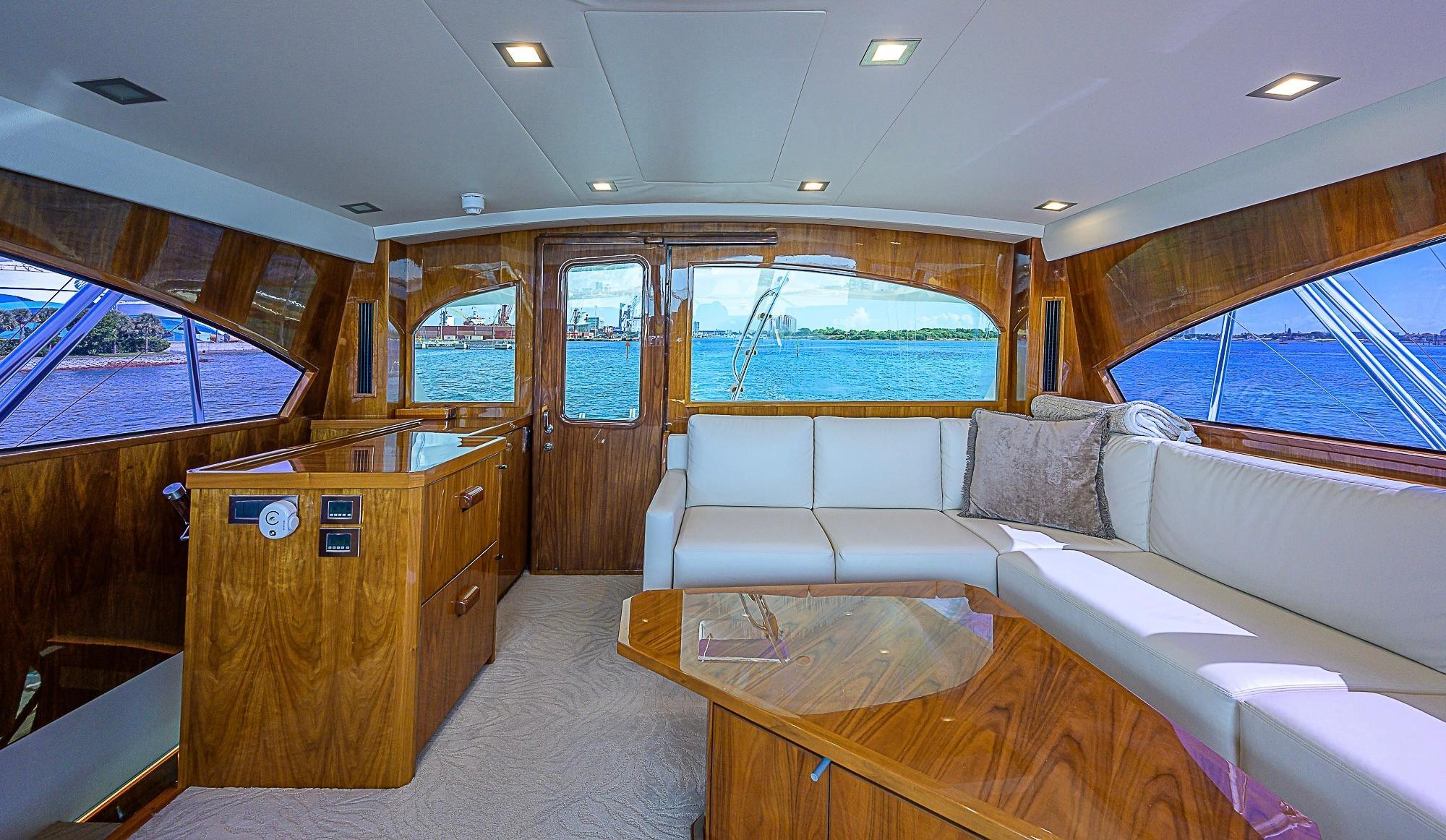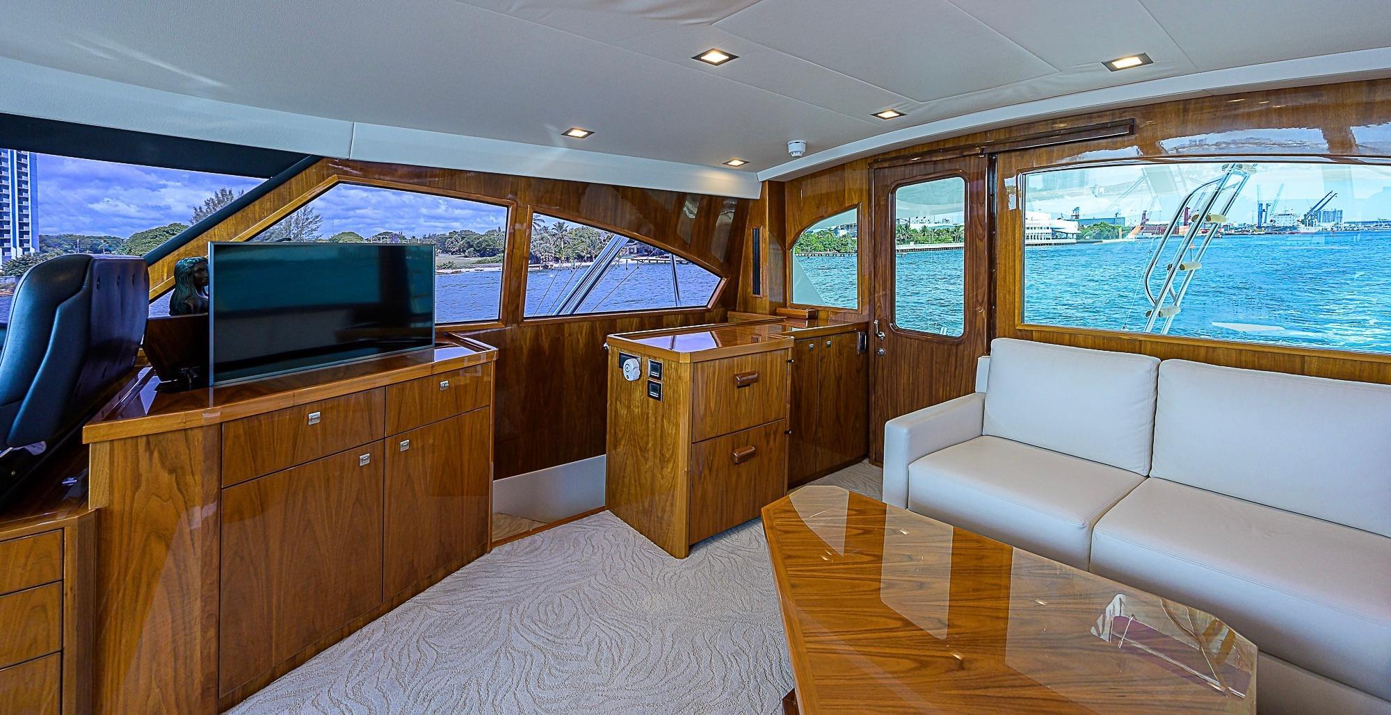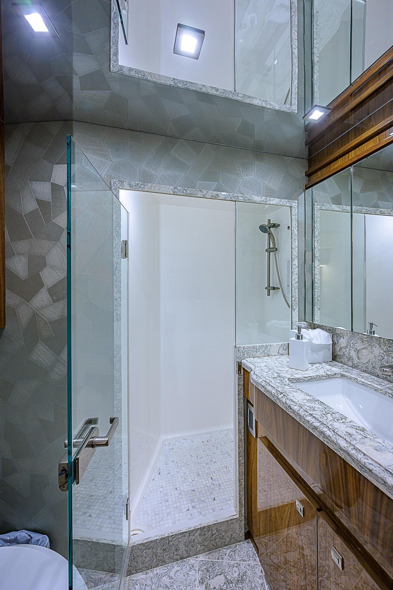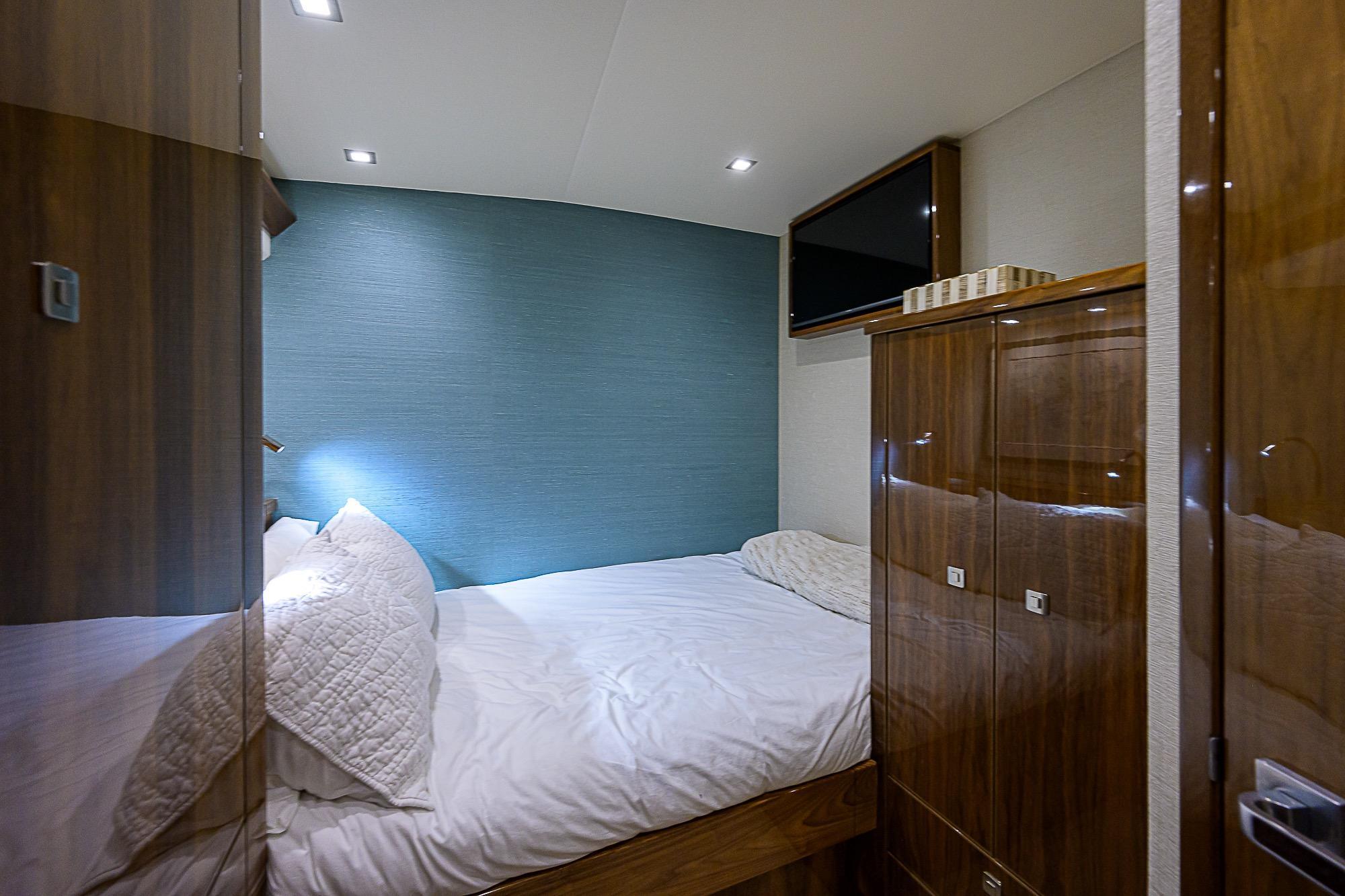 - Hull-side windows provide soothing natural lighting and overlook a vanity to starboard and a lounge to port