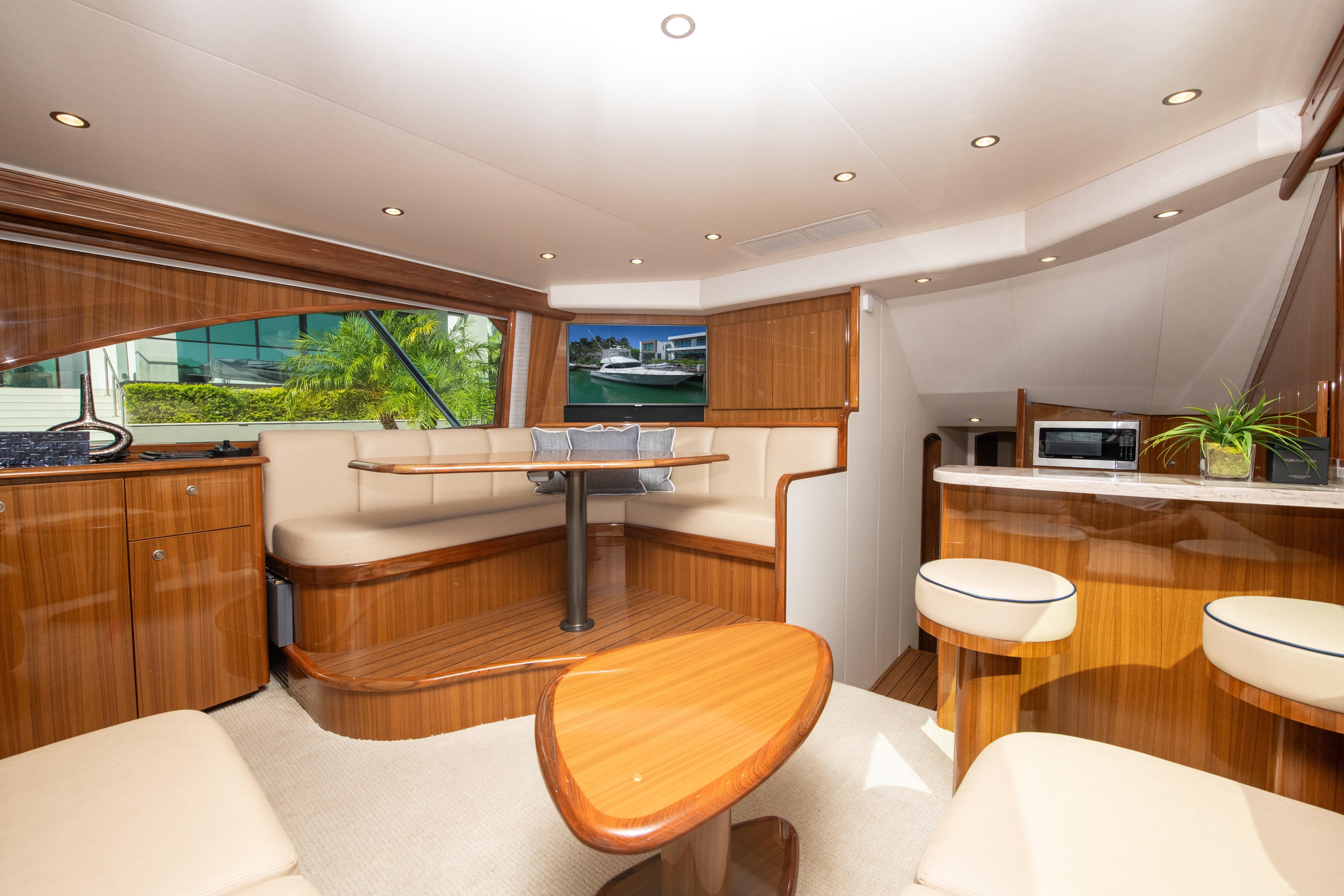The salon and galley are bathed in high-gloss teak, giving the interior a warm and inviting feel. The salon is large, air-conditioned, and appointed with comfortable seating, dining, and socializing areas. Relax in the L-shaped lounge to starboard with a teak hi-lo table. Forward to port is a raised dinette and settee against a teak bulkhead with cabinetry and a 40-inch flat-screen television. The starboard galley is one step down. Our space-saving split-level design allows for a Corian countertop with bar stools in the salon to increase sitting and dining areas, while below, the galley is equipped with all the conveniences of a modern-day home. Teak cabinetry, premium Amtico vinyl flooring, Corian countertops, and a bone-color Corian recessed sink are only a few of the galley features. A plethora of appliances are at your disposal: an electric range, a two-burner, a surface-mount stove, a large-capacity deep drawer under-counter style refrigerator and freezer, and a microwave/convection oven.