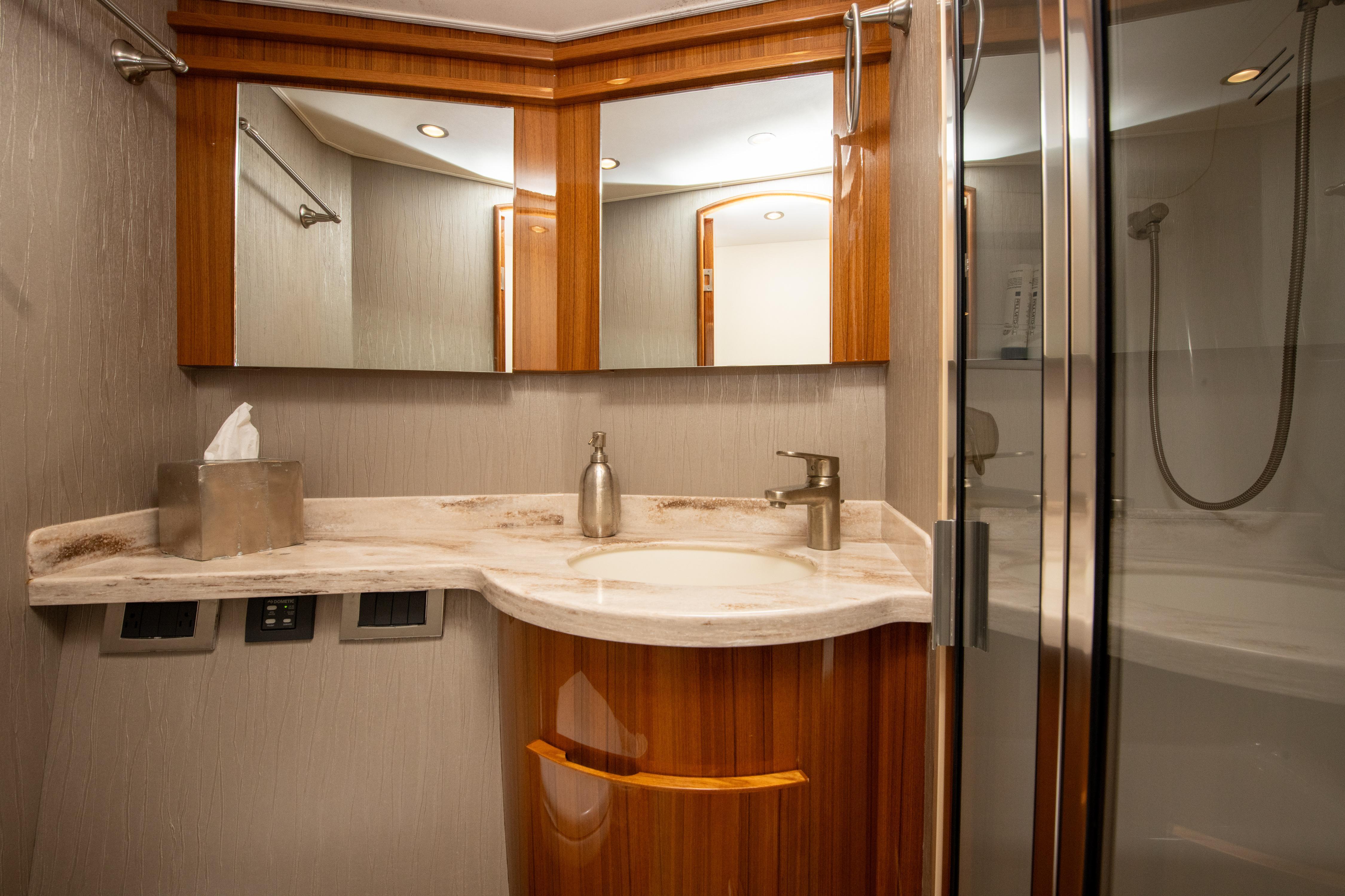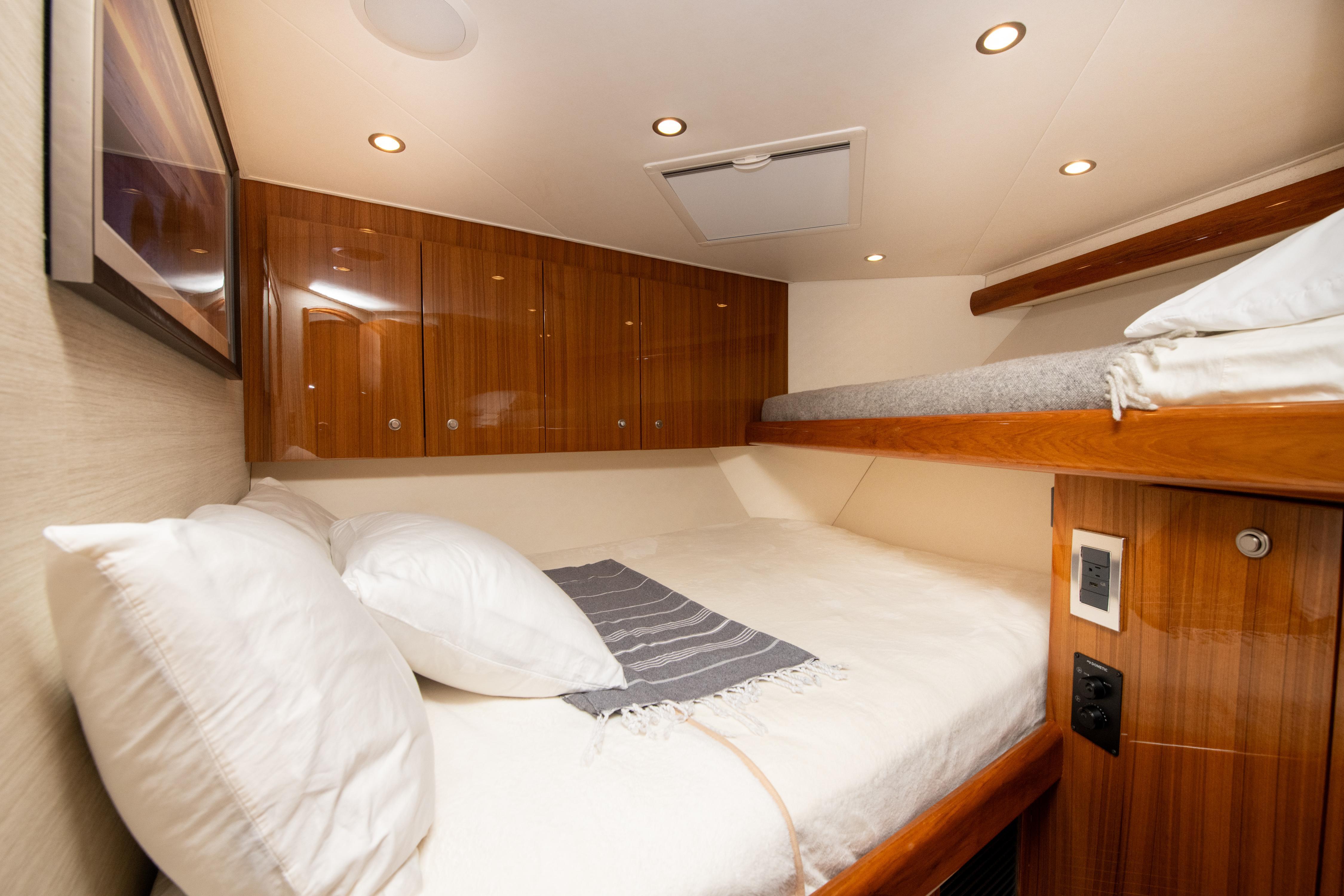The forward stateroom has a double and a single berth in an over and under crossover arrangement. A second head and shower serve this stateroom. The head also has a vanity with a Corian countertop and Amtico flooring.