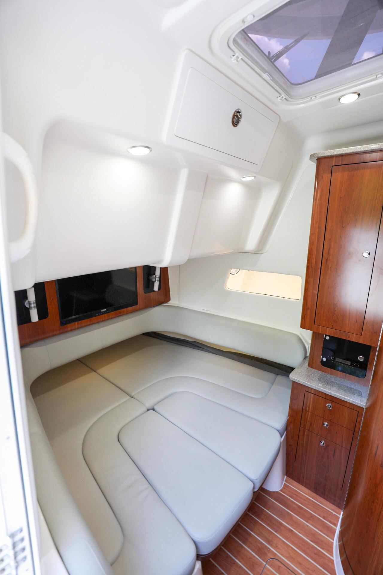Console InteriorCO Detector Courtesy LED Lights Bilge High Water Alarm Sleeping Accommodations for Two with Reading Lights Galley with Refrigerator, Microwave, Sink, Inductive Cooktop, and Cabinet Storage Cherry Dining Table with Seating for Four Air Conditioner Onan 7.5kW Diesel Generator 28” 12V LED TV with AM/FM/CD/DVD Player