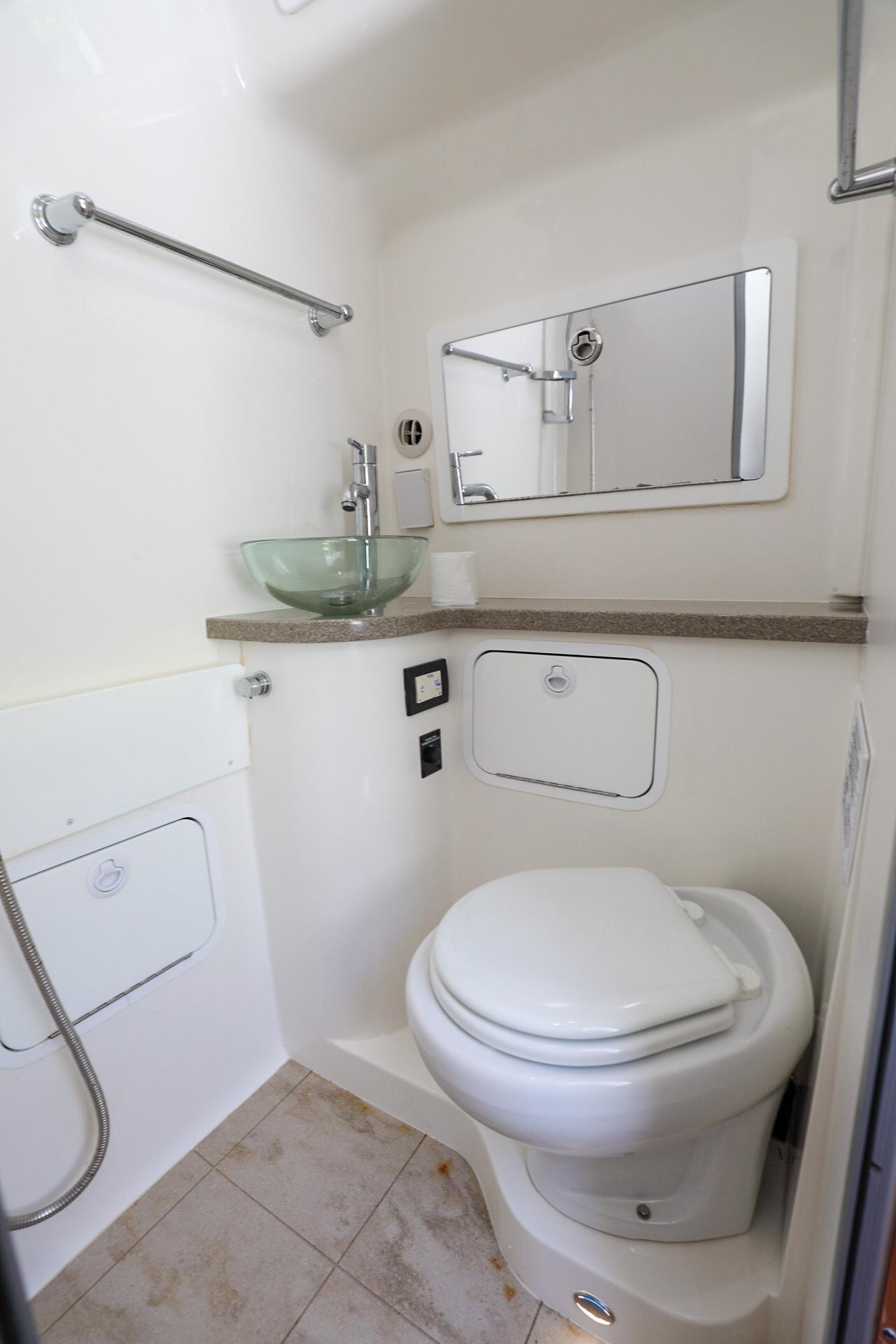 Head InteriorElectric Head with 13 gal. Holding Tank Stand-Up Head Compartment with Countertop, Sink with Hot Water and Cabinet Storage, Interior Lighting, and Mirror Hot Water Shower and (2) Towel Racks Vented Port Light