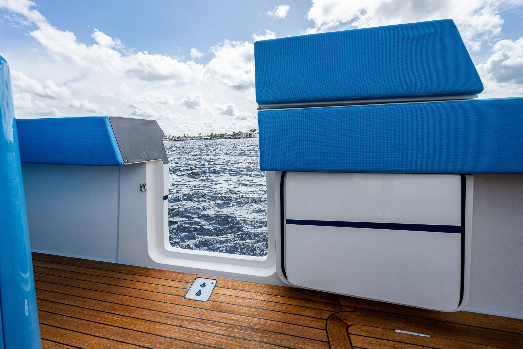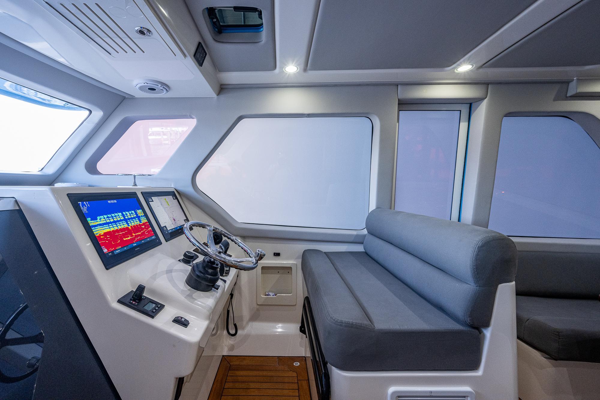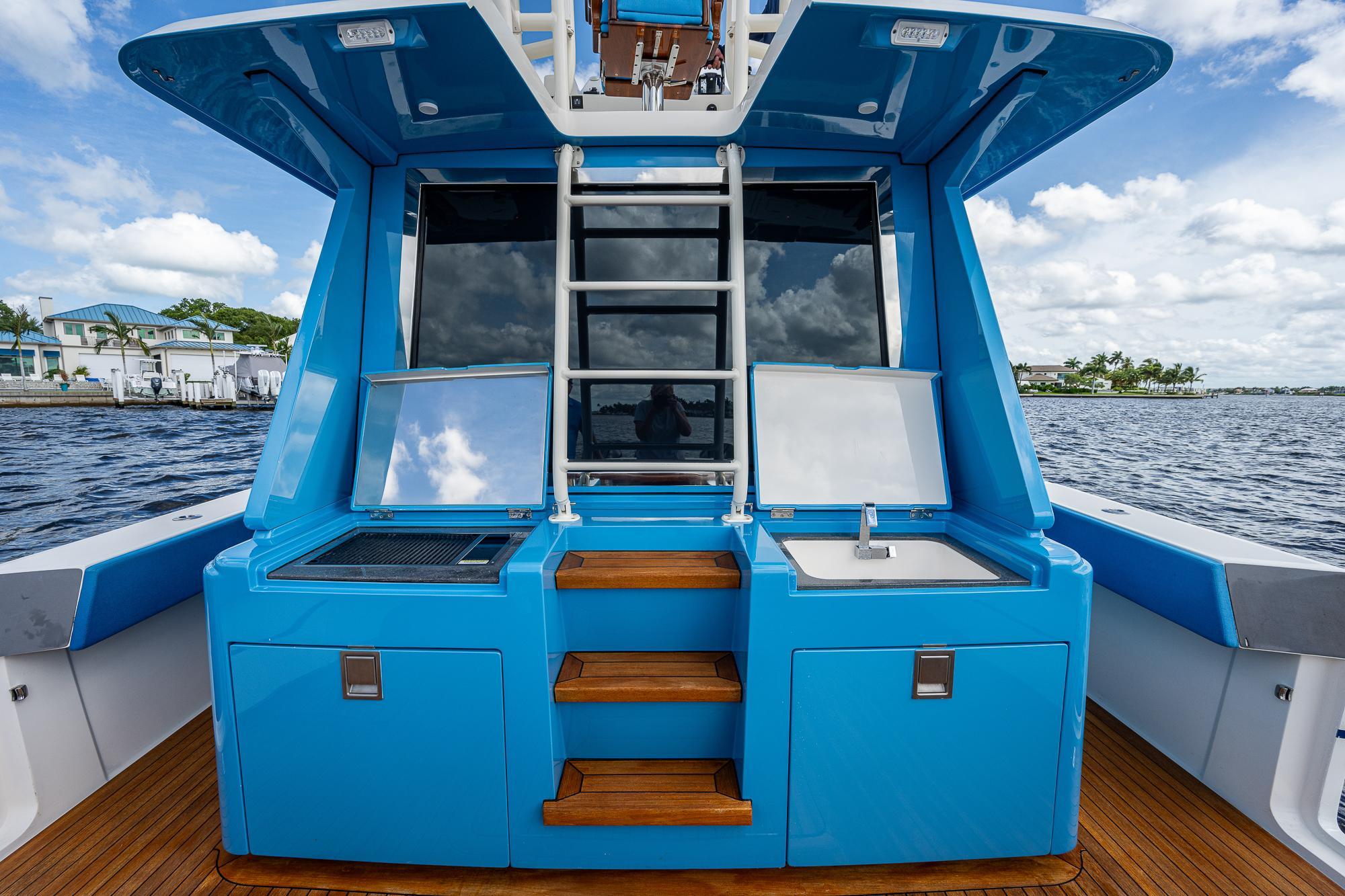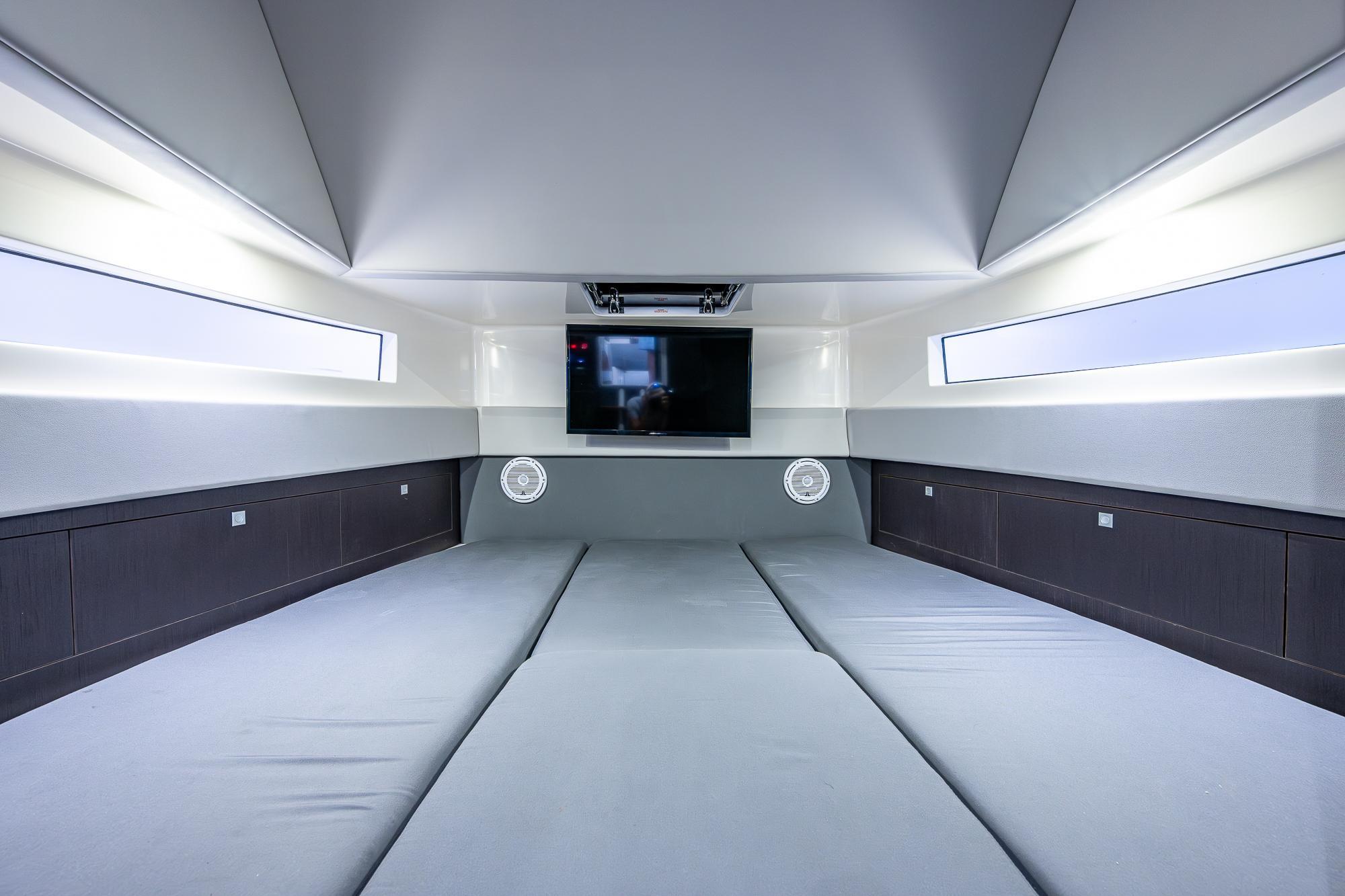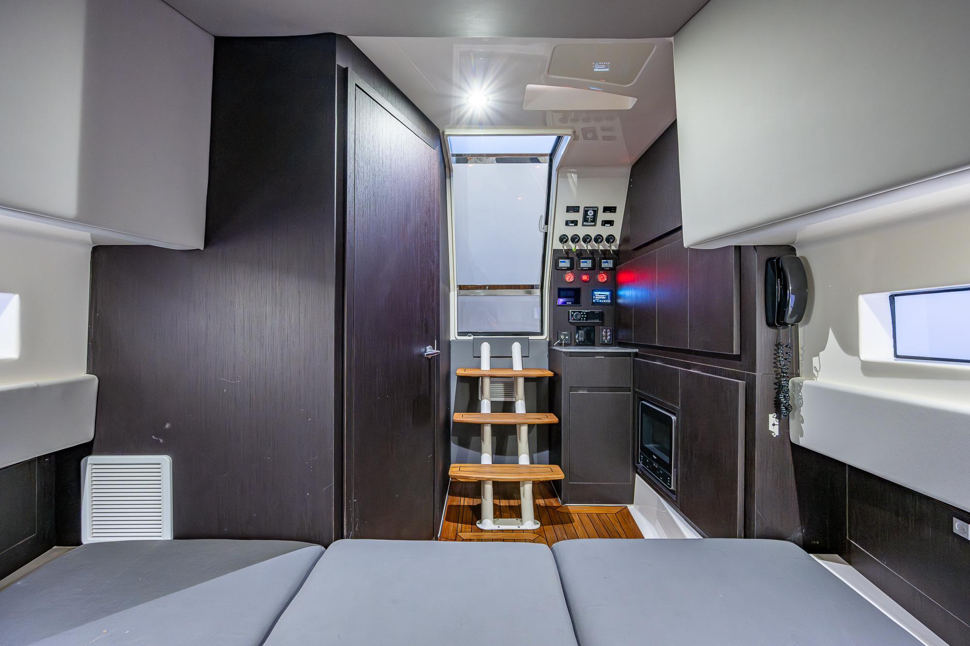 The lower cabin of the 52 can be reached from the upper salon without ever having to venture outside so that you can remain protected from the elements for hours at a time if desired. Once below, you will find a comfortable seating area that converts to either a king size bed or two single beds, along with a restroom and a shower. There is also a partial galley with a microwave, coffee bar, and refrigerator to complement the larger outdoor galley up in the cockpit. It’s the perfect place to make a quick sandwich or grab a cold drink when you don’t want to head outside. Rather than including a small second stateroom in the lower cabin, the 52 takes advantage of the air-conditioned upper salon to provide a spacious additional sleeping area. The large table in that upper salon quickly and easily lowers to convert the seating area to a queen size bed. Our electronic switchable glass option provides privacy for the space with the touch of a button and also allows you to turn the entire back window into a massive movie screen.