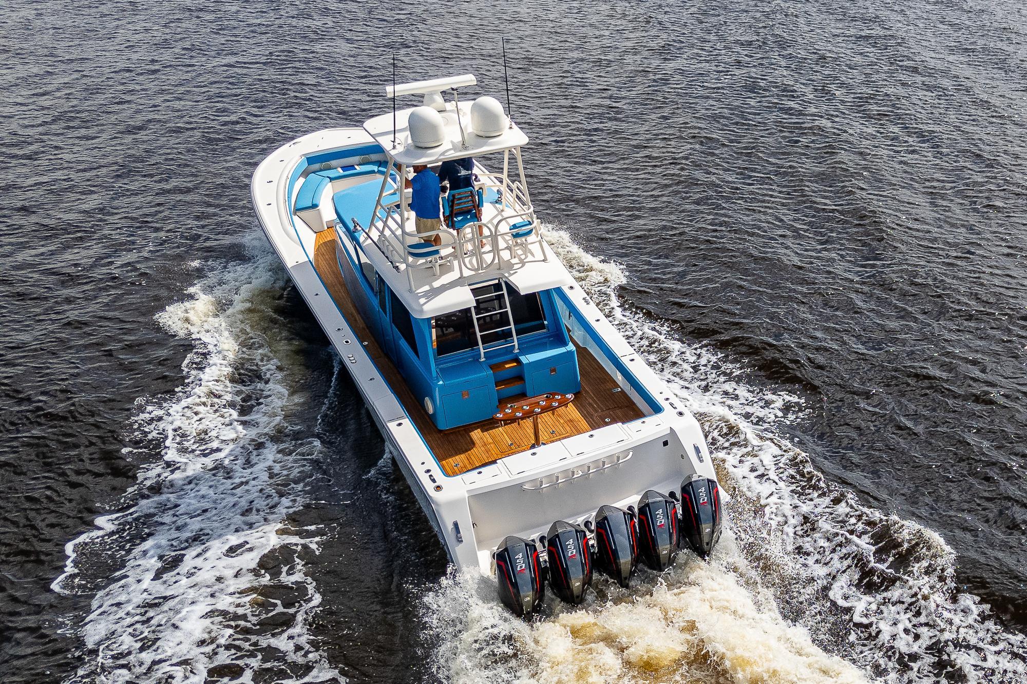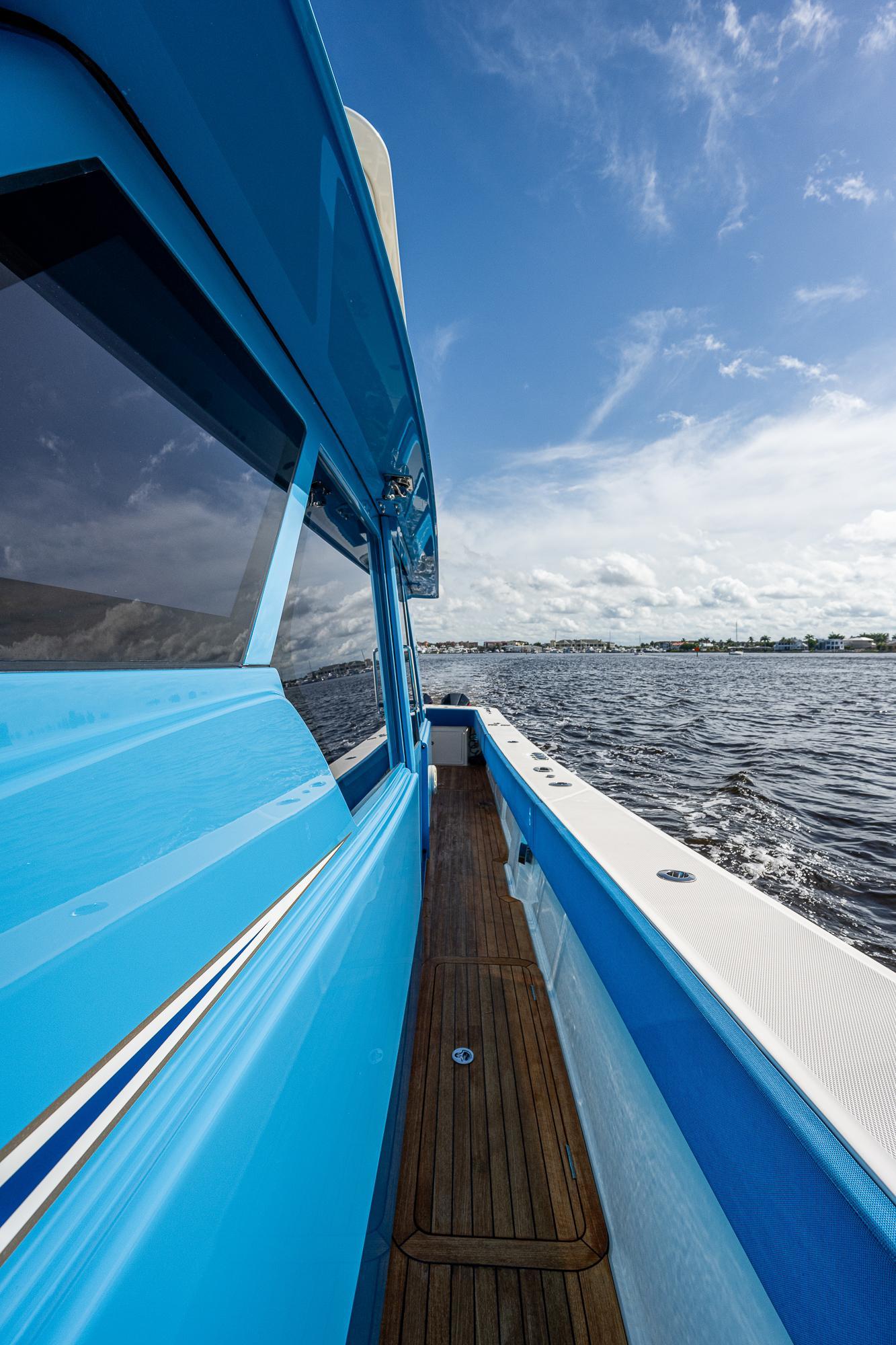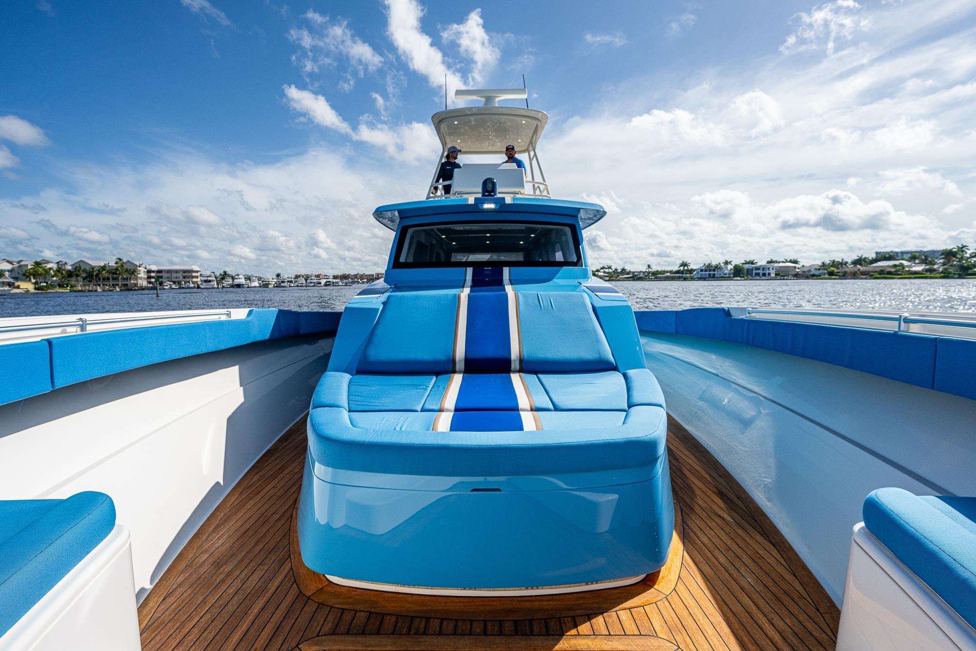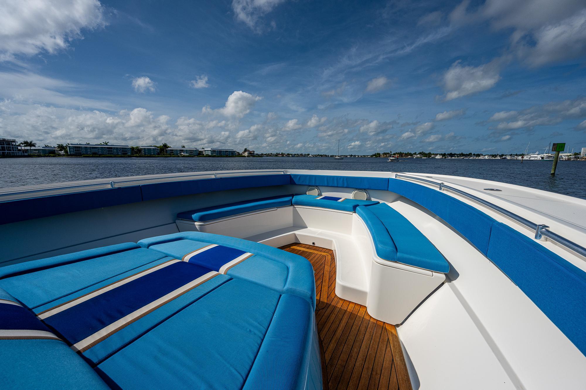 We have always found that passengers prefer to spend the majority of their time on the main deck, especially while underway, so a key element of the 52's design was to place as much of the overall square footage as possible on that deck level. The massive cockpit, huge sunpad, and forward seating area offer ample open-air space when the weather is nice while the climate-controlled upper salon provides a welcome retreat when you want to escape the elements. The cockpit includes a refrigerator, freezer, grill, sink, and ice maker which, combined with the included diesel generator, enables the boat to be completely self-sufficient so that you can easily spend a few nights aboard at a remote island. The salon and helm area features a large seating area with a table where passengers can sit and enjoy the scenery without impeding the captain’s ability to use either of the two side doors to move about the boat freely. While the glass enclosure provides outstanding protection from heat, cold or rain, customers tell us that the thing they appreciate the most is the fact that there is no wind fatigue even after running at high speed for long periods of time.
