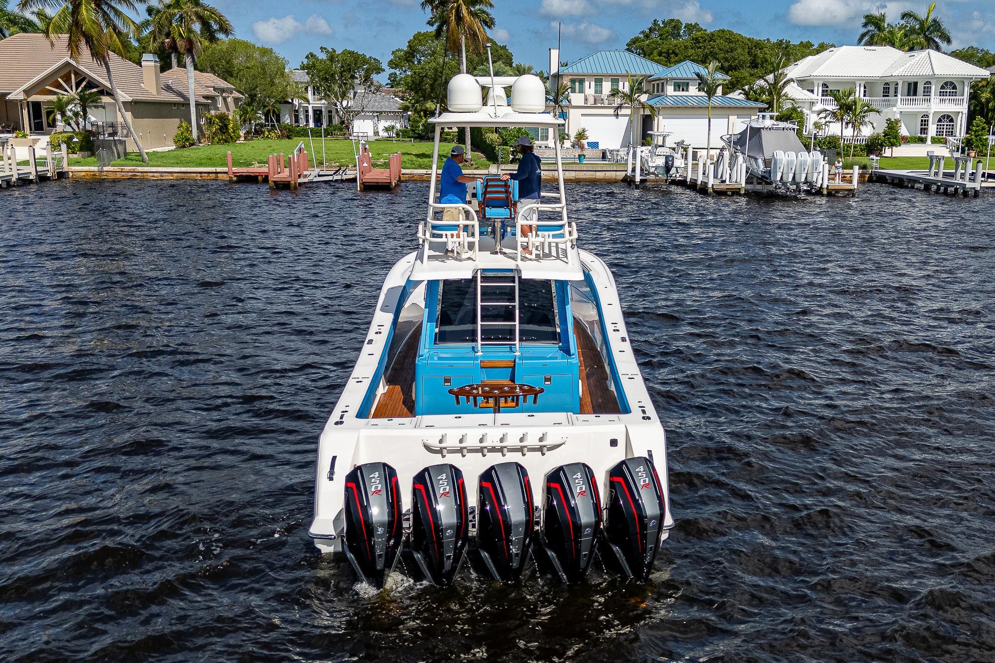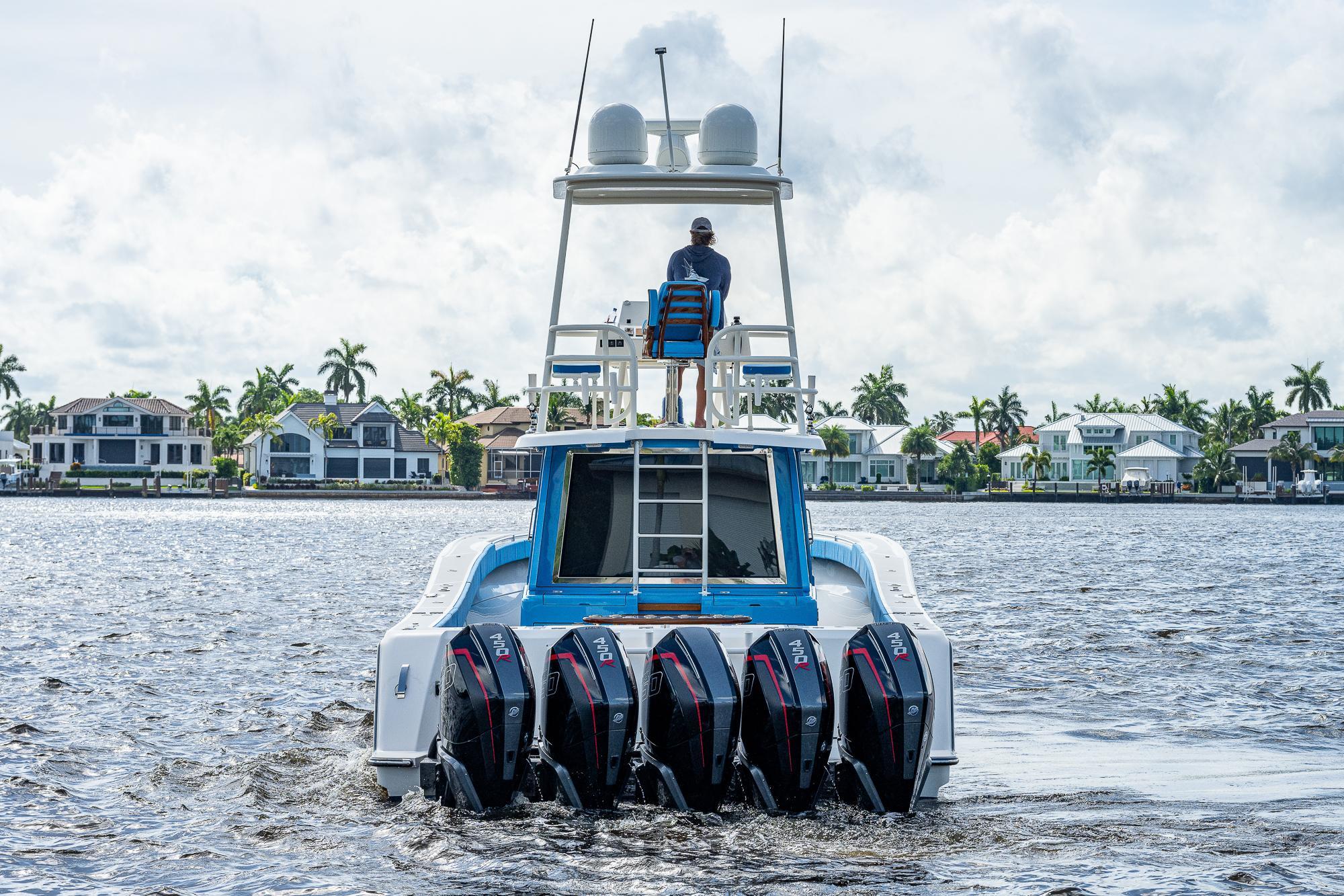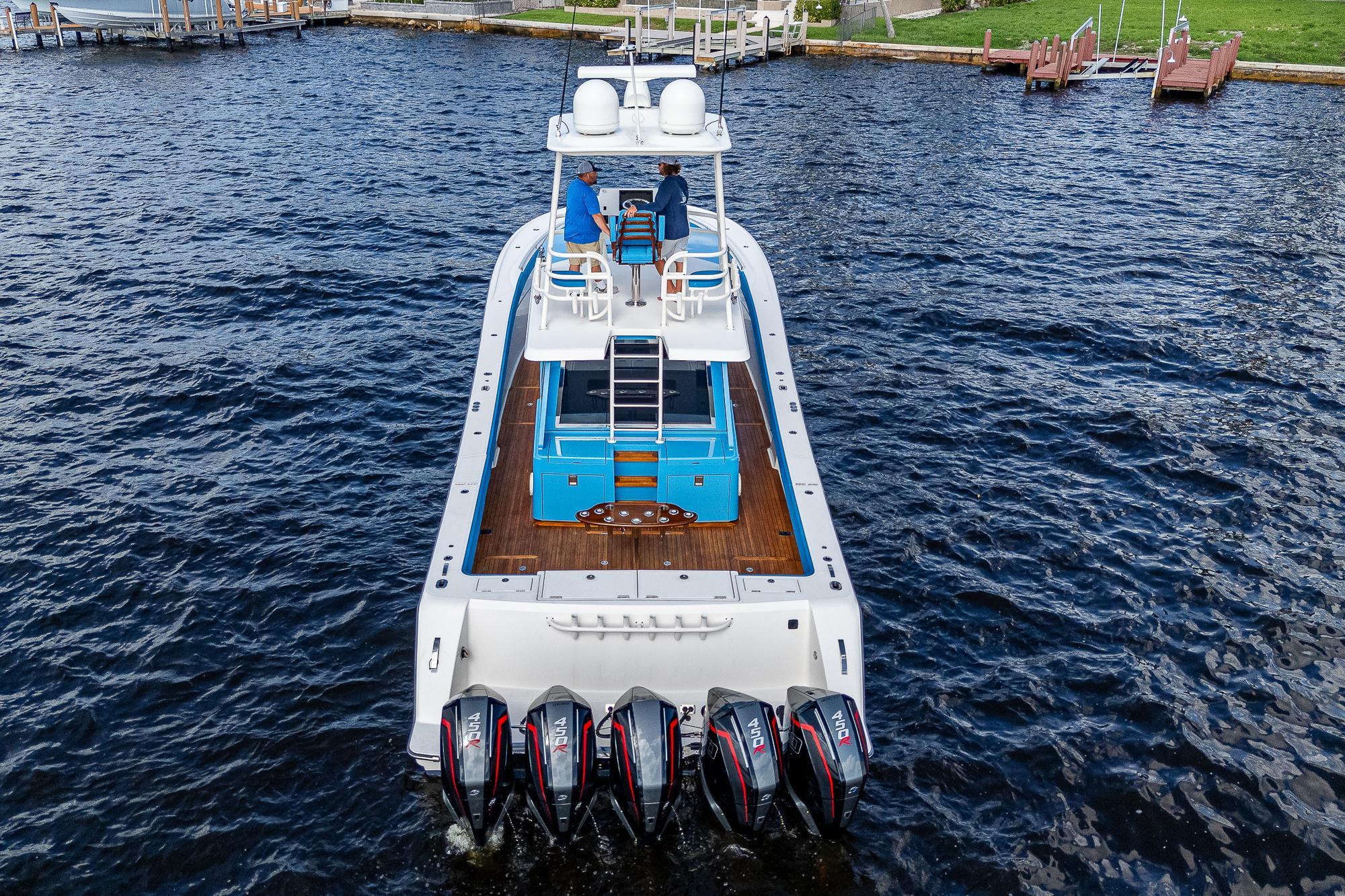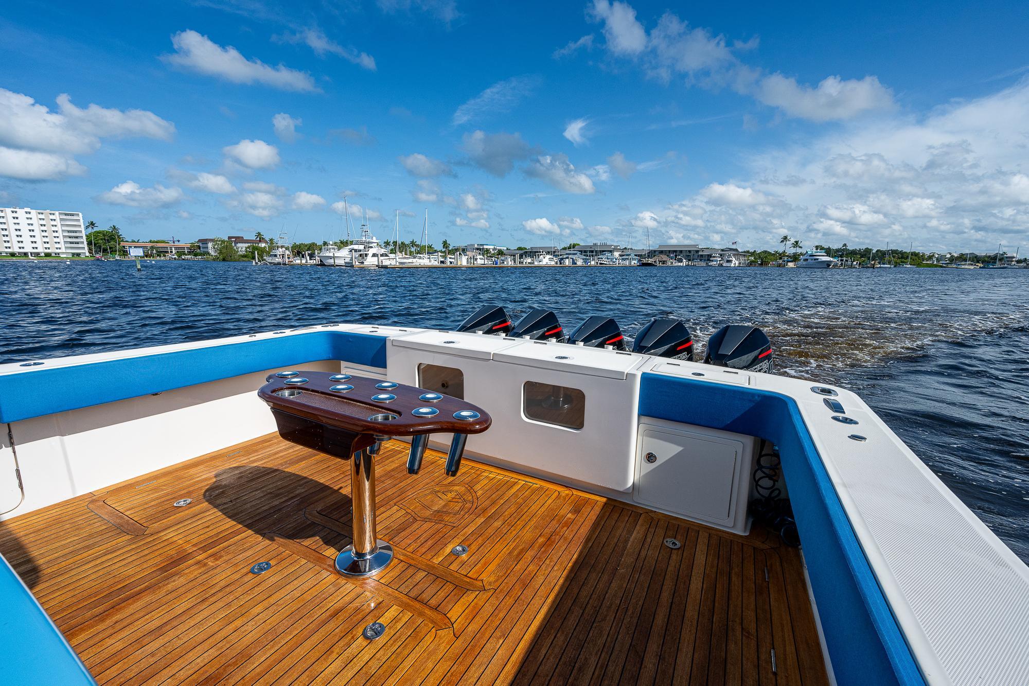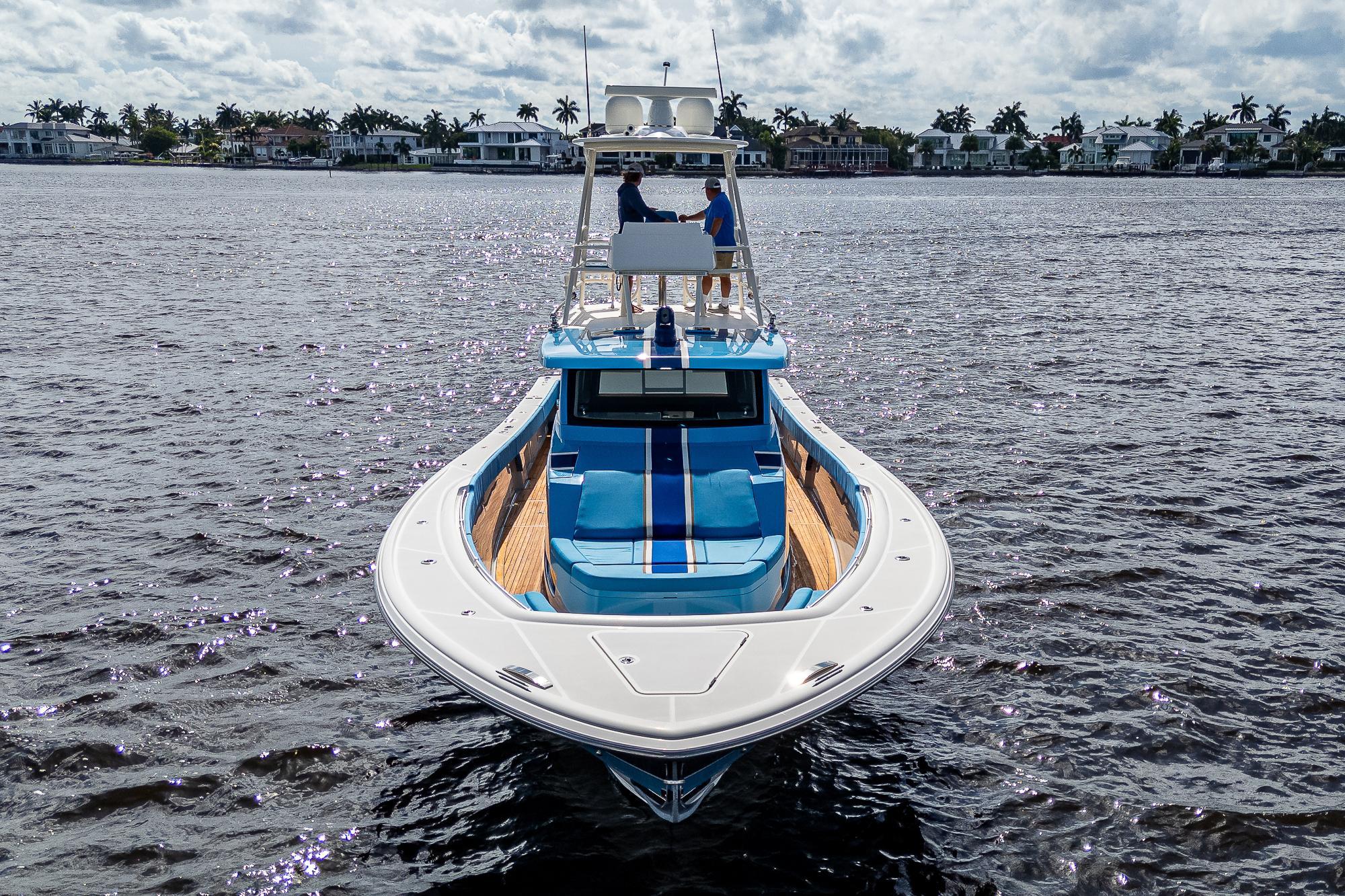 We have always found that passengers prefer to spend the majority of their time on the main deck, especially while underway, so a key element of the 52's design was to place as much of the overall square footage as possible on that deck level. The massive cockpit, huge sunpad, and forward seating area offer ample open-air space when the weather is nice while the climate-controlled upper salon provides a welcome retreat when you want to escape the elements. The cockpit includes a refrigerator, freezer, grill, sink, and ice maker which, combined with the included diesel generator, enables the boat to be completely self-sufficient so that you can easily spend a few nights aboard at a remote island. The salon and helm area features a large seating area with a table where passengers can sit and enjoy the scenery without impeding the captain’s ability to use either of the two side doors to move about the boat freely. While the glass enclosure provides outstanding protection from heat, cold or rain, customers tell us that the thing they appreciate the most is the fact that there is no wind fatigue even after running at high speed for long periods of time.