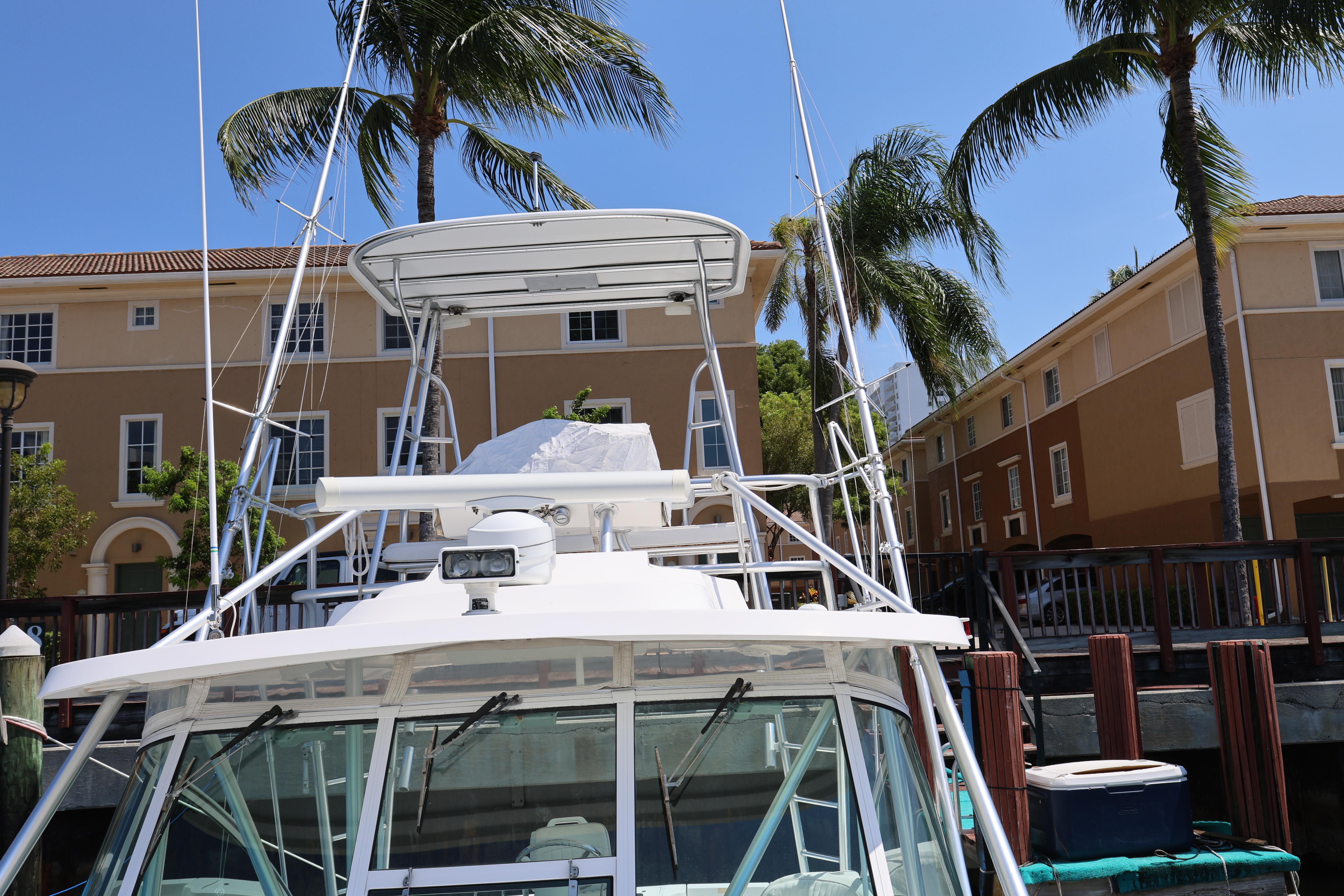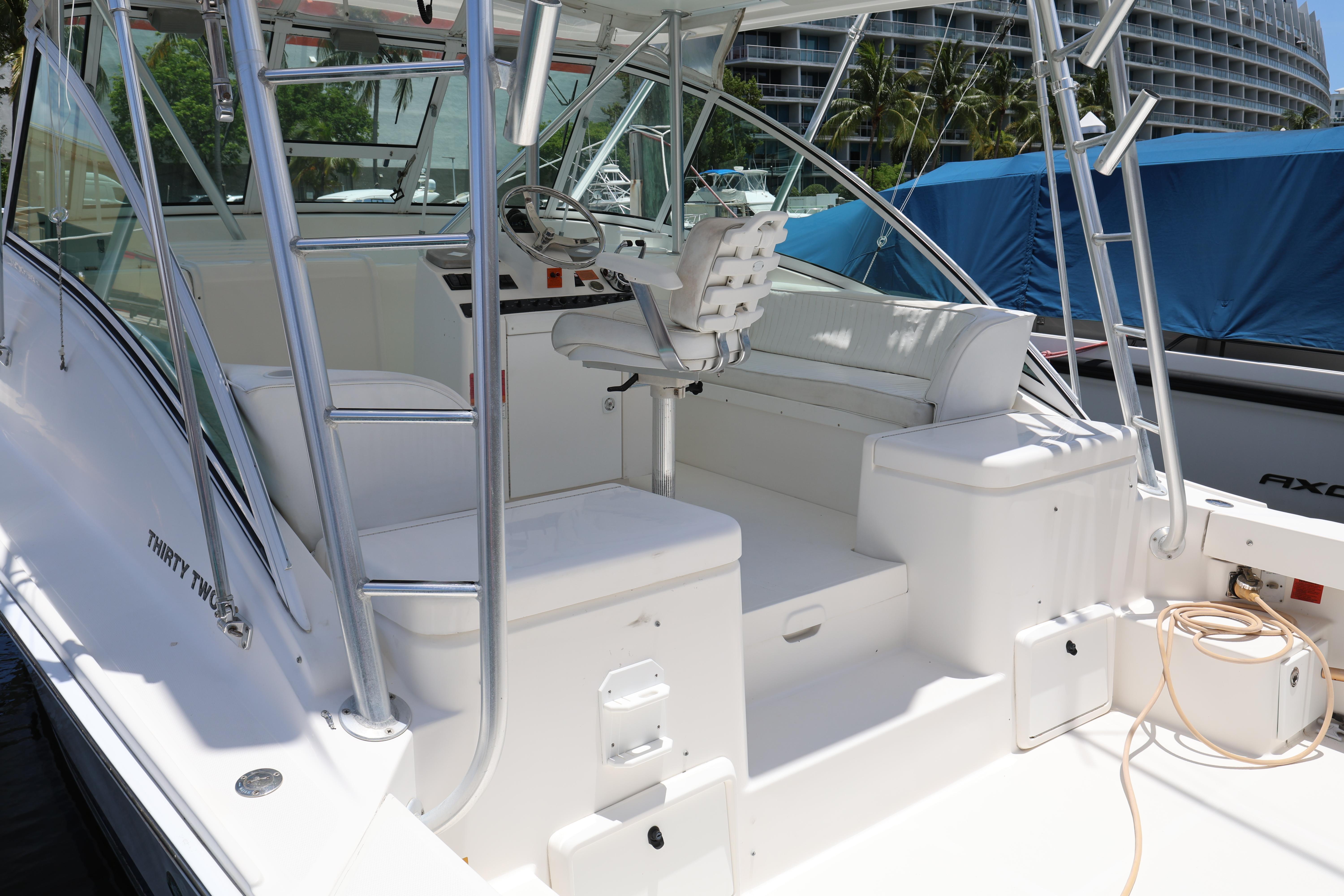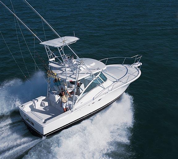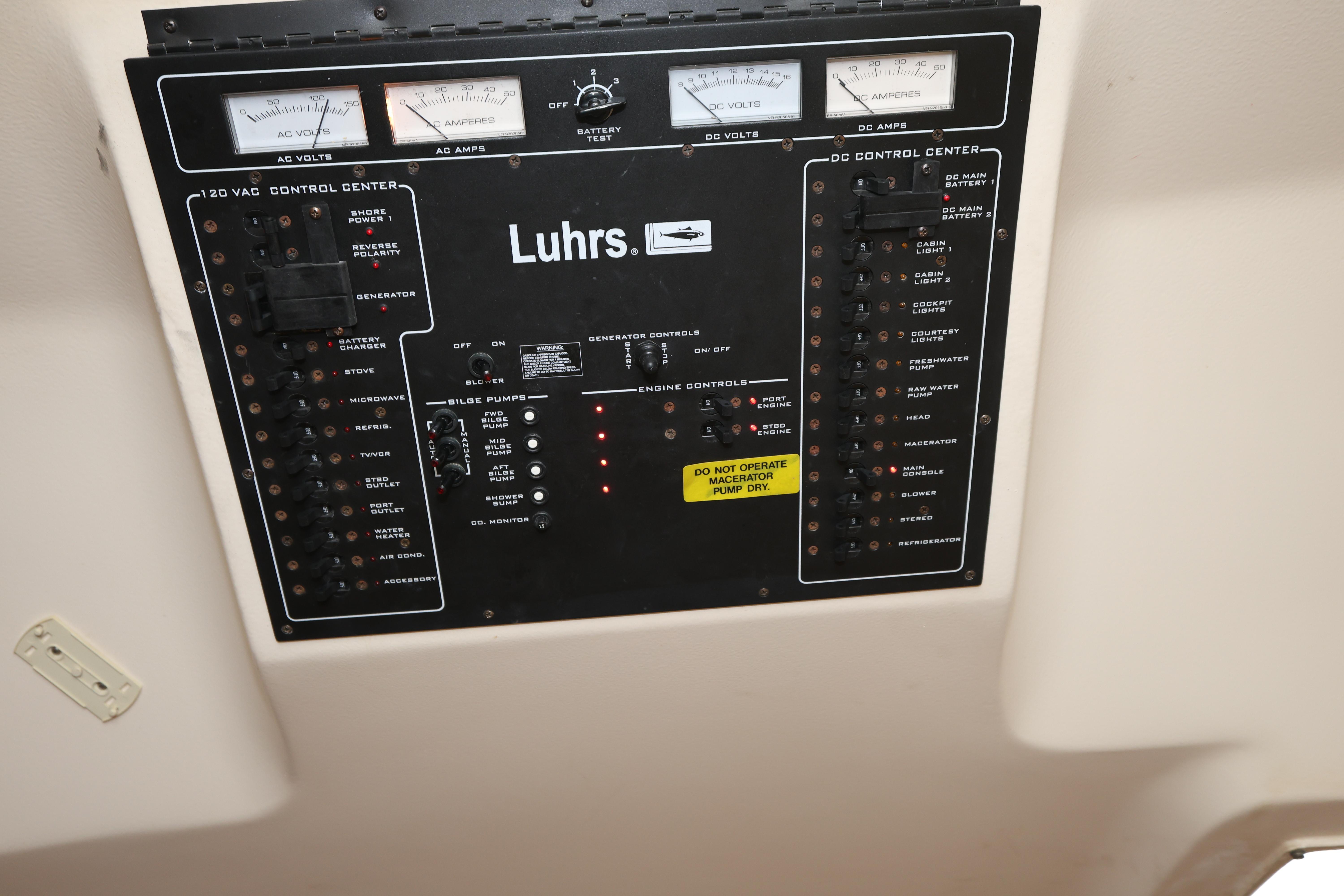 The Luhrs 320 Open has a deep forefoot and a Carolina flair to break up the head seas while still keeping passengers dry and comfortable on those long trips offshore. The Deep-V hull runs true in all conditions and is stable in the troughs. A true center console, the 320 makes shorthanded fishing a snap. Access to the cockpit is safe and quick while visibility is excellent on all points. There is plenty of space for all electronics and storage for PFD's, tools, and tackle are plentiful on the bridge deck. The 320 Open comes complete with a fiberglass custom hardtop, and easy access Fish tower with extra wide seating and full instrumentation... Everything from the tackle drawer's to the transom door are standard on the Luhrs. Features like the livewell, dual washdowns, rod holders bait prep centers and even a coaming fishbox are also standard. The interior of the 320 features rich fabrics and fine hard woods accented by durable, yet beautiful Corian and plush carpeting. The forward V-berth doubles as a dinette and the starboard settee flips up and slides out to offer a double berth below with a single above. Galley accommodations include a range, dual voltage refrigerator/freezer and microwave. The full-fiberglass head with shower is large and easy to maintain with a Corian counter and plenty of storage