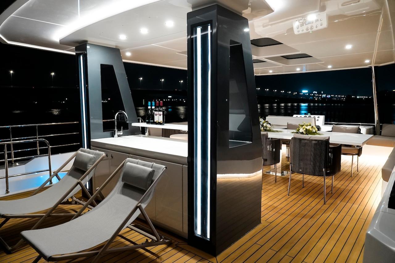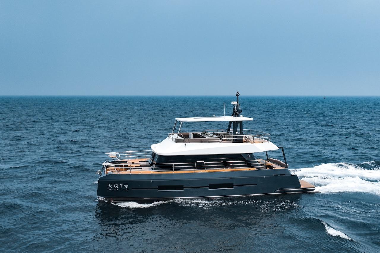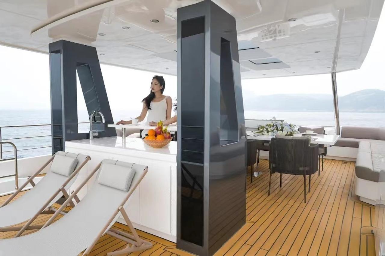 A chic yet robust tomahawk silhouette and a steadfast vertical bow, the EF56 catamaran cruises majestically across the water, accentuated by its grand elongated portholes. It elevates luxury through its innovative spatial design.