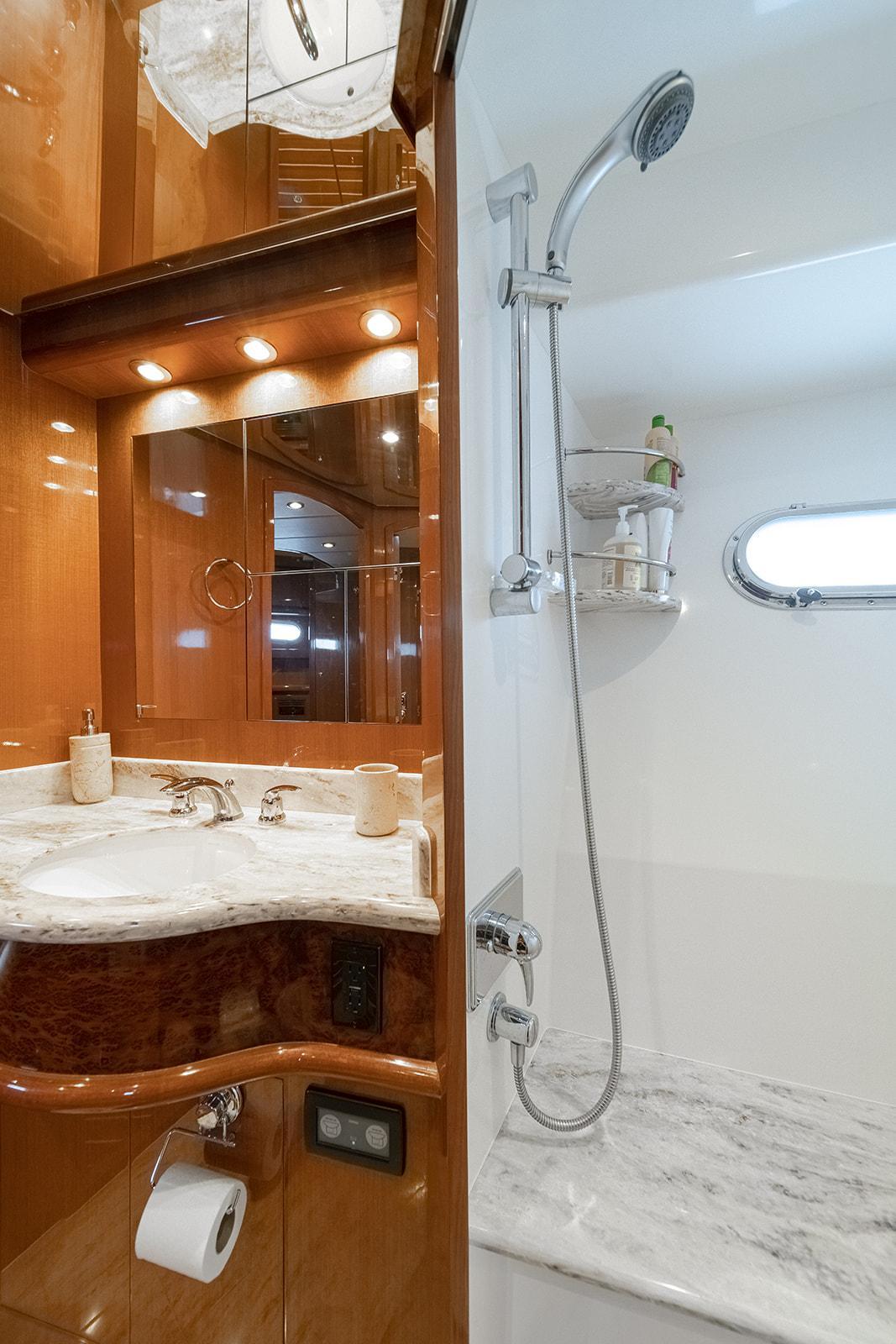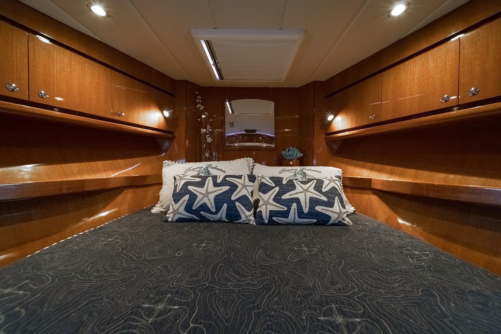 The VIP stateroom greets your guest with a queen-sized island pedestal bed and custom mattress, bedding and pillows, storage drawers and large separate storage compartments below, custom mirrored headboard, gloss finish handcrafted custom contemporary panel Makore cherry cabinetry with latching chrome cabinet, drawer and door hardware, custom headliner and wall fabrics, chrome lighting fixtures, soft indirect lighting above the entry ceiling feature, reading lights at each side above the nightstands, custom carpet flooring, cedar-lined hanging clothes locker, private entrance to the well-appointed guest head with vanity and shower, custom mirrored ceiling feature, opening portlight, storage, 110VAC outlets, custom marble counter and floor. Large volumes of natural light and fresh air are brought in through the port and starboard stainless steel latching, screened portlights, with custom shades for privacy, and over the bed opening deck hatch with screen. Entertainment features include a wall mounted Samsung TV. Climate control comfort is provided by chilled water air conditioning with a reverse cycle heat outlet. Multiple ll0VAC outlets provide on demand power.
