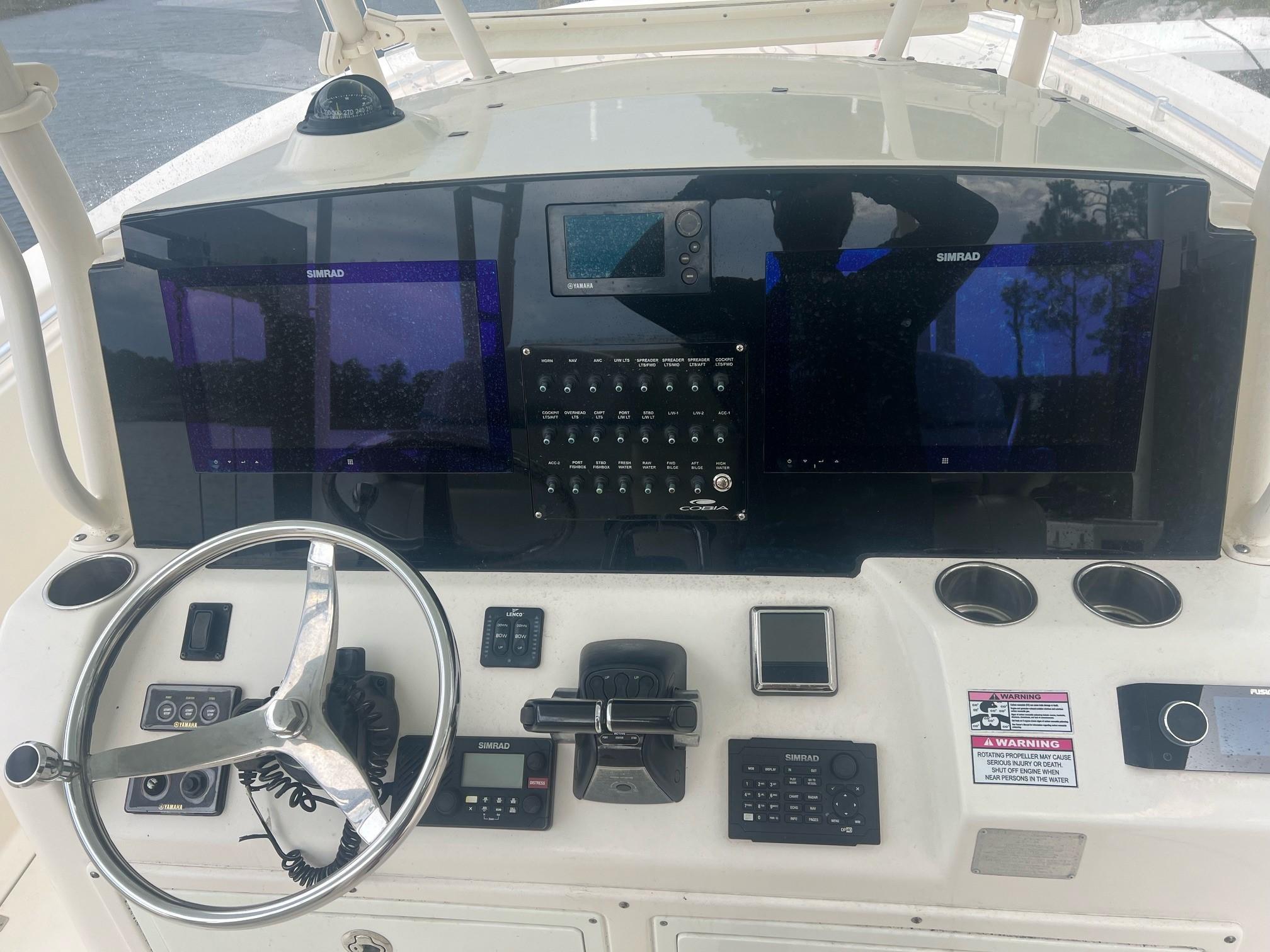 2015 COBIA 34.4 CENTER CONSOLEUPDATED 16" SIMAD 2019TROLLING MOTOR AND TRAILER INCLUDED970 HOURS ON TRIPLE YAMAHA 300'STHIS BOAT IS READY TO GO!The Cobia 344 is a tournament-grade angler whose comfortableseating and family-friendly amenities rank her among the moreversatile boats in her class. Built on a double-stepped hull withhigh freeboard and a level deck, the 344 blends performance andcomfort in a surprisingly affordable package. The Cobia brand haslong been identified with value pricing, providing a durable, wellbuiltboat for thousands less than many competitive models. Thewide 11'2" beam offers plenty of elbow room even with a crowdonboard. The bow features a modular seating area that convertsto a sun pad or six-person dinette thanks to a table that rises fromthe deck. Though the 344 boasts a console berth and seating for10–12 passengers, she’s fully fish-ready for the serious anglerwith below-deck locking rod storage, twin 42-gallon baitwells, andtwo large macerated in-floor fish boxes. The leaning post/tacklestation has a sink and bait prep area as well as a rear-facing seatfor watching baits when trolling. The head compartment includesa marine toilet and sink in addition to the aforementioned berth. Afast ride, triple Yamaha F300s top out at nearly 60 knots.2015–19Cobia 344 Center Console