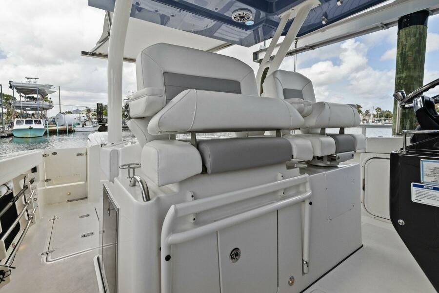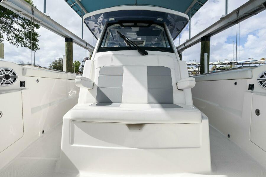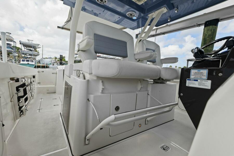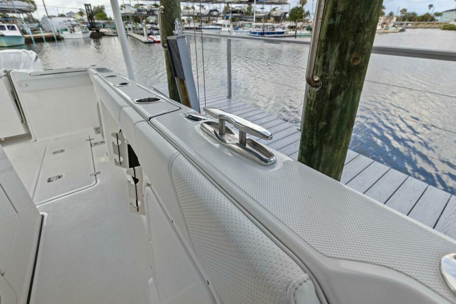 Hardtop & Windshield FeaturesMolded Fiberglass Full Beam Hardtop Powder Coated Aft Structural Hardtop Supports Custom Windshield System with Tempered Glass and Electrically Actuated Center Vent Pantographic Windshield Wiper with Washer Custom Stainless Steel Ratcheting Anchor/Stern Light with Burgee Rings and USA Flag Four (4) Tri Color LED Lights Indirect Lighting Over Dash Fore and Aft Facing Spreader Lights 316L Stainless Steel Underside Grab Rails Integrated Stereo Speakers (4) 24"x24" Hardtop Acrylic Access/Ventilation Hatch Molded Overhead Electronic Mounting Surface Fiberglass Hardtop with Dedicated Radar, Antenna and Outrigger Locations Horn, Trumpet