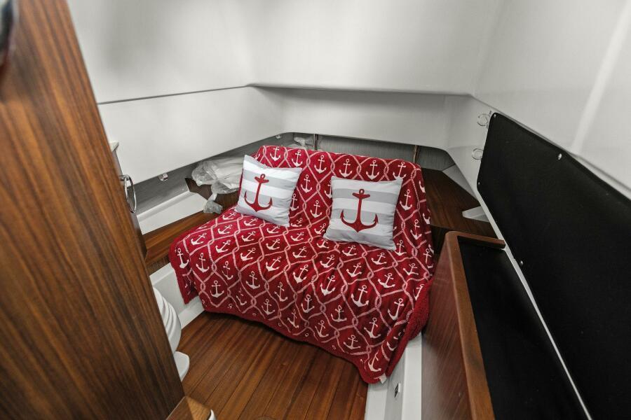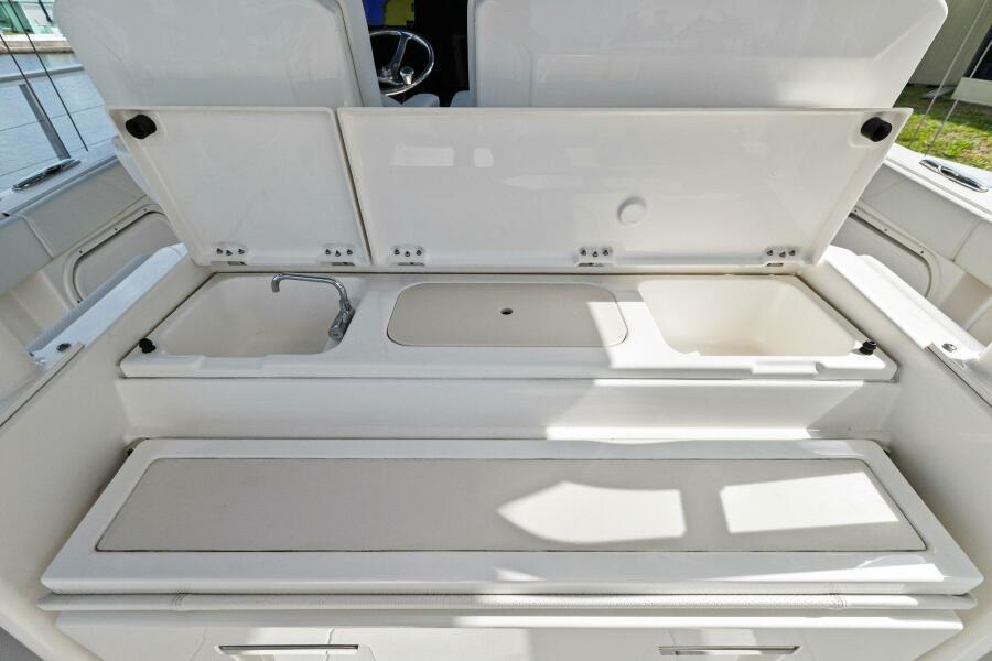 Console & HeadMolded Acrylic Access Door with Gasket and 316L Stainless Steel Locking Latch Cabin Entry Steps with Handrail and Wood Treads Molded Cabin Deck Liner Vacuum Flush Marine Head with 10 Gallon Holding Tank, Macerator Discharge Pump, 316L Stainless Steel Deck Pump-out Fitting and Bronze Thru Hull Fitting with Seacock Fiberglass Toilet Seat Cover Designer Sink with Corian® Countertop, Fresh Water Faucet and Vanity Mirror Dedicated Storage for Four (4) Rods, SCUBA Tanks, and Safety Gear Two Switch Panel with Overhead LED Lights (2) LED Floor Accent Light (1) Convertible Berthing Accommodations/Seating with Cushions Custom Solid Wood Tongue and Groove Floor Accents 120V Main Distribution Panel Cabinet 316L Stainless Steel Opening Port Lights (2) with Screens One 12V Outlet (1) and Dual USB Charger One 120V Outlet (1) with GFI Protection Fire Extinguisher CO Monitor