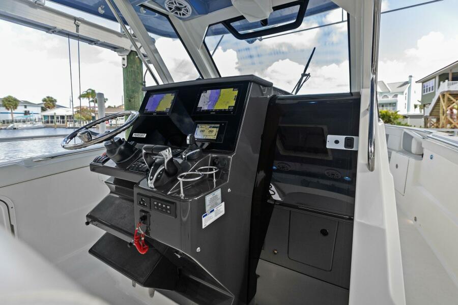 HelmMolded Fiberglass Aft Tilting Helm with Instrumentation Visor, Electronics Mounting Surface, Fold Out Fiberglass Footrest/Platform, and Safety Lanyard 316L Stainless Steel Steering Wheel with Control Knob and Non-Slip Grip on Sport Tilt Plus Helm 12V Panel with Illuminated Carling® Rocker Switches Compass Trim Tab Control Panel and Indicator Waterproof Stereo Remote with Full Function Display Two 12V Outlet (2) and Dual USB Charger 316L Stainless Steel Helm Drink Holders (2) Bow Thruster Joystick Control Helm Fire Extinguisher Dash/Instrument Cover