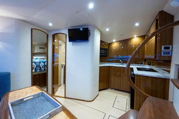 The galley in the Viking 42 Open sets the bar high for all other vessels in her class. With everything needed to prepare meals and ample storage. Plenty of countertop space is made available thanks to her wraparound seamless countertop with integrated freshwater hot/coldsink. All of the cabinetry is constructed from high gloss finish teak panels. On the aft bulkhead you will find the recessed 2 burner induction cooktop and ships’ AC/DC distribution panel above. Just below the aft countertop is the newly updated Nova-Kool refrigerator and freezer. Moving to the starboard side of the galley you will have plenty of storage in 3 overhead cabinets and just below is the freshwater sink. Continuing forward is the microwave and cutlery drawer as well as additional storage below. Maple Amtico continues throughout the galley.