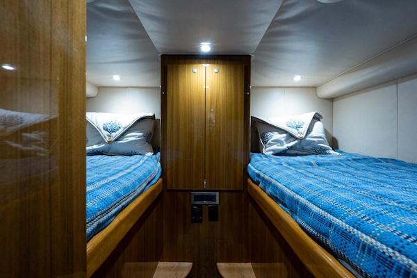 Twin single berths and a large custom built hanging locker as well as additional storage outboard. This stateroom makes the perfect accommodations for a family with kids or two couples. Continuing the upgrades this stateroom also has an upgraded Ostrich headliner, LED TV, DVD player and a carpeted sole.