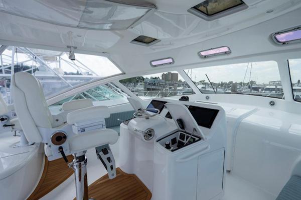 Functionality, style and comfort are the key elements that make up the Viking 42 open helm area.The most notable feature is the custom built hardtop which was raised 13" from standard. A custom fiberglass visor wraps around the front with (3) functioning vents and (2) additional Bomar hatches in the hardtop overhead. Immediately as you enter the helm area from the cockpit you are welcomed by the feel of the climate controlled panoramic space. To port is a refrigerated drink box and to the starboard is a matching insulated box. A large centerline walk-around helm with upgraded Furuno TZ Touch electronics, Zeus joystick controls, Palm Beach pod and full 360 degree visibility. Upgraded Stidd helm chairs and teak sole platforms accent the area.