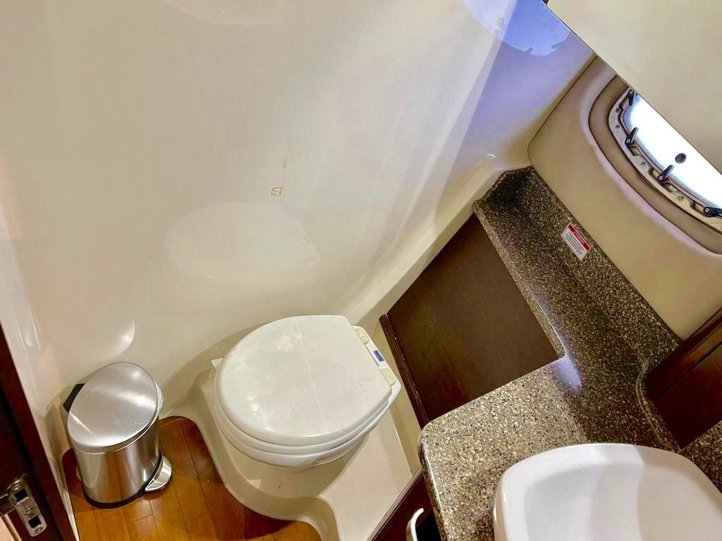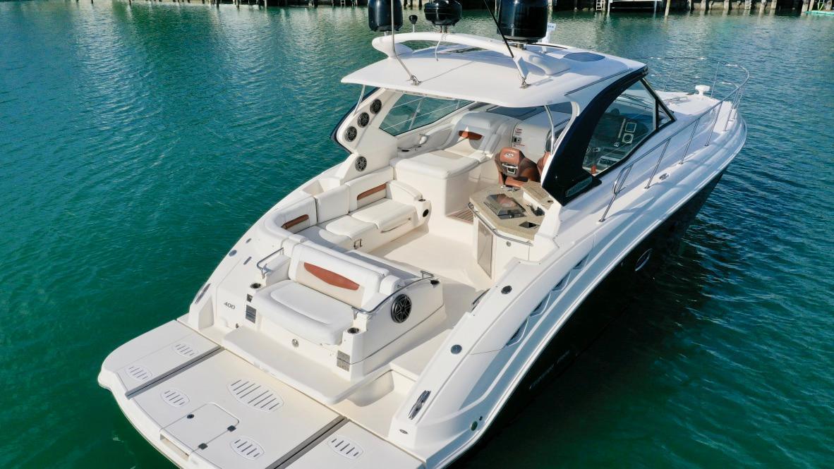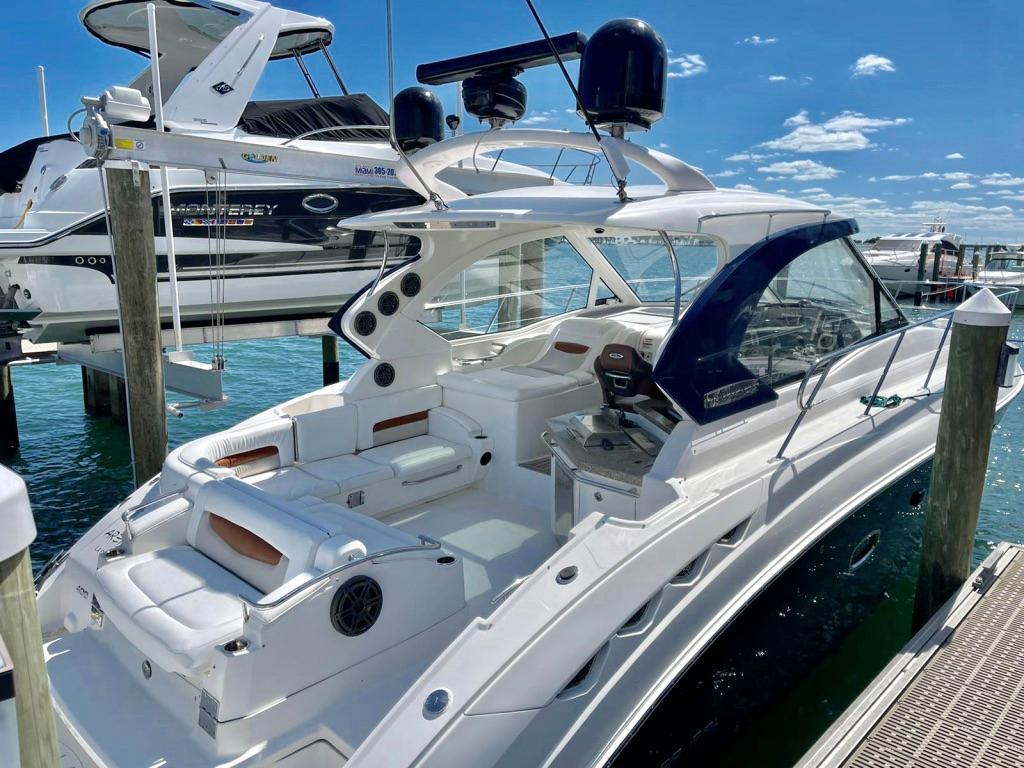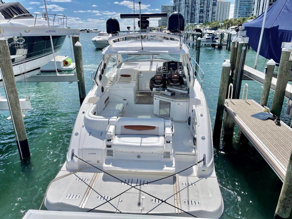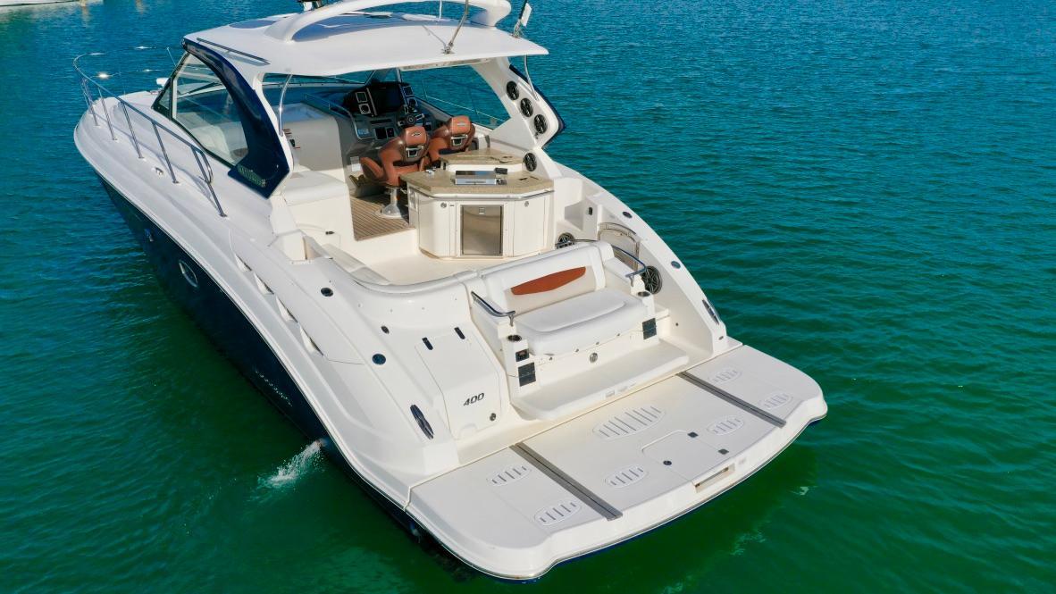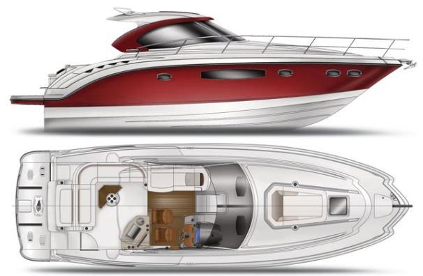 The heartbeat of the 400 is luxury. In every way. Just think of the things you can do at the mere flip of a switch: adjust the bucket seats, fold out the transom seat or retract the island berth. Options that work with fingertip control include a waterproof flatscreen TV in the galley, the sunroof and the swim platform. The Premiere's coupe design gives you climate control in the cockpit and the cabin. You never have to contend with canvas as you enjoy the quietest, most quality ride on the water today. Stainless steel steps lead to the finest engine room in this class. Brilliant white finished gelcoat creates a clean environment. Gray water is routed through a sump in the engine compartment, not under the cabin, minimizing the need for thru-hull fittings on the hull side.