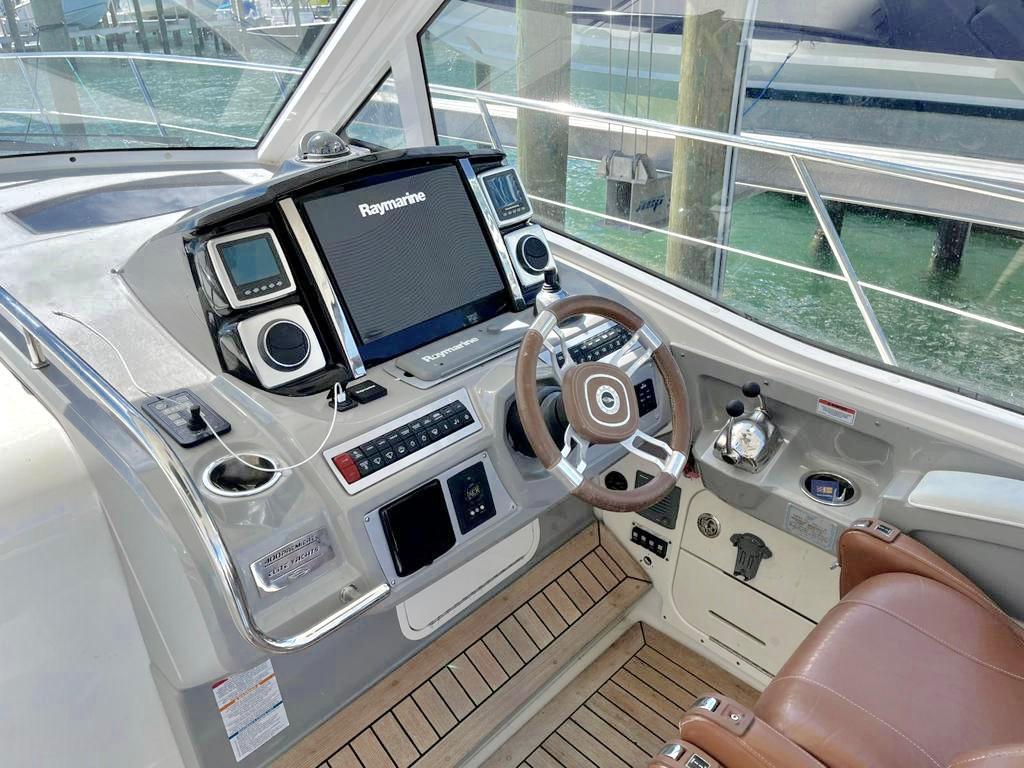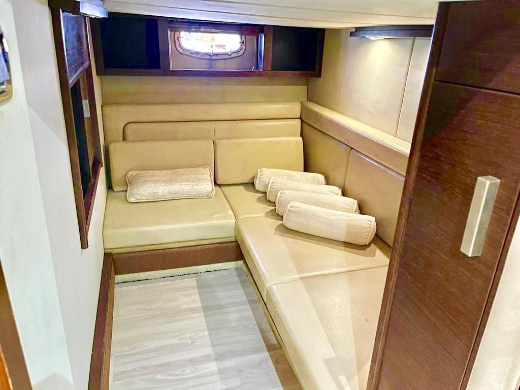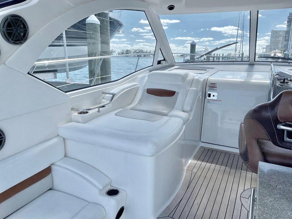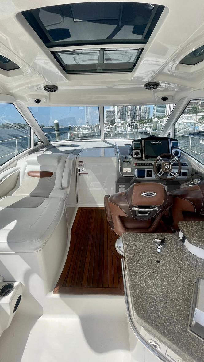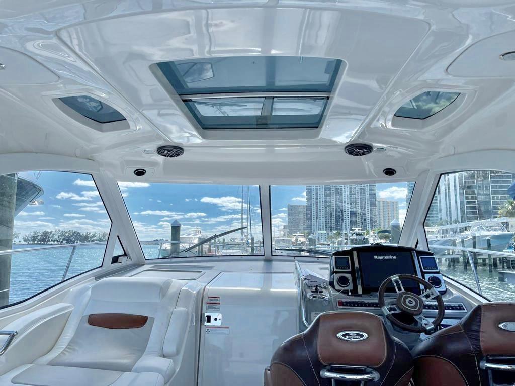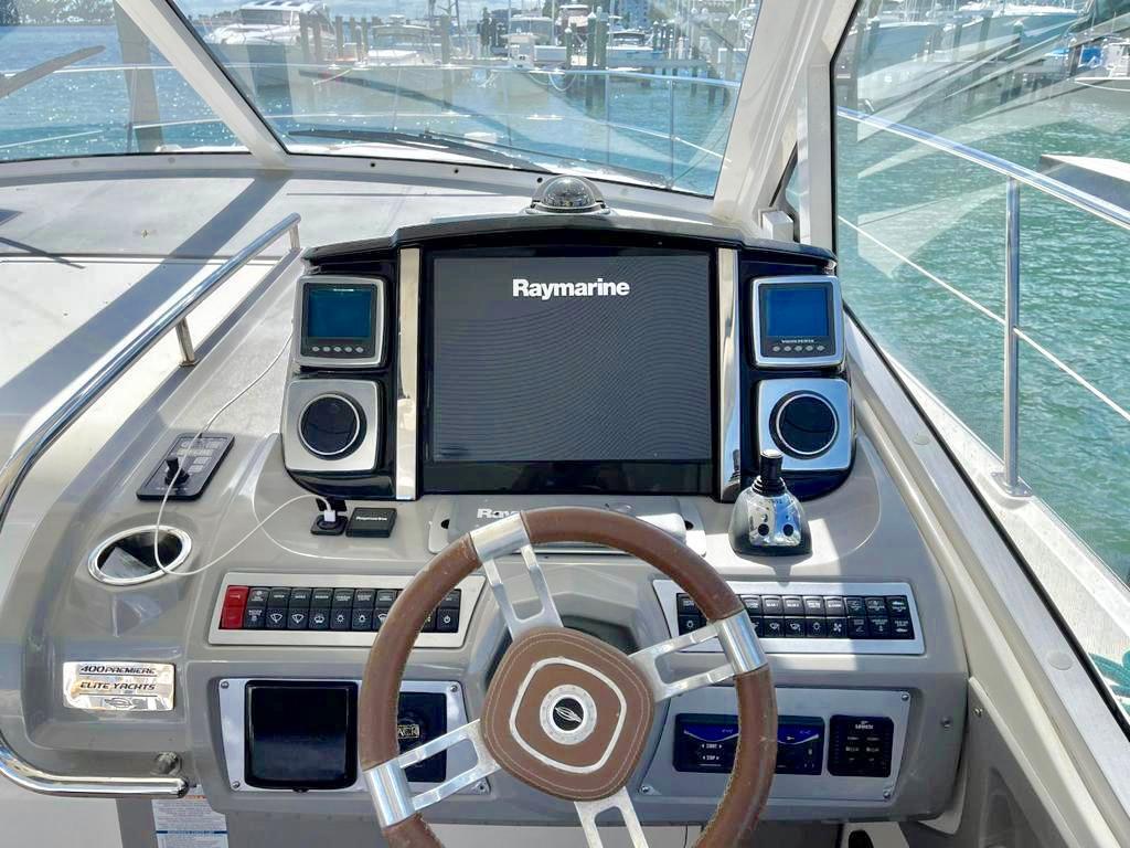 So innovative and luxurious, how do you categorize the 400? Express Cruiser won't do because no other 42-footer offers a coupe top, cockpit air conditioning or a hydraulic swim platform. Conversely, there isn't a yacht afloat that has the sporty style and incredible appointments accented throughout the 400 Premiere. Think of the 400 as old-world craftsmanship wrapped in its most modern form. From the incredible helm electronics, to the televisions, to the sound system, every component is beyond state-of-the-art. At the helm, prepare to discover the difference that makes the 400 Premiere like no other. Powered by a revolutionary IPS propulsion system, this wide beam Sport Yacht maneuvers as easily as our 20-foot bowriders. With it's intuitive Joystick control, even the most dicey docking situations are aim and go. When evening arrives, the excitement only increases with a full LED lighting system that sets the mood for dockside parties. In the cabin, we take full advantage of the possibilities our Wide Tech hull design unveils. Full length hull windows and overhead skylights provide a window to the world and allow natural light to come in.